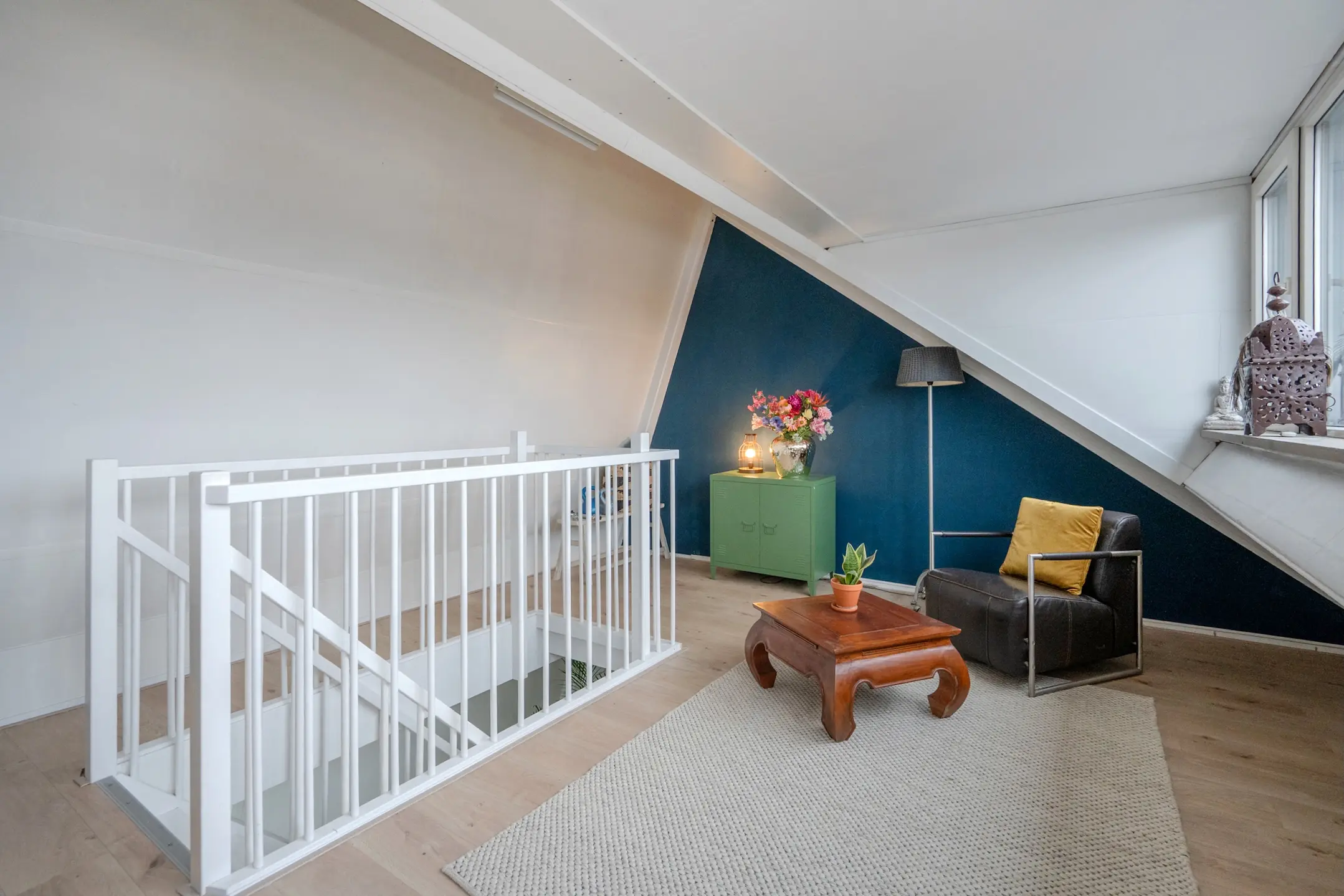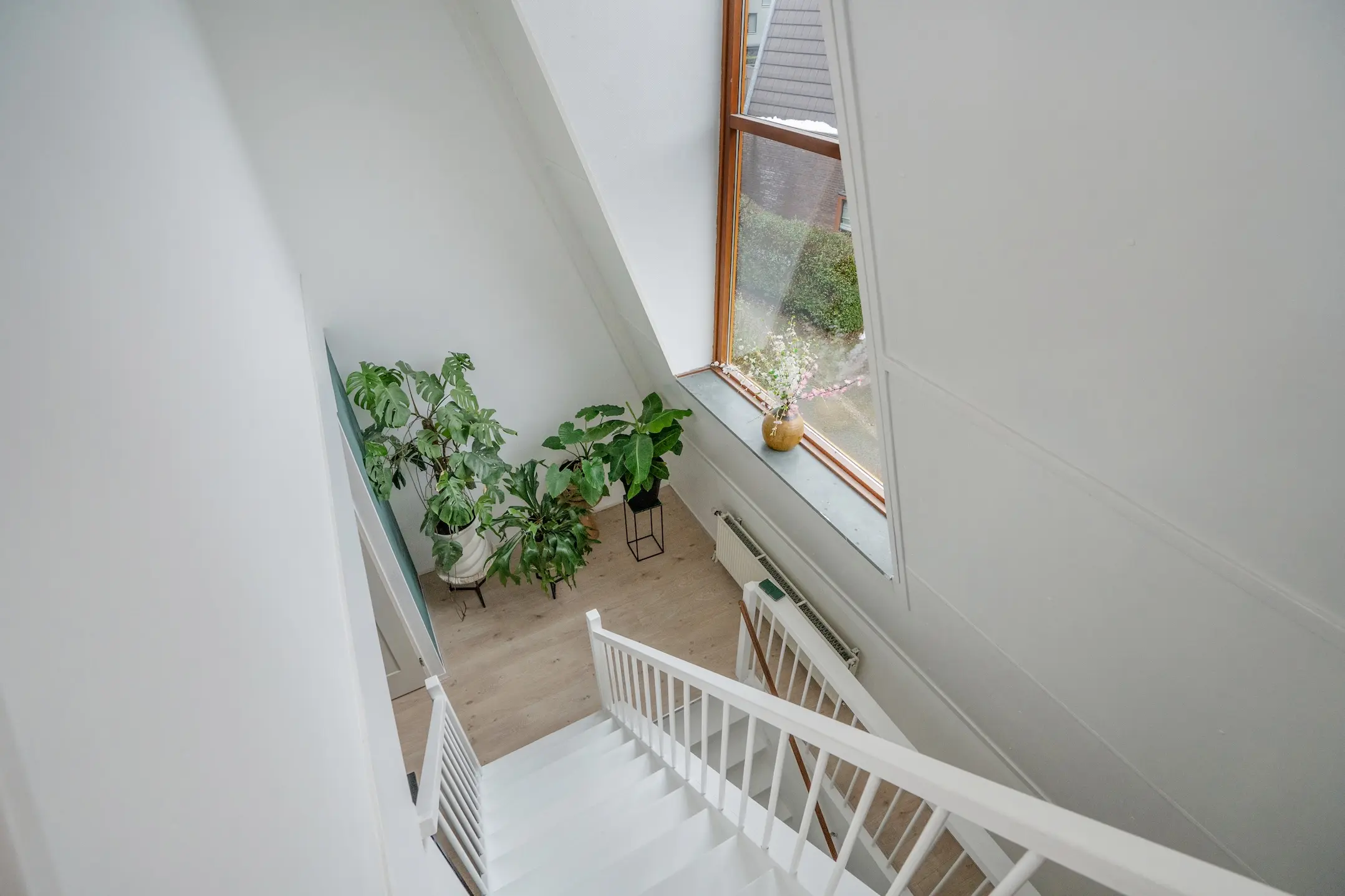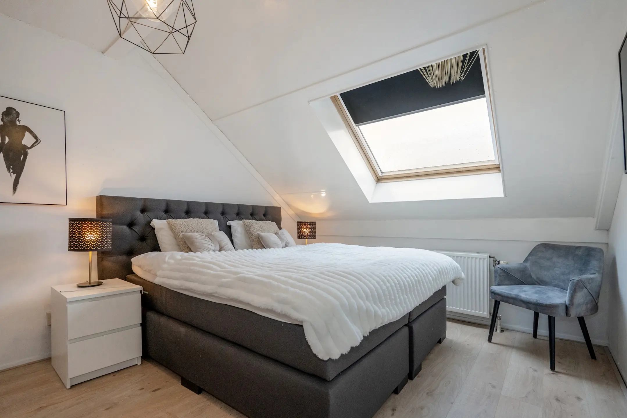 2e verdieping: fraaie vide met veel daglichttoetreding, ruime inloopkast (ideaal als 2e badkamer), royale achtergelegen slaapkamer met groot Velux dakraam, 2e ruime slaapkamer wederom met groot Velux dakraam. Wederom deze verdieping voorzien van een mooie laminaatvloer.