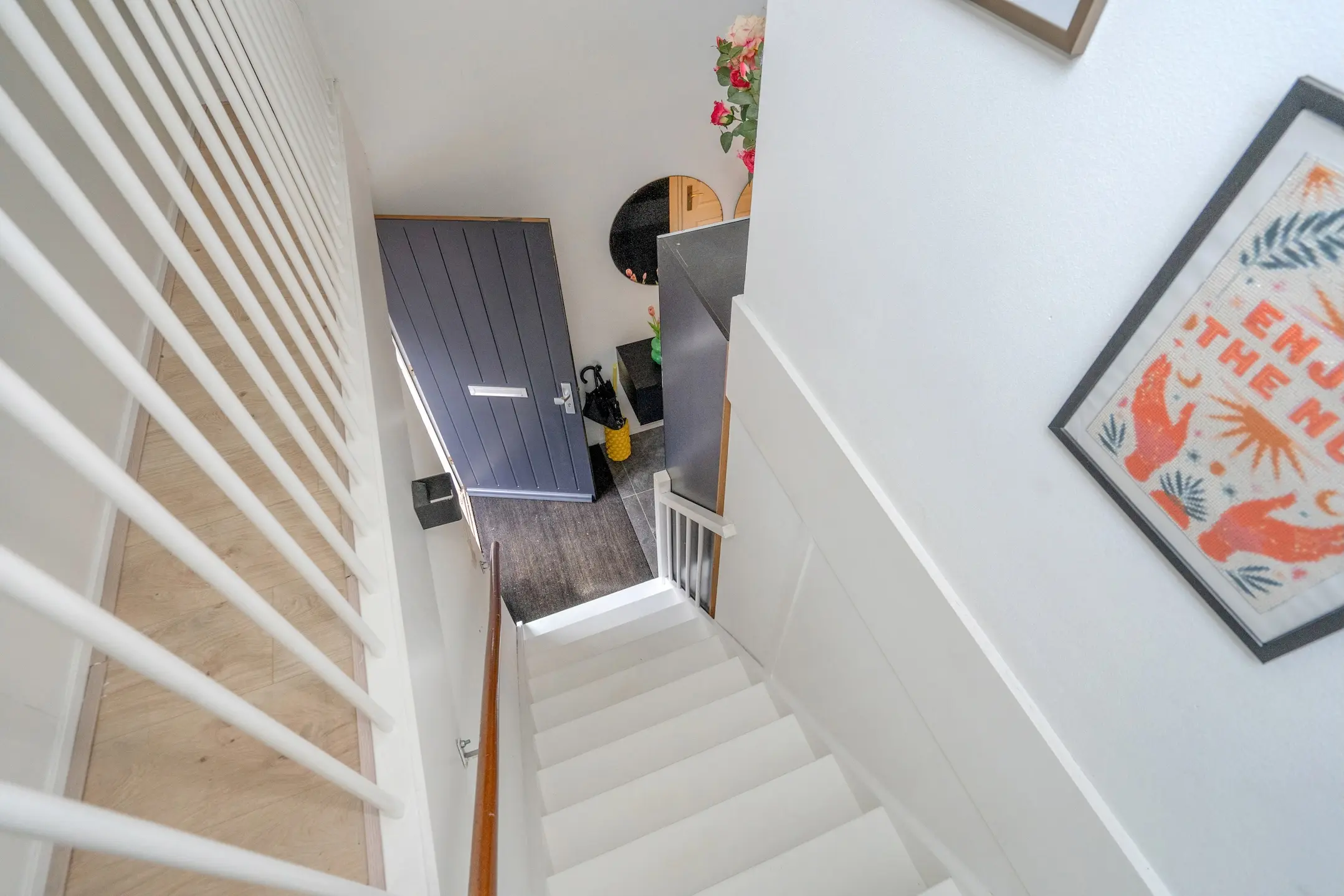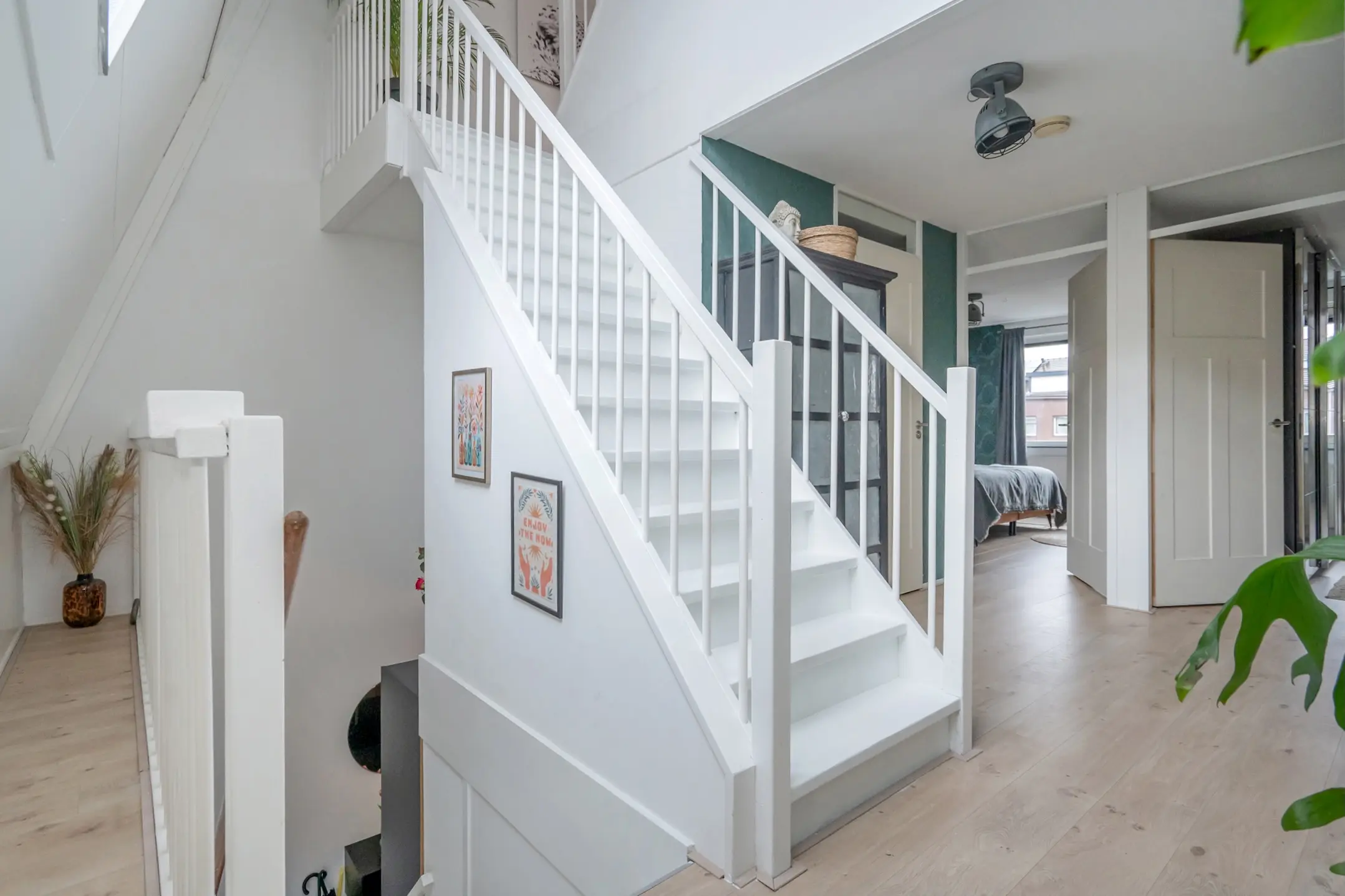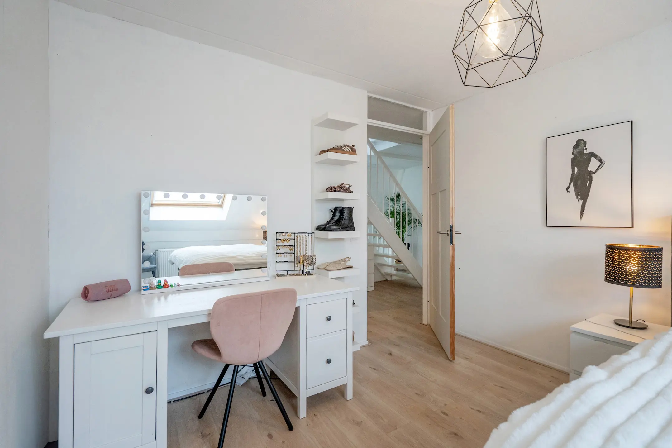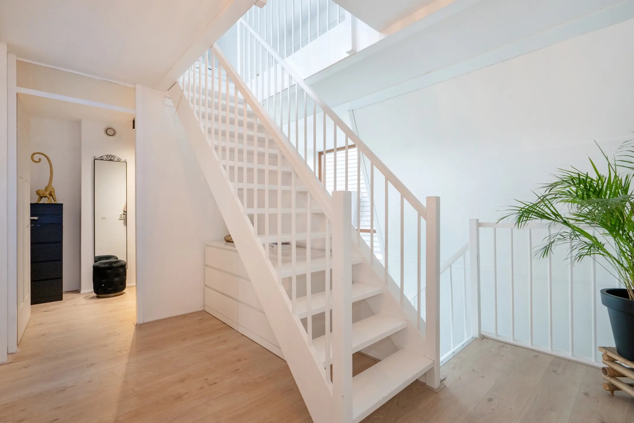 2e verdieping: fraaie vide met veel daglichttoetreding, ruime inloopkast (ideaal als 2e badkamer), royale achtergelegen slaapkamer met groot Velux dakraam, 2e ruime slaapkamer wederom met groot Velux dakraam. Wederom deze verdieping voorzien van een mooie laminaatvloer.