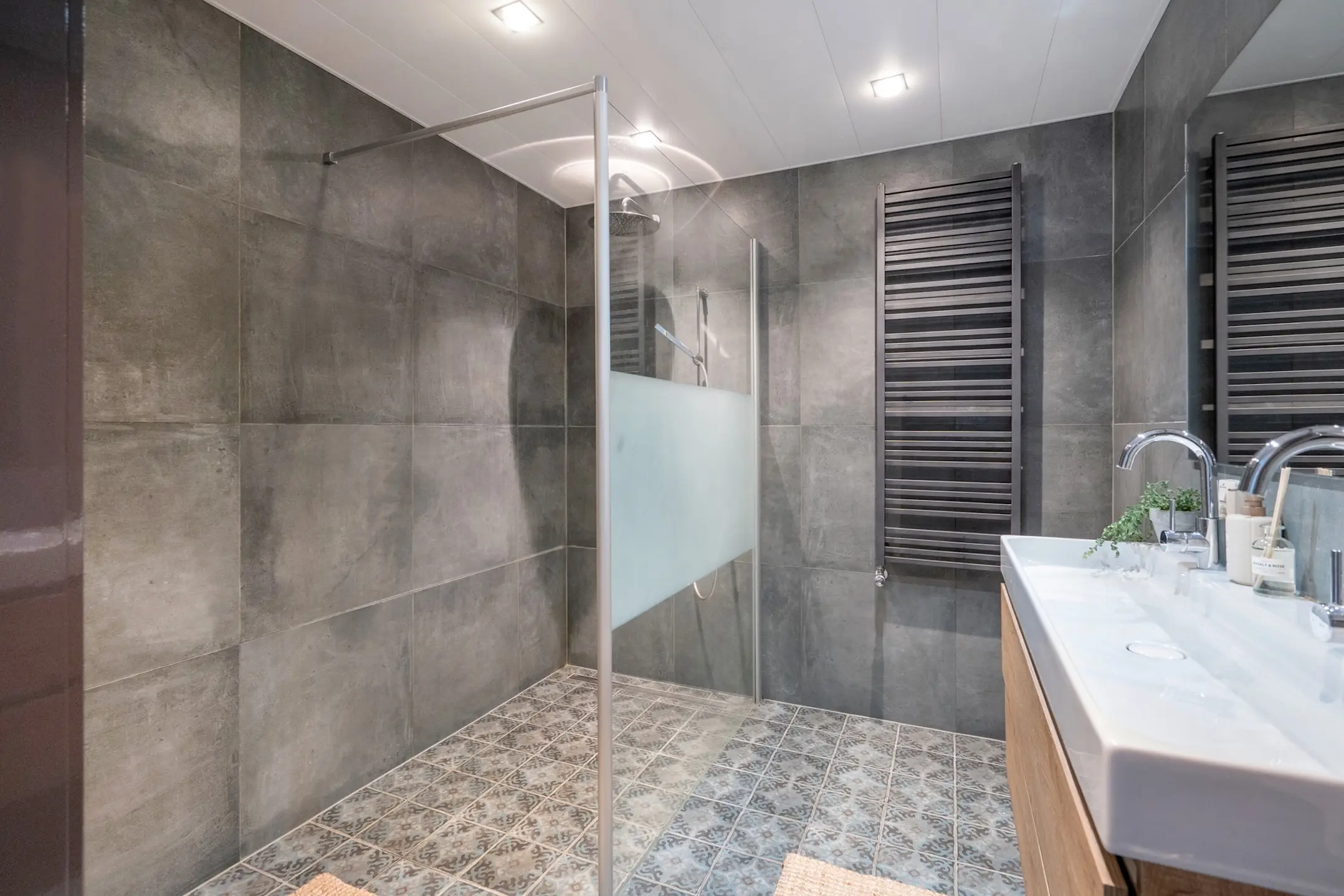 1e verdieping: via de hal naar de 1e verdieping, een ruime overloop met mooie lichtinval mede door grote raampartij aan de voorzijde van de woning, net toilet (geheel betegeld) met fontein, achtergelegen hoofdslaapkamer, moderne badkamer met vloerverwarming, dubbel wastafelmeubel, designradiator, fraaie inloopdouche met drain en rainshower, 2e achtergelegen slaapkamer met vaste kast. De gehele verdieping is voorzien van een laminaatvloer.