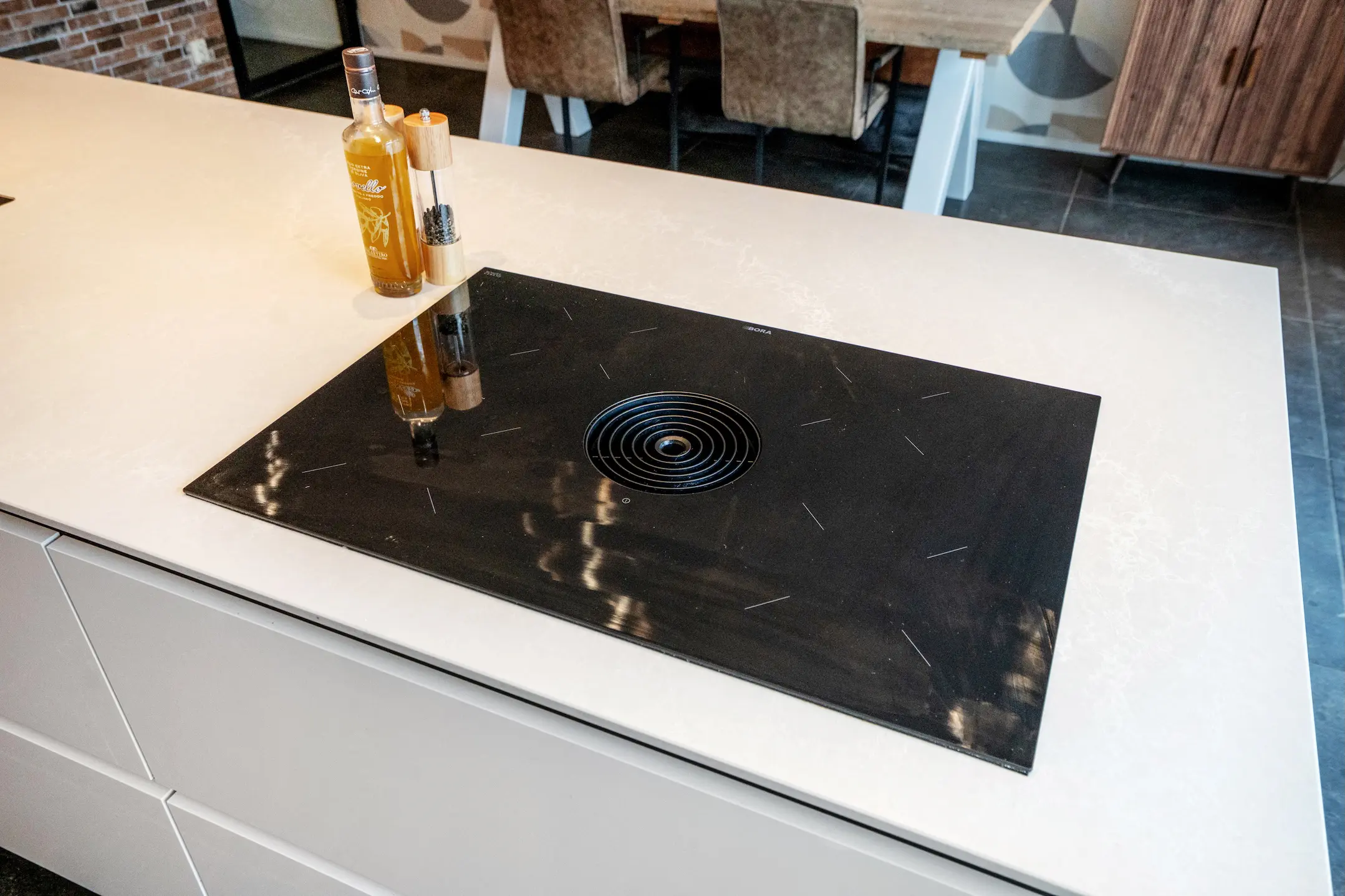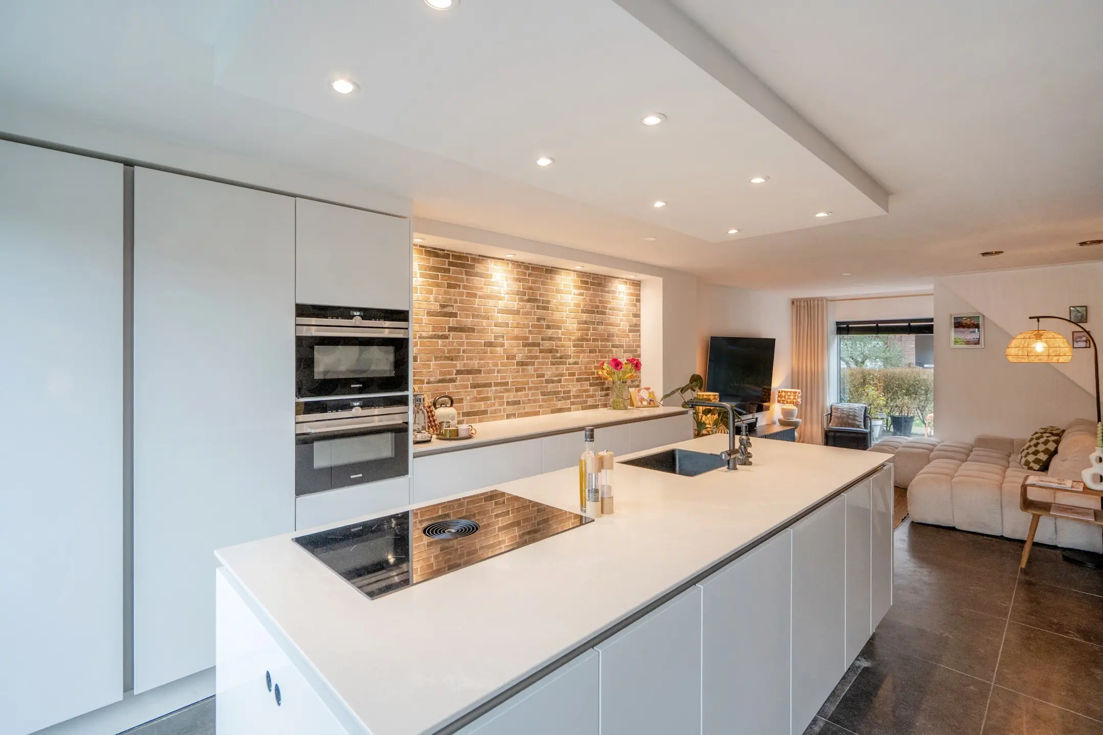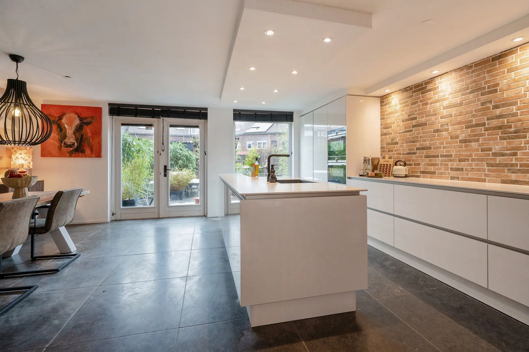 Indeling: zonnige voortuin met uitzicht op groenstrook (zonder verkeer), entree woning, ruime hal, garderoberuimte, keurig toilet (geheel betegeld) met fontein, zeer sfeervolle woon-/eetkamer met voorgelegen living en achtergelegen luxueuze moderne woonkeuken met o.a. een kook-/werkeiland, composiet aanrechtblad en diverse inbouwapparatuur w.o. een Bora inductie kookplaat met geïntegreerd afzuigsysteem, vaatwasser, grote koelkast, aparte grote vriezer en 2 ovens (Siemens) waarvan 1 een combi oven/magnetron, middels openslaande deuren heeft men toegang tot de zonnig gelegen achtertuin met achterom, houten berging en veranda (voorheen een carport) welke op een eenvoudige manier weer terug te brengen is. De gehele begane grond is voorzien van mooie natuursteen vloertegels inclusief vloerverwarming.