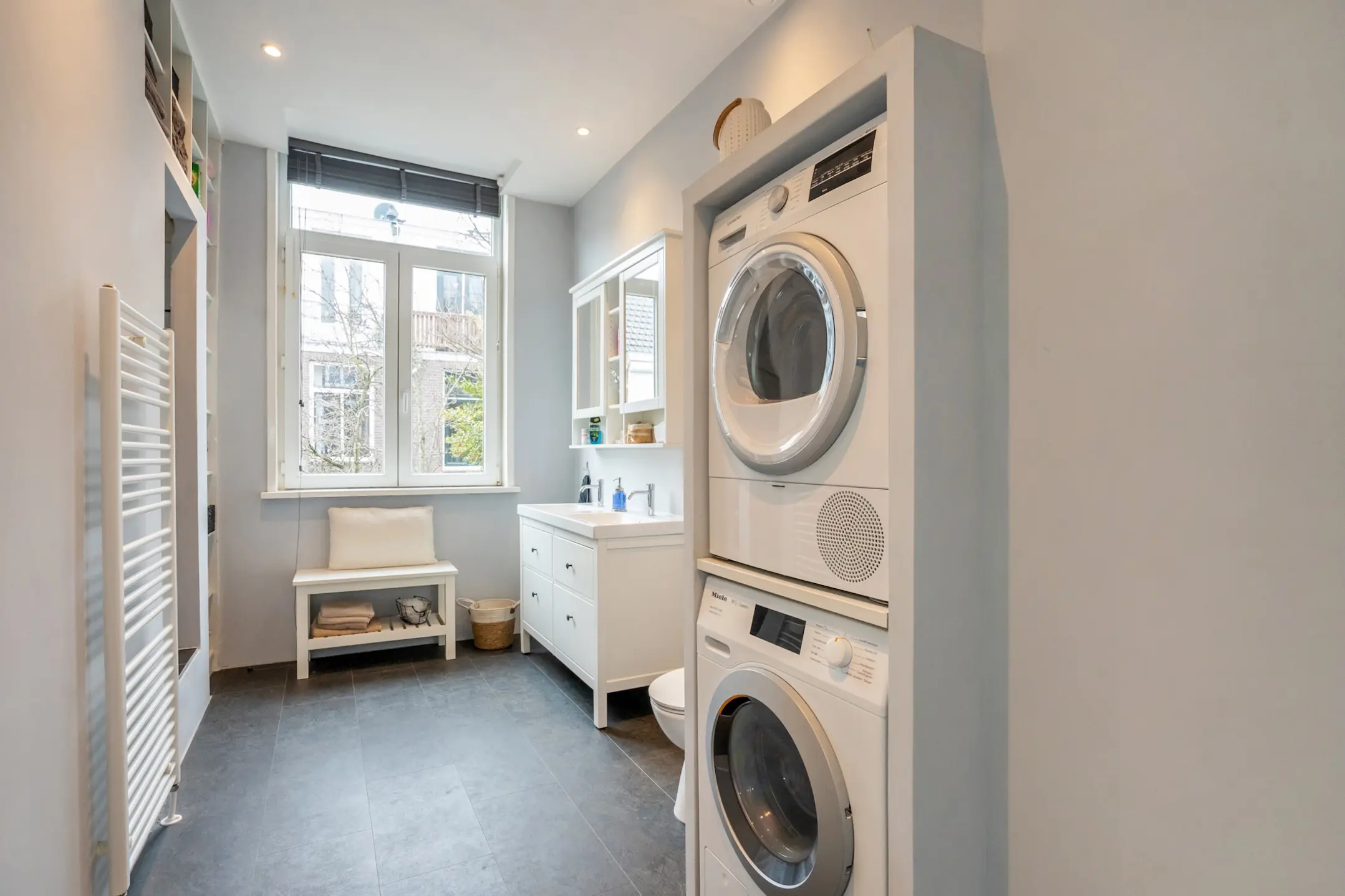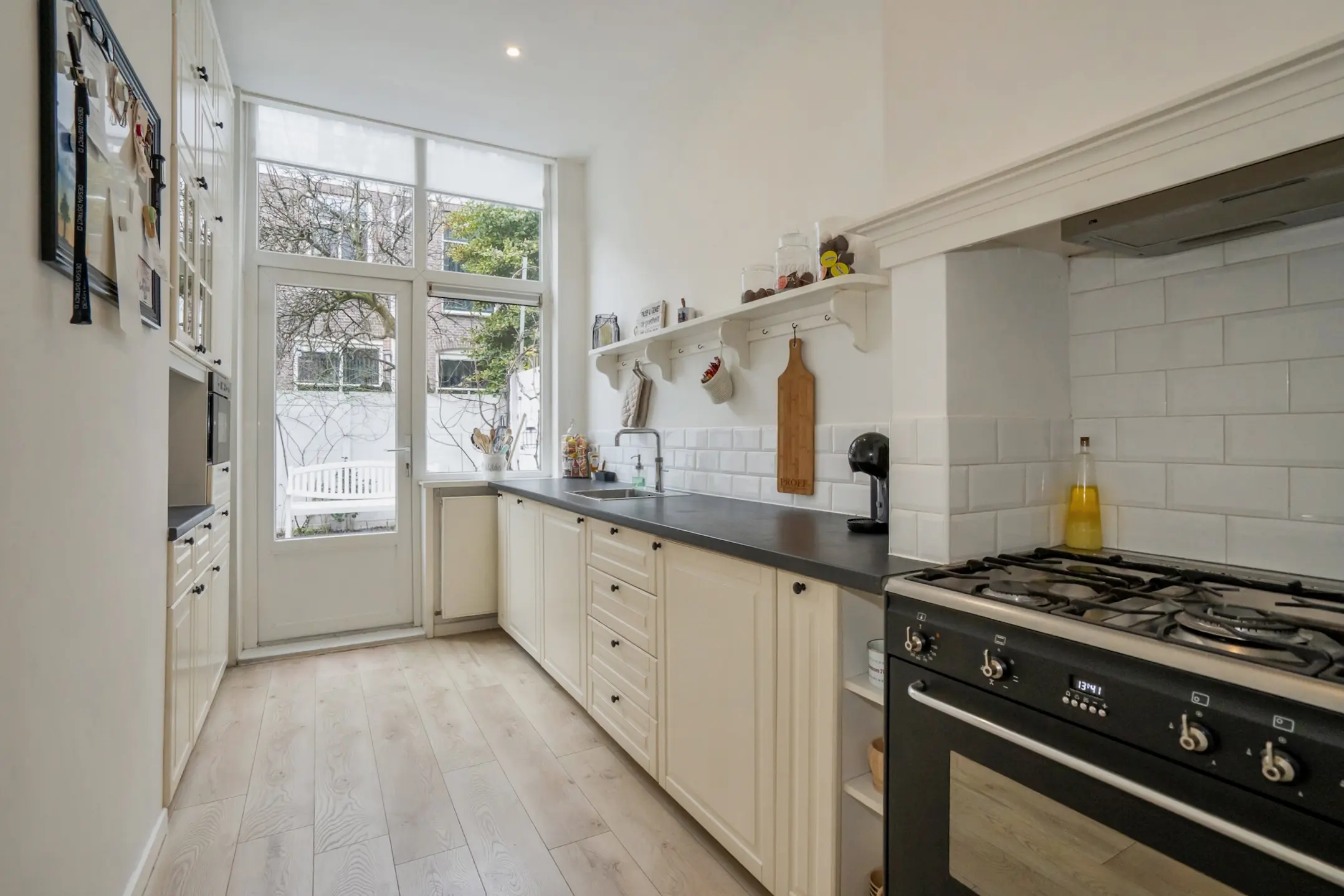 Aan de achterzijde ligt de moderne, brede keuken uit 2019, voorzien van een smeg gasfornuis met vijf pitten, koelkast, quooker, miele vaatwasser en voldoende bergruimte. Vanuit de keuken is er toegang tot de brede en onderhoudsvriendelijke achtertuin op het noordwesten, met een schuur voorzien van elektra. In de hal bevinden zich daarnaast twee royale vaste kasten.