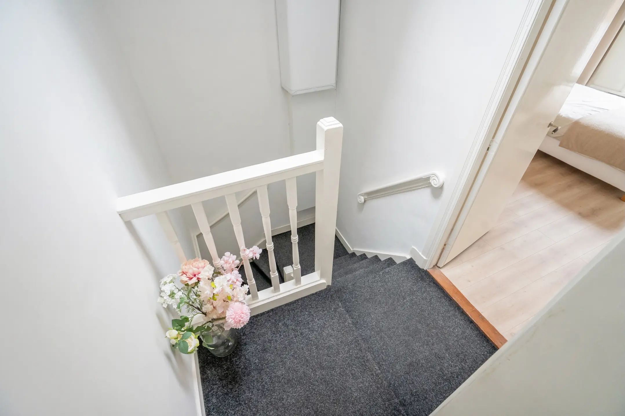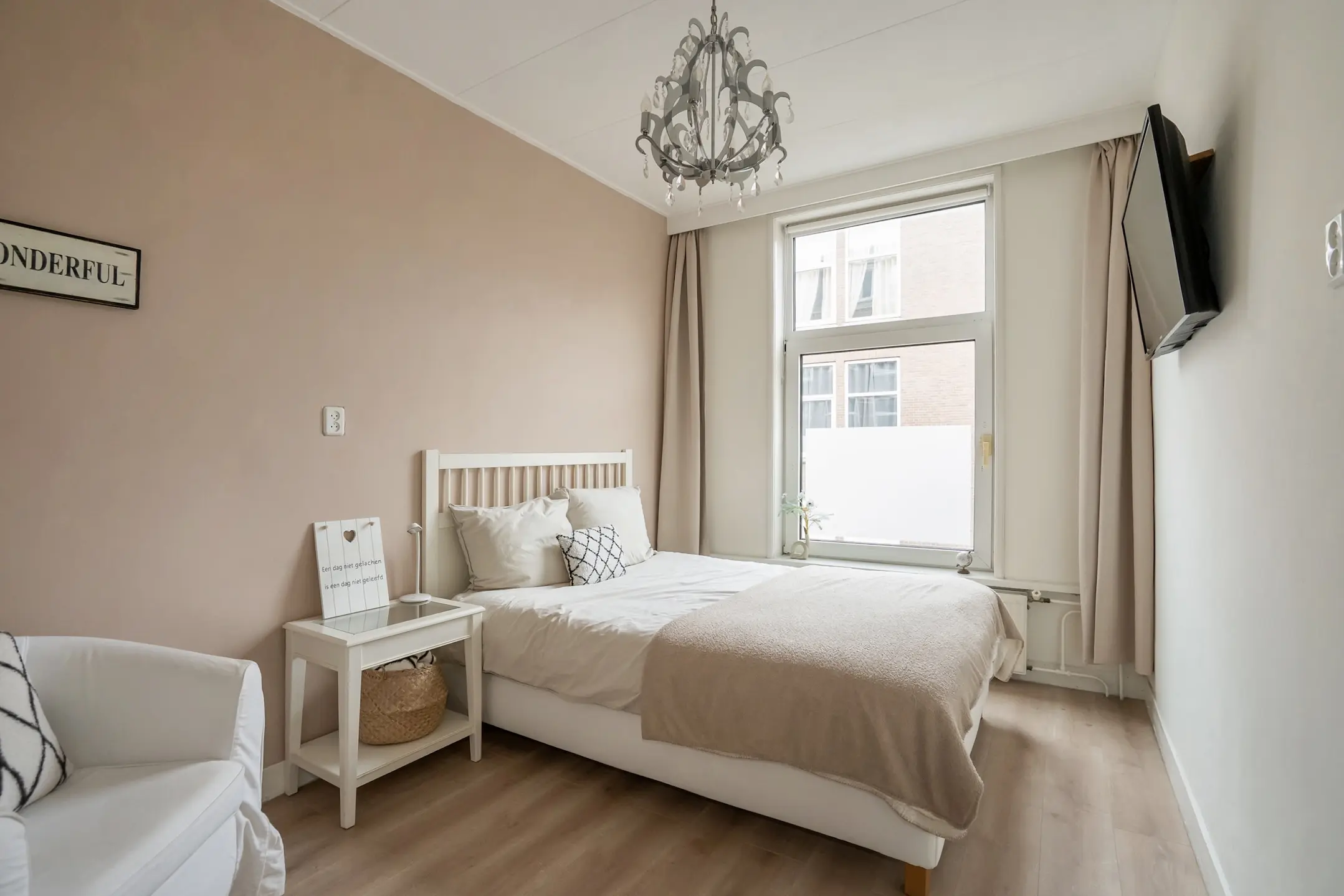 Aan de voorzijde van de woning ligt een ruime en lichte slaapkamer, voorzien van een royale vaste kast. In één van de kasten is de vernieuwde meterkast netjes weggewerkt.