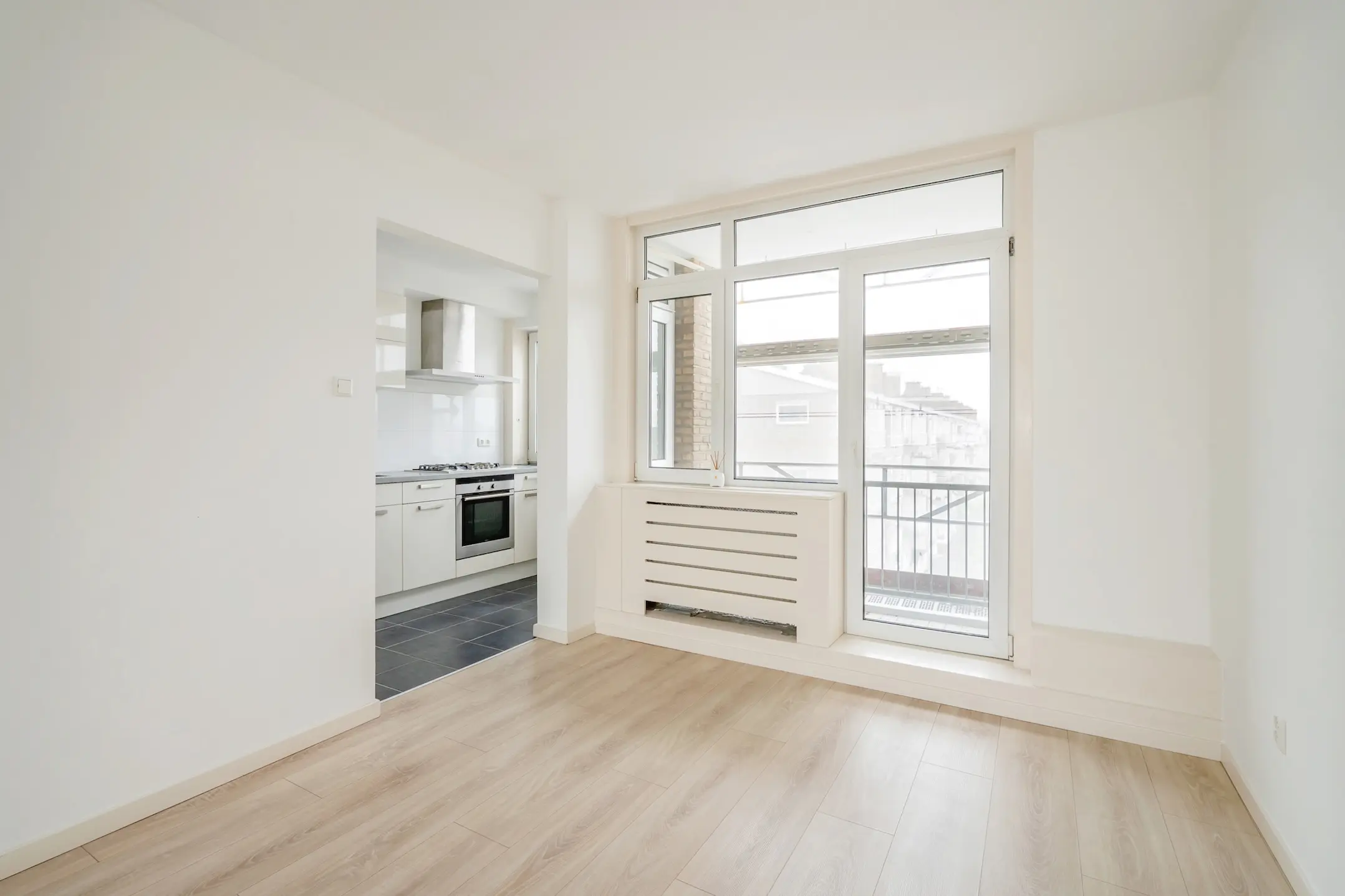 De woon-/eetkamer is geheel voorzien van een fraaie laminaatvloer, strak gestuukte wanden en plafond, een ingestukte nis en toegang tot het achtergelegen balkon met balkonkast. In de balkonkast bevindt zich de opstelplaats van de HR cv-ketel (Intergas, 2016).