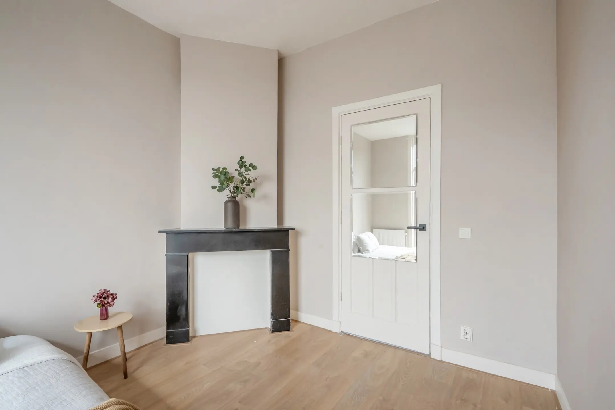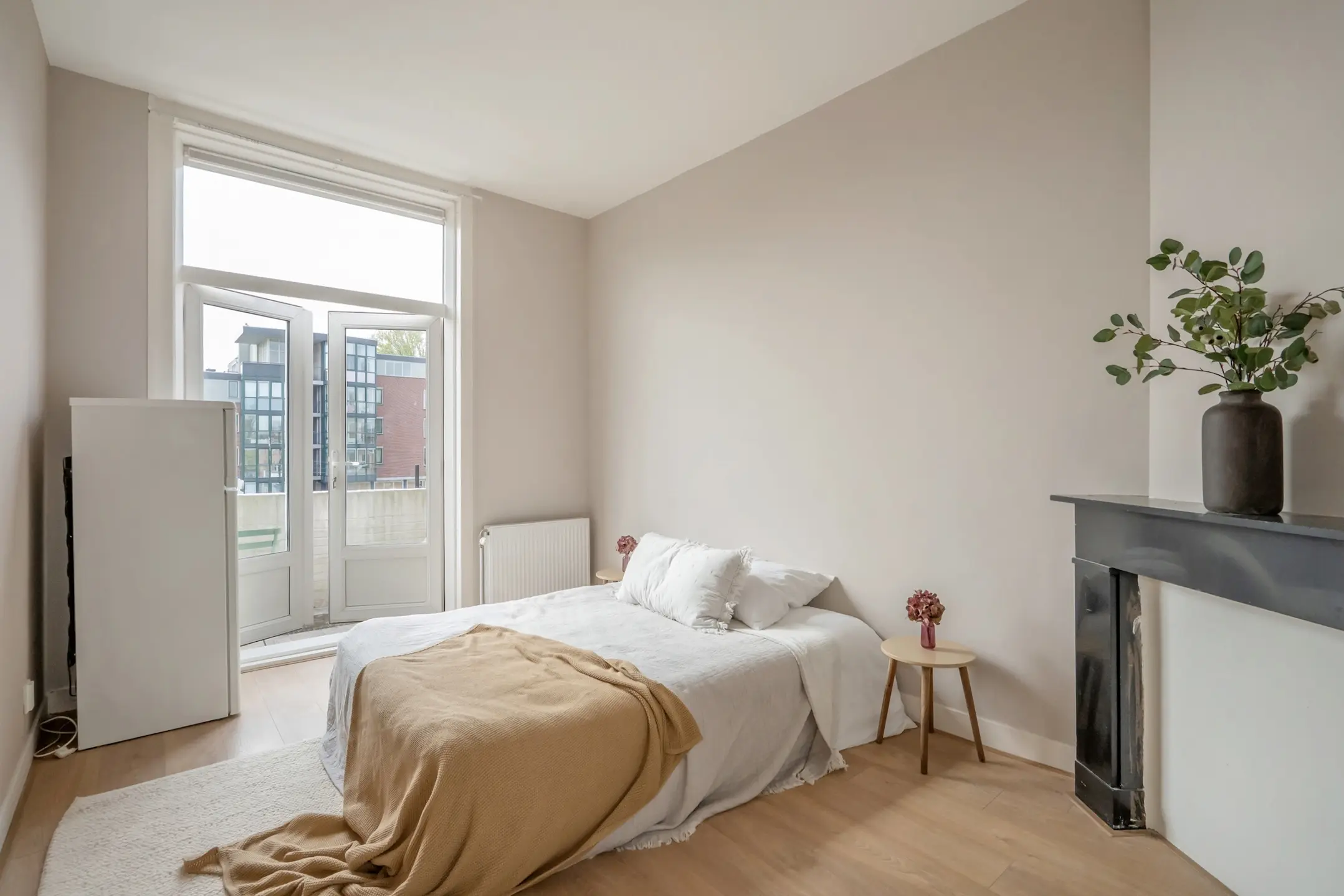 Slaapkamer 1: De ruime slaapkamer heeft een charmante schouwpartij en openslaande deuren naar het balkon.