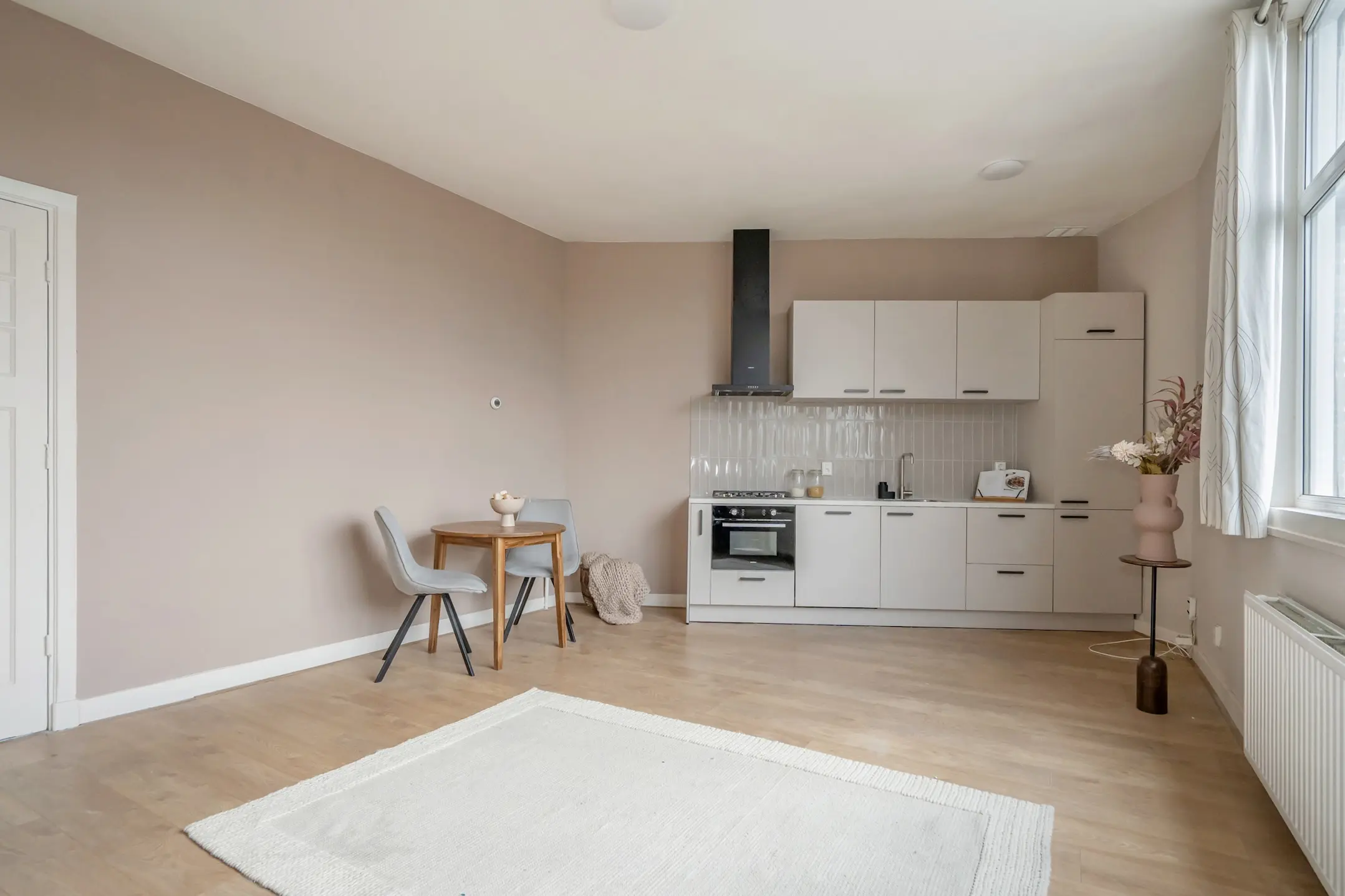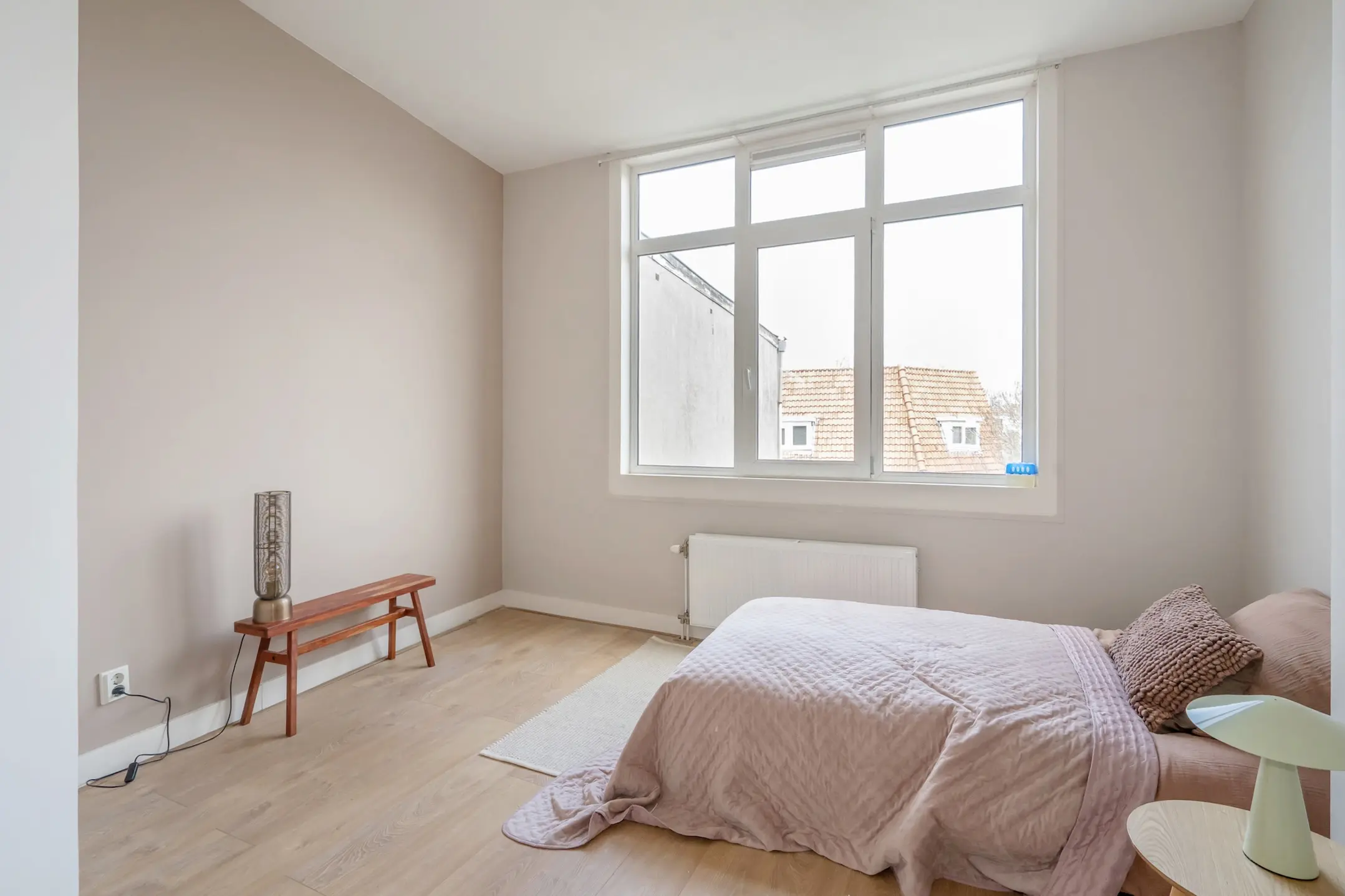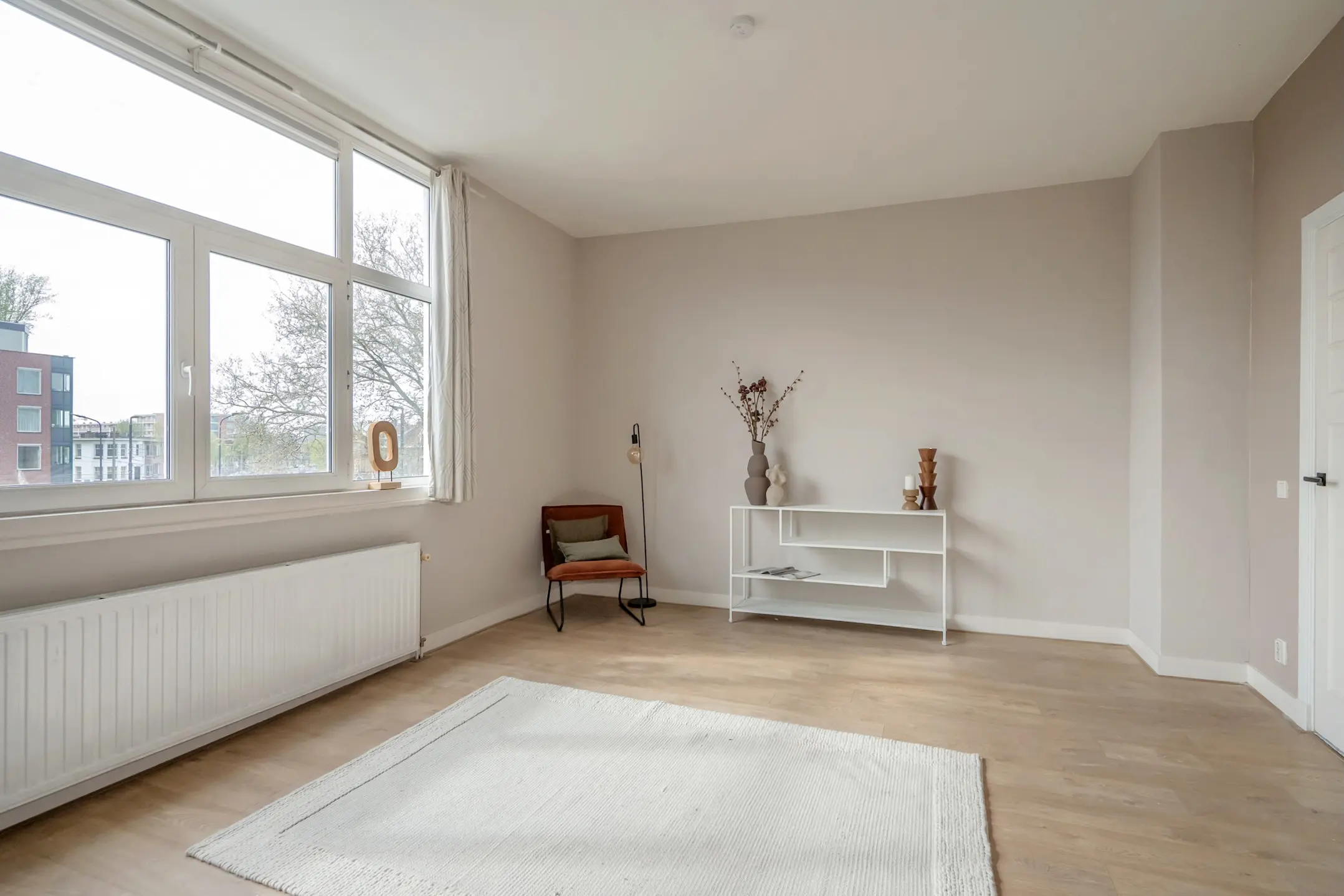 De lichte woon- en eetkamer is voorzien van een elegante laminaatvloer en biedt via openslaande deuren toegang tot het balkon aan de voorzijde, dat op het zuidwesten is gelegen. De muren zijn afgewerkt met moderne kleuren en de radiatoren zijn stijlvol omgebouwd. Aangrenzend bevindt zich de grote slaapkamer, die ook beschikt over openslaande deuren naar het balkon.