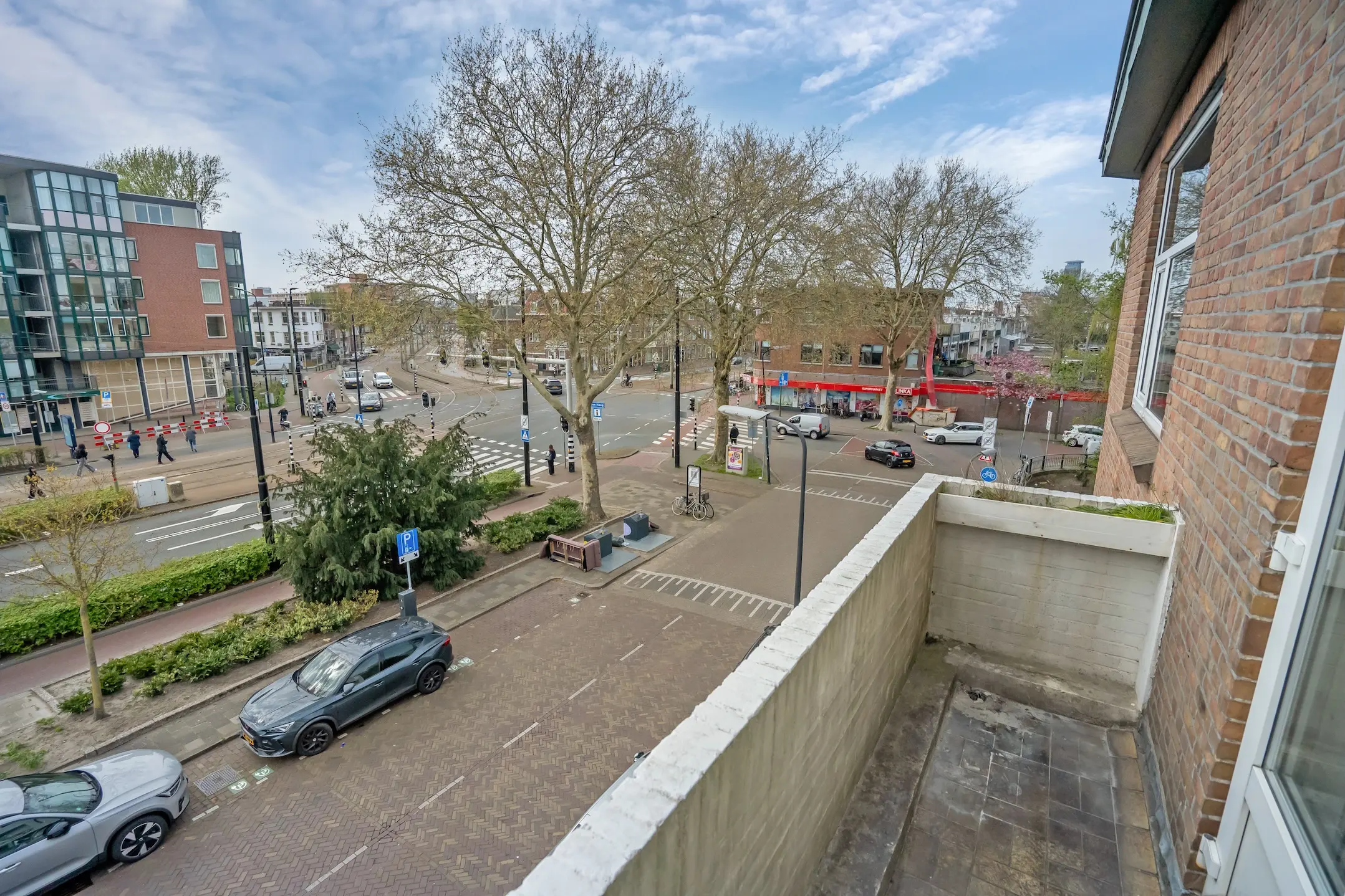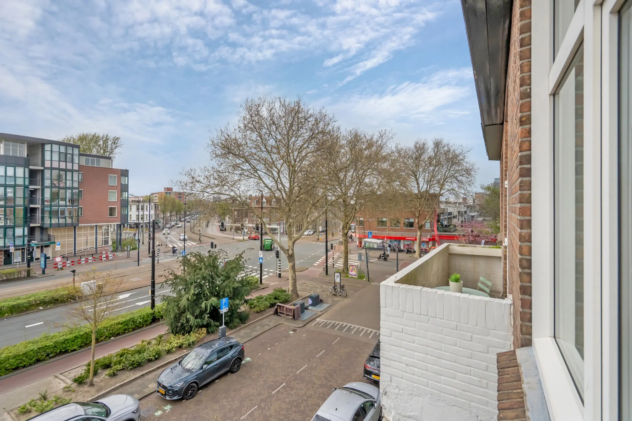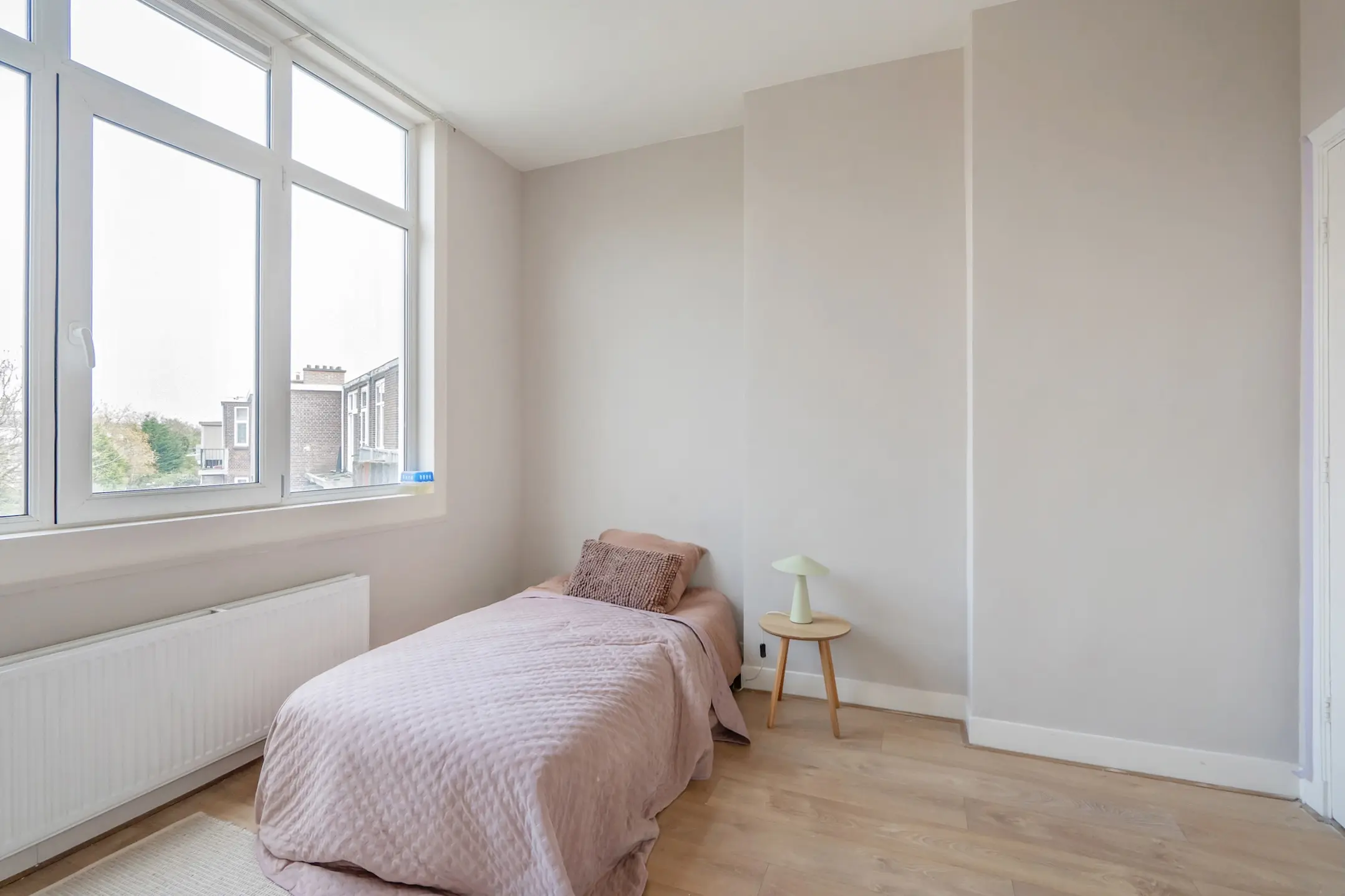 De lichte woon- en eetkamer is voorzien van een elegante laminaatvloer en biedt via openslaande deuren toegang tot het balkon aan de voorzijde, dat op het zuidwesten is gelegen. De muren zijn afgewerkt met moderne kleuren en de radiatoren zijn stijlvol omgebouwd. Aangrenzend bevindt zich de grote slaapkamer, die ook beschikt over openslaande deuren naar het balkon.