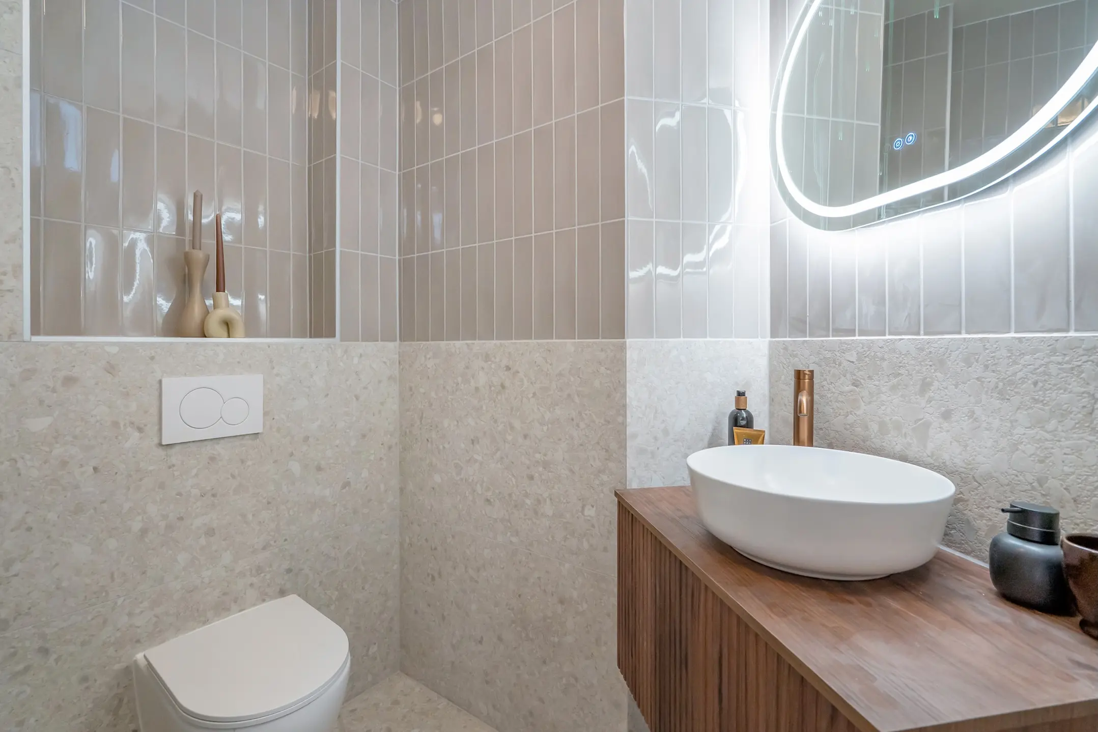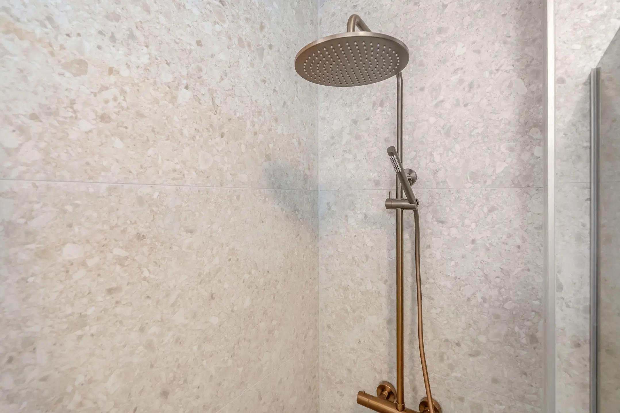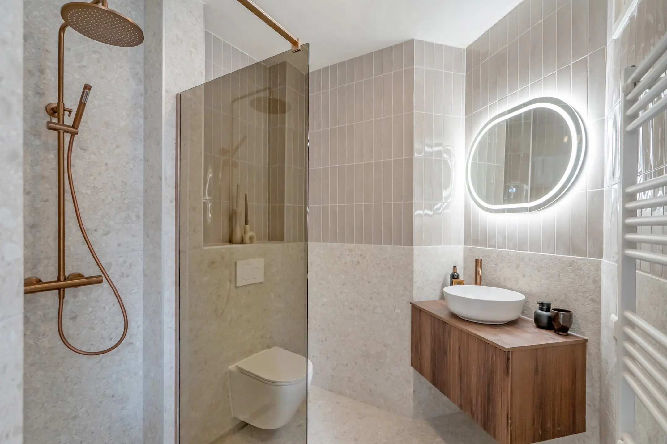 De luxe badkamer is volledig voorzien van modieuze wand- en vloertegels. Er is een trendy inloopdouche met stort- en handdouche, een brede drain voor optimale wateropvang, een wastafelmeubel met verlichte spiegel, een zwevend toilet, een designradiator en een ventilatiesysteem.