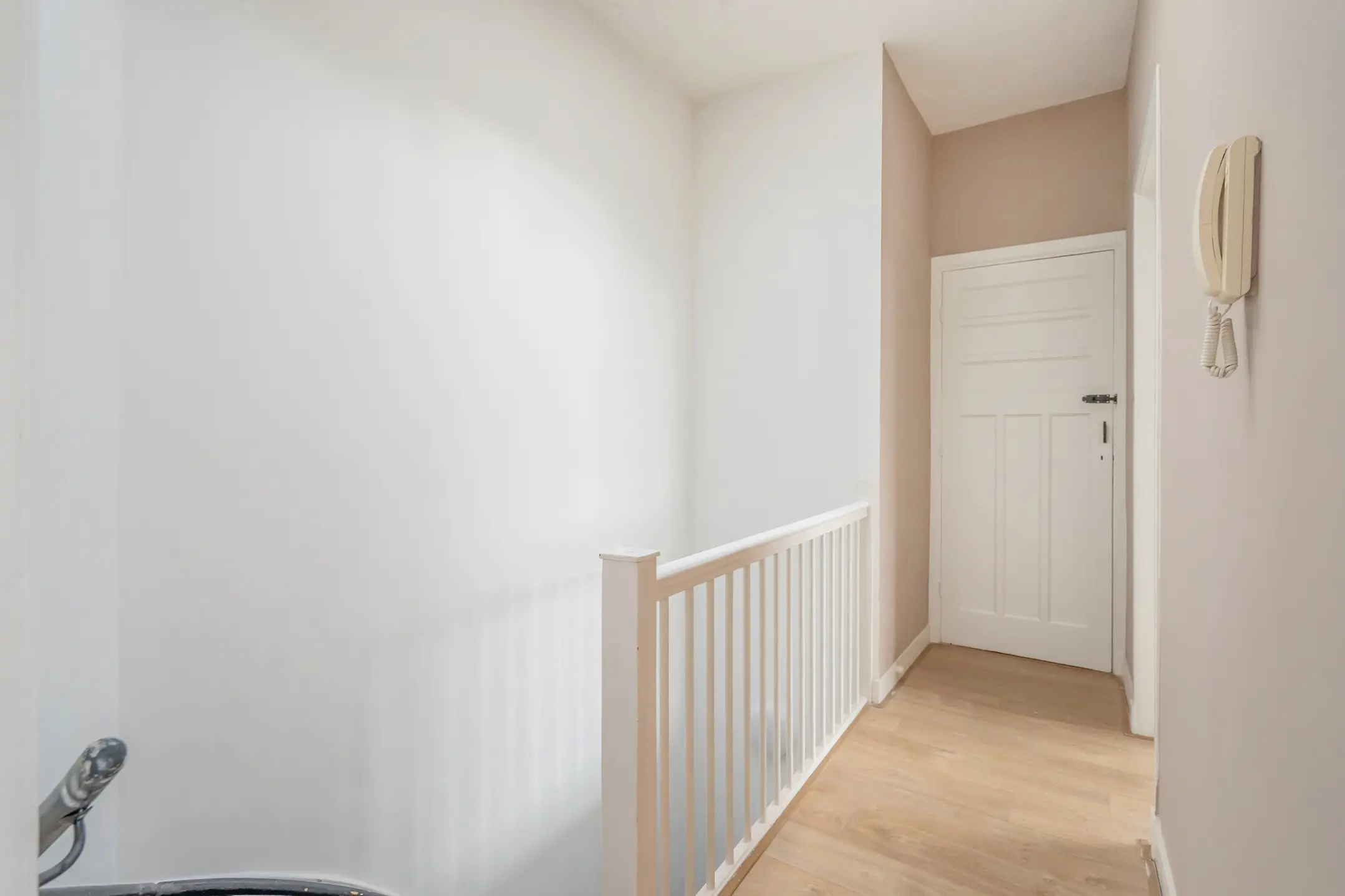 Via de entree op straatniveau is er een trap naar de eerste verdieping, waar een overloop toegang biedt tot het appartement. Een trap leidt naar de tweede verdieping.