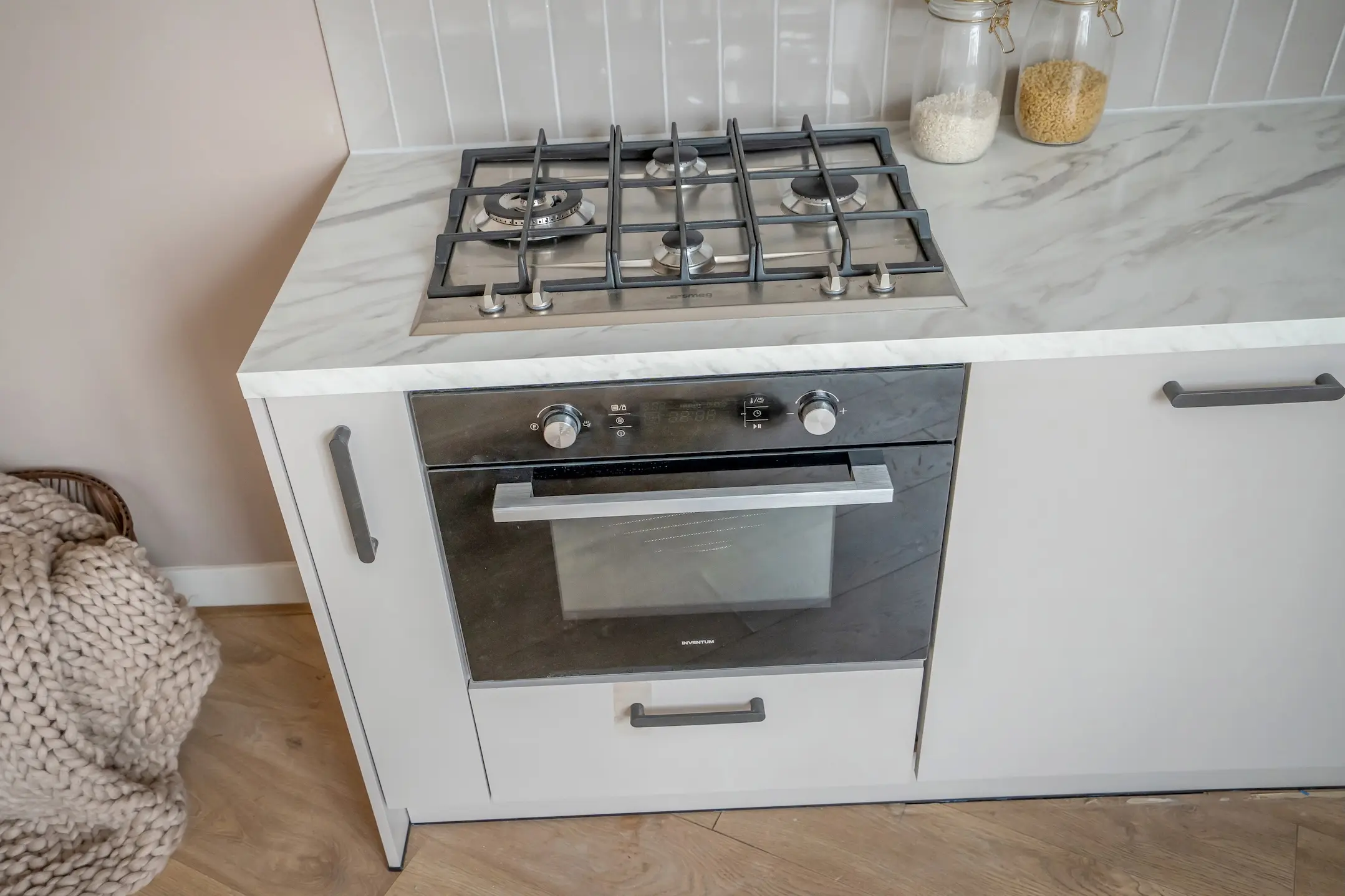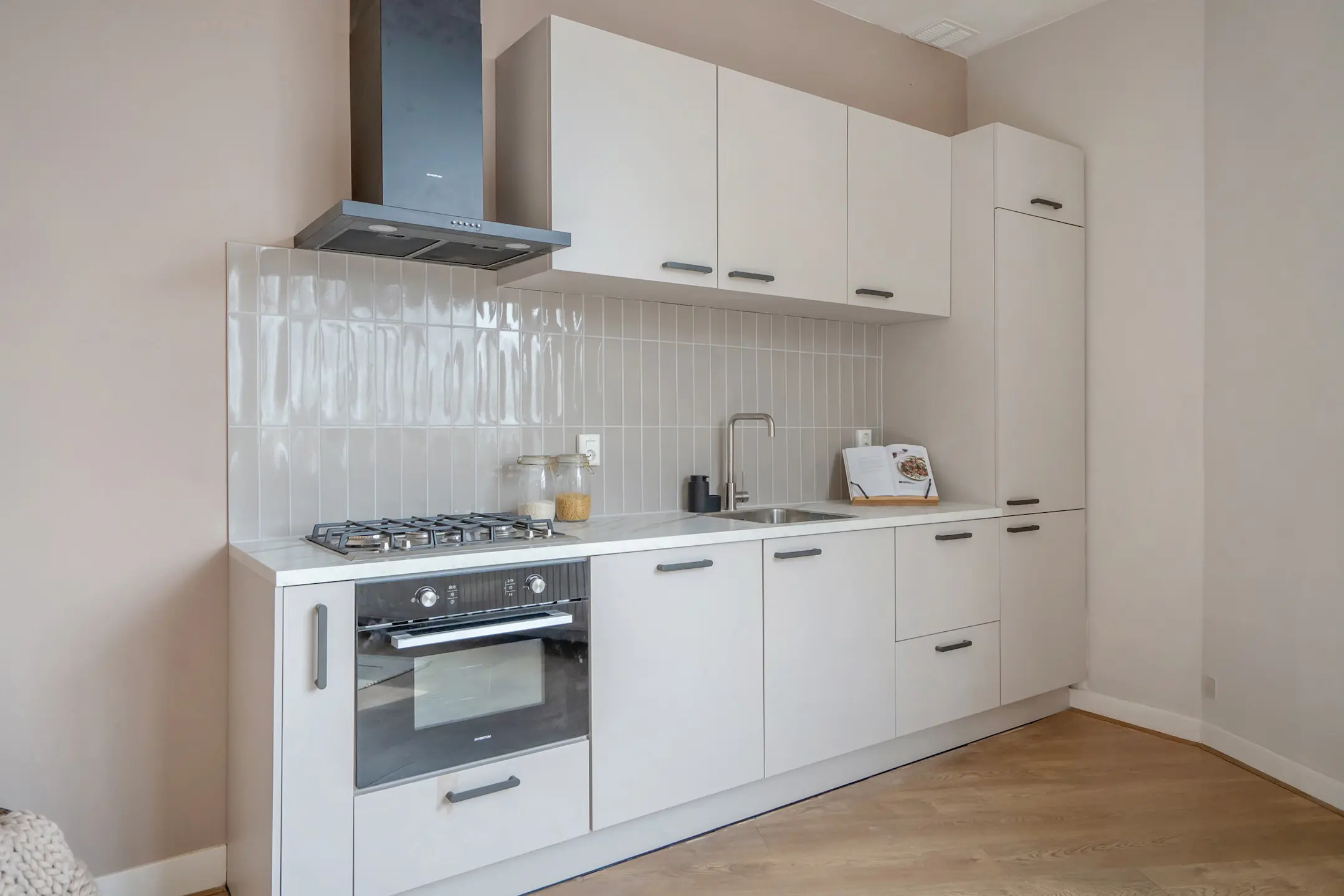 De moderne woonkeuken is in rechte opstelling geplaatst en biedt veel opbergruimte. Het witgevlakte aanrechtblad creëert een frisse uitstraling en de keuken is uitgerust met diverse inbouwapparatuur, waaronder een 4-pits gasfornuis, afzuigunit, spoelbak met mengkraan, vaatwasser en een koel-/vriescombinatie.
