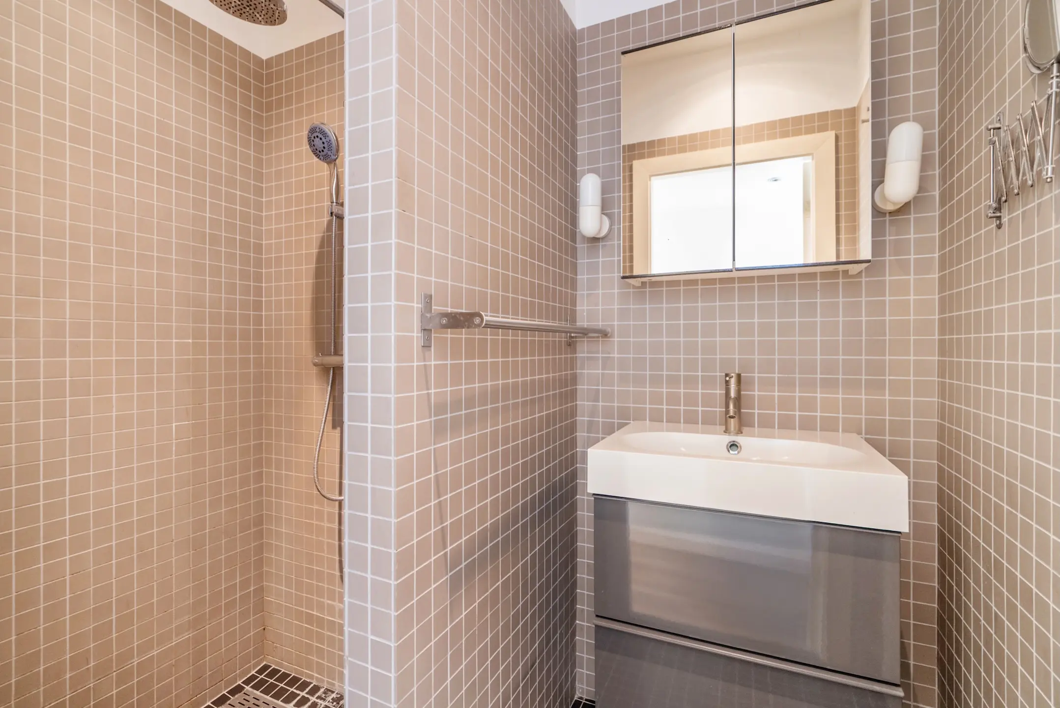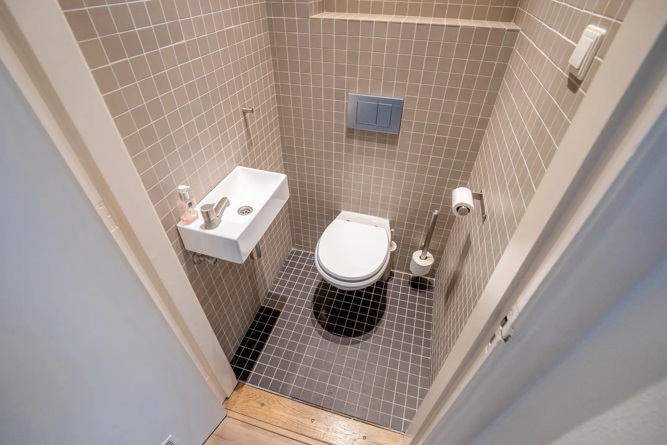 Vanaf de hal toegang tot een modern uitgevoerd toilet voorzien van wandcloset en fonteintje. Separate, nette badkamer met wastafelmeubel, spiegelkast en een doucheruimte met Rainshower voorzien van thermostaatkraan.