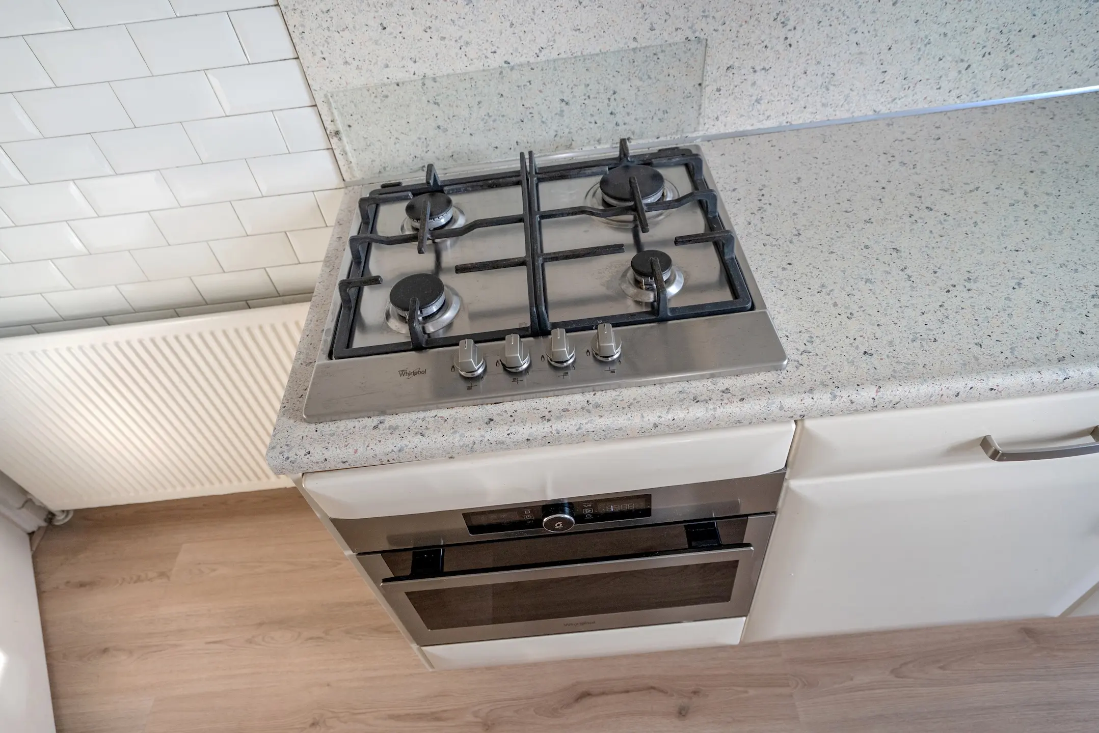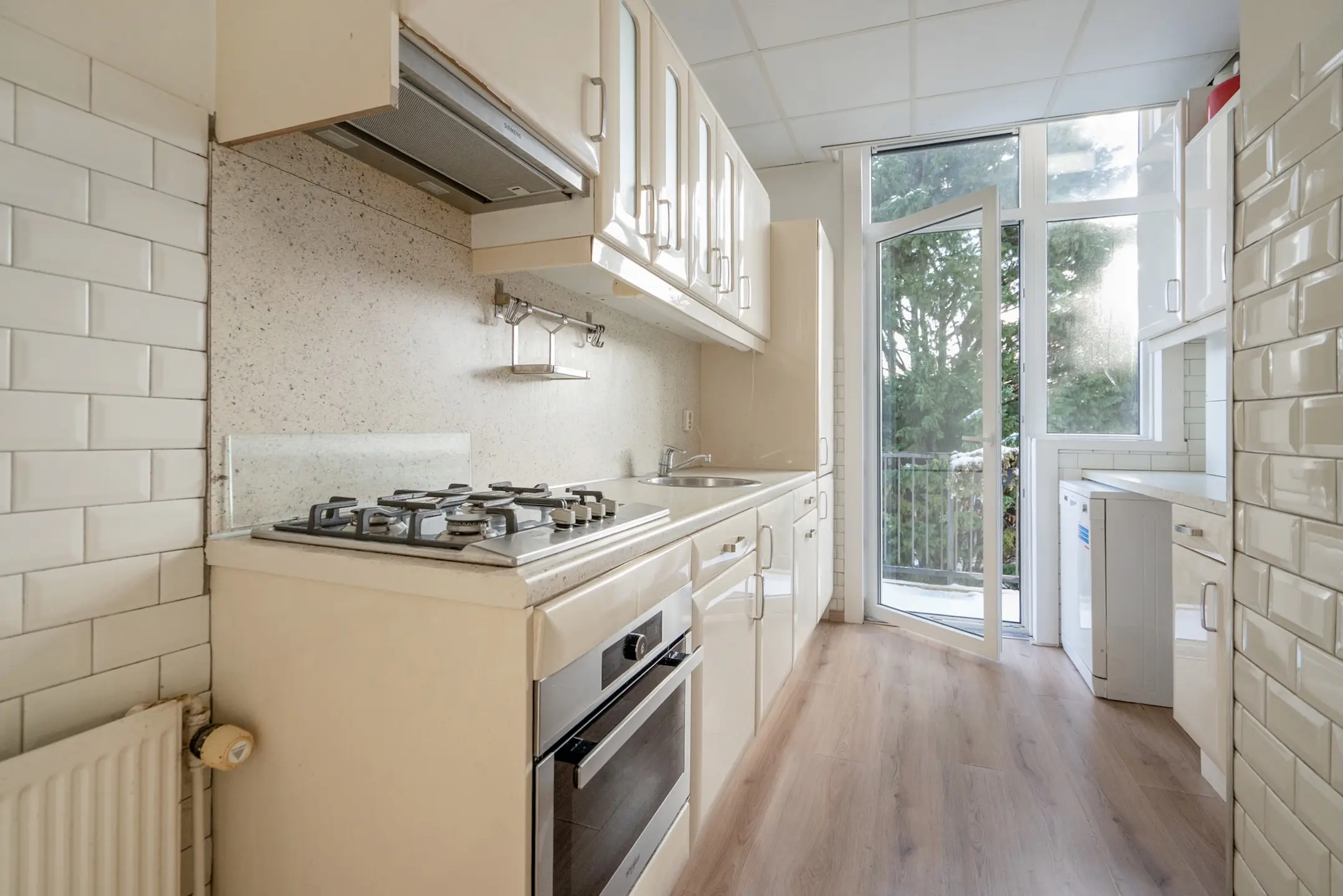 Aan de andere zijde een werkblad met onder- en bovenkasten, alsmede de opstelplaats voor de cv-combiketel (2022, onderhoud 2025).