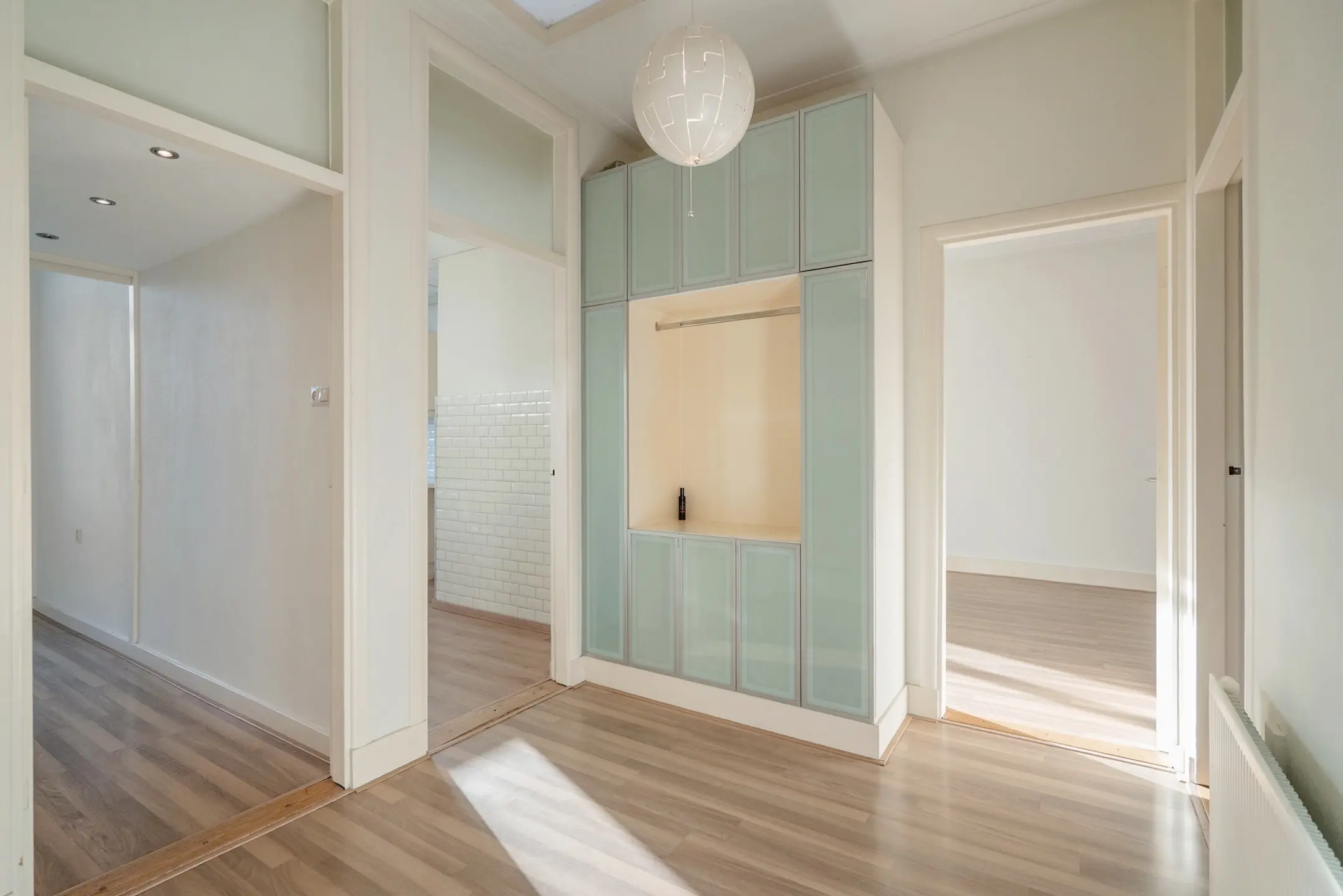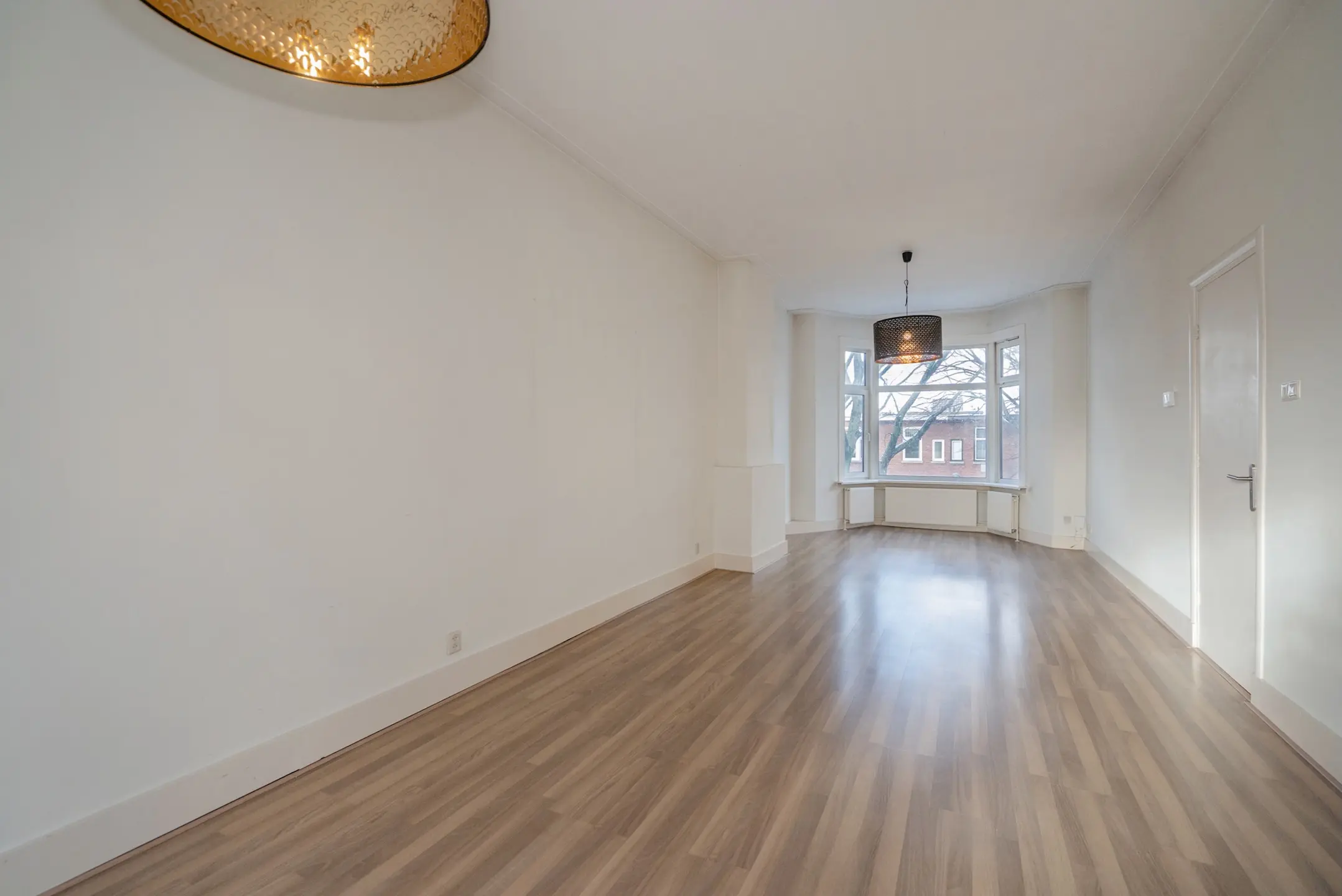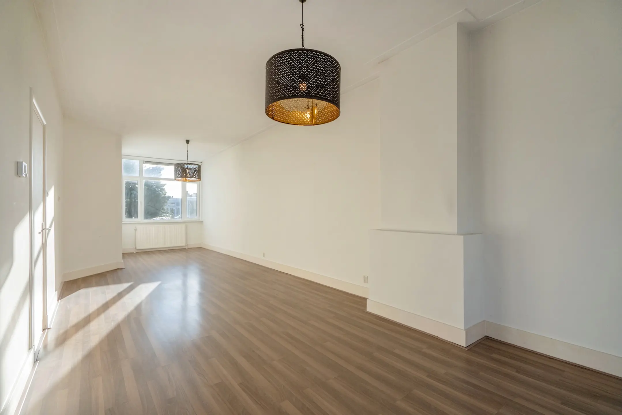 Open portiek, toegang tot de woning op de 2e verdieping, zeer ruime hal met dakraam en toegang tot alle vertrekken. Doorgebroken woon-/eetkamer met een mooi erkerraam aan de voorzijde met doorkijk in de straat, laminaatvloer en door de hoge plafonds een zeer ruimtelijke indruk.