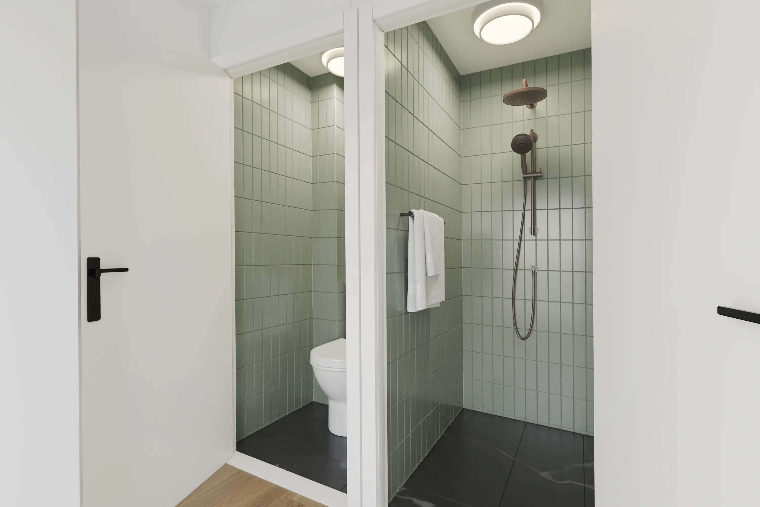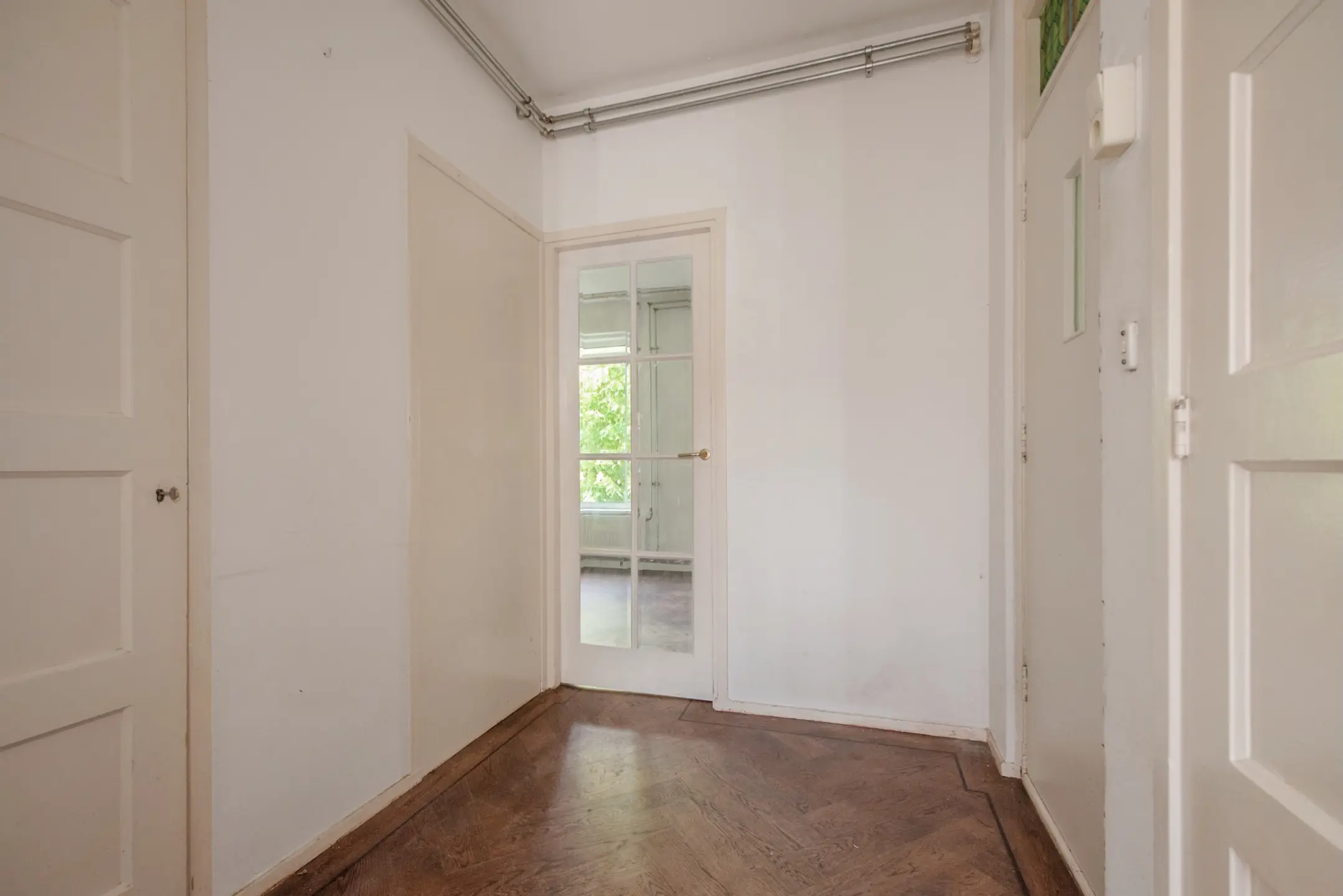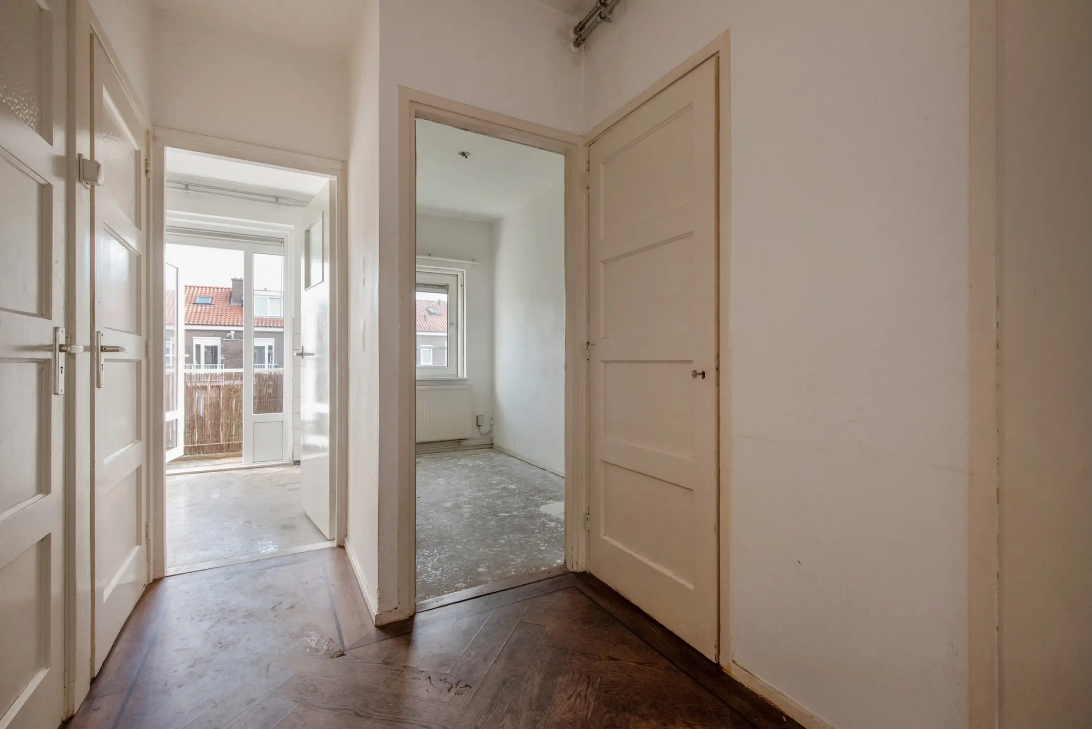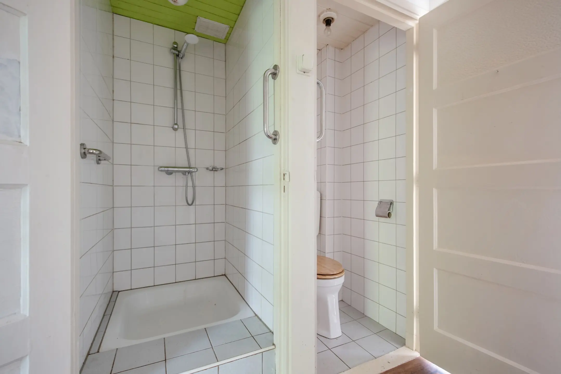 Gesloten portiek, trap naar de tweede verdieping, ruime hal met bergkast en meterkast.  Separaat toilet. Separate doucheruimte.