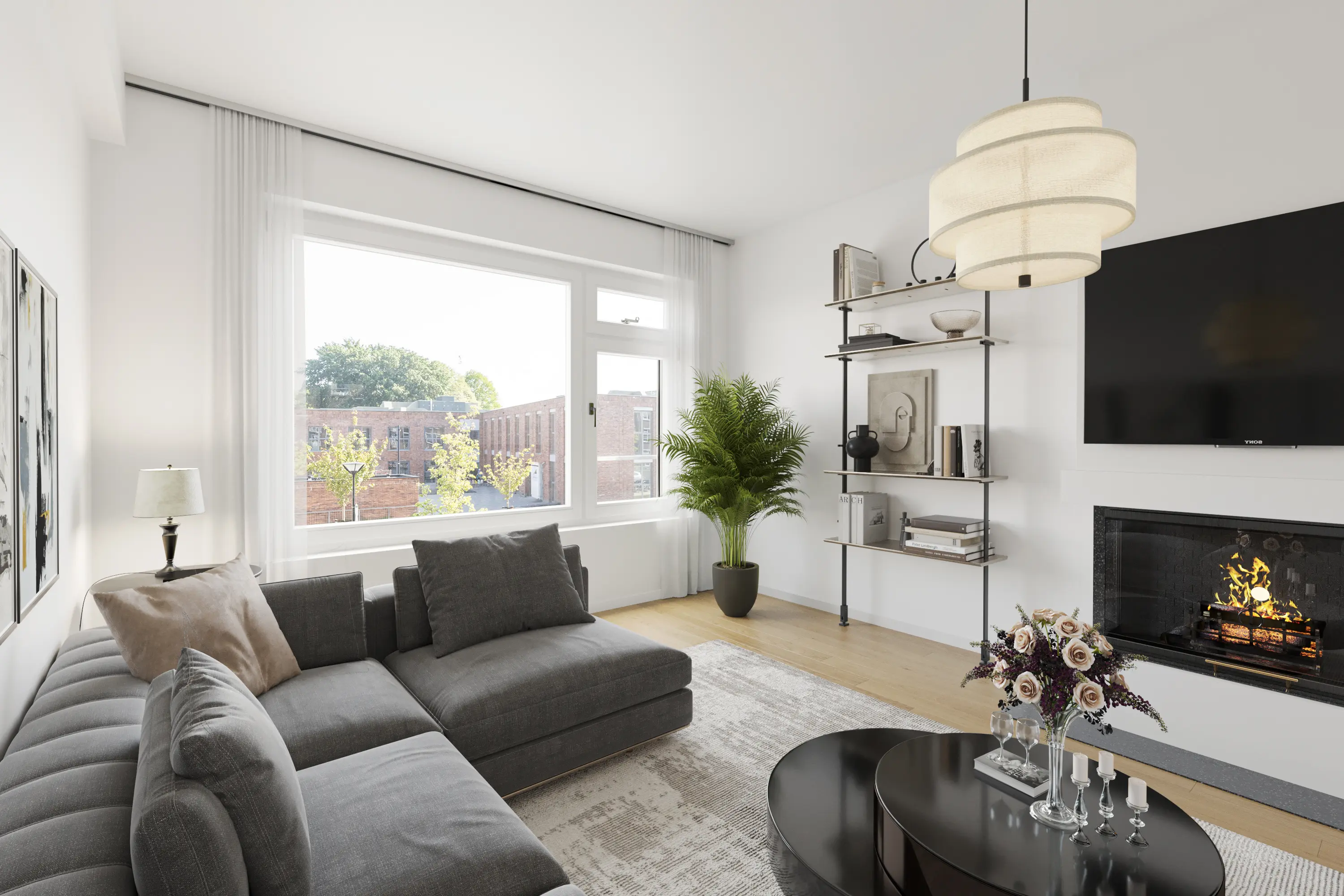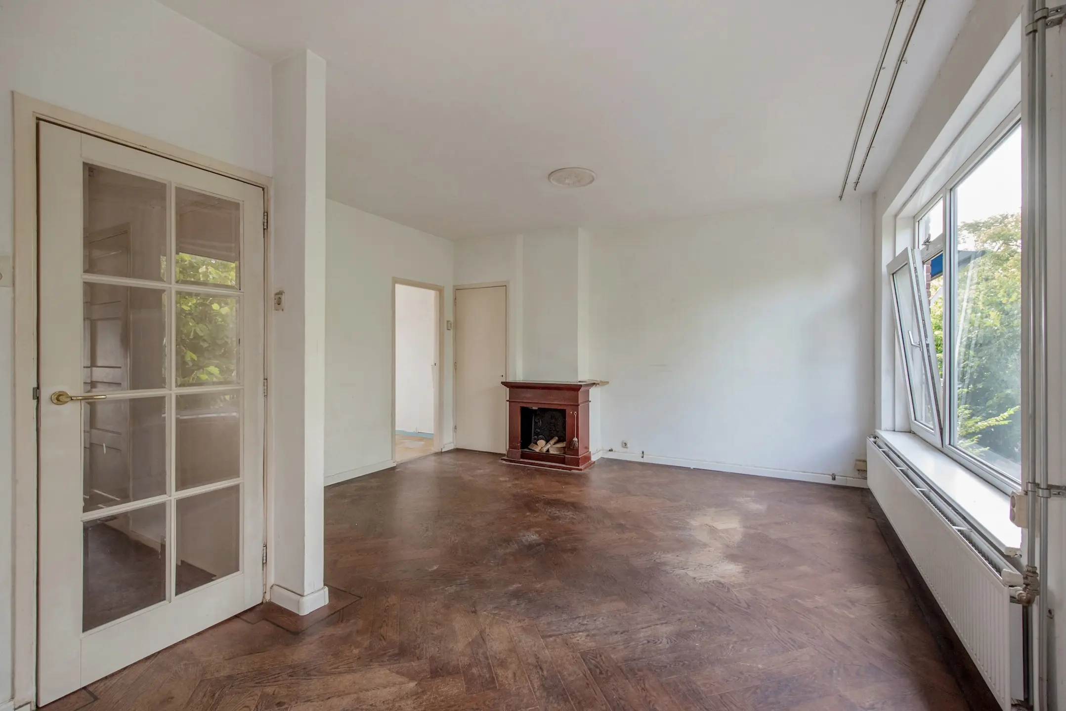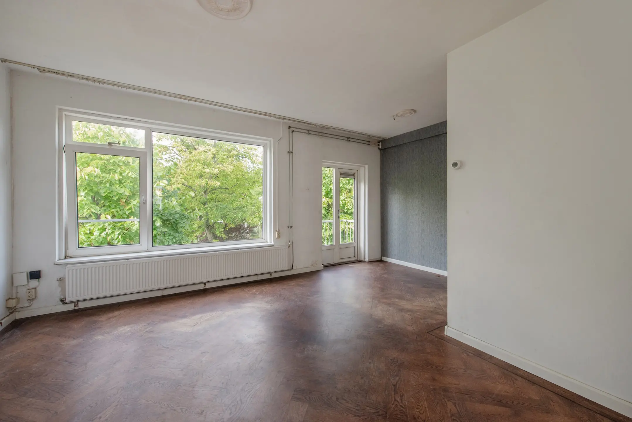 Zeer lichte woon-/eetkamer (doorgebroken, oorspronkelijk 2 kamers) met bergkast en grote raampartijen, doorloop naar de eetkamer.
