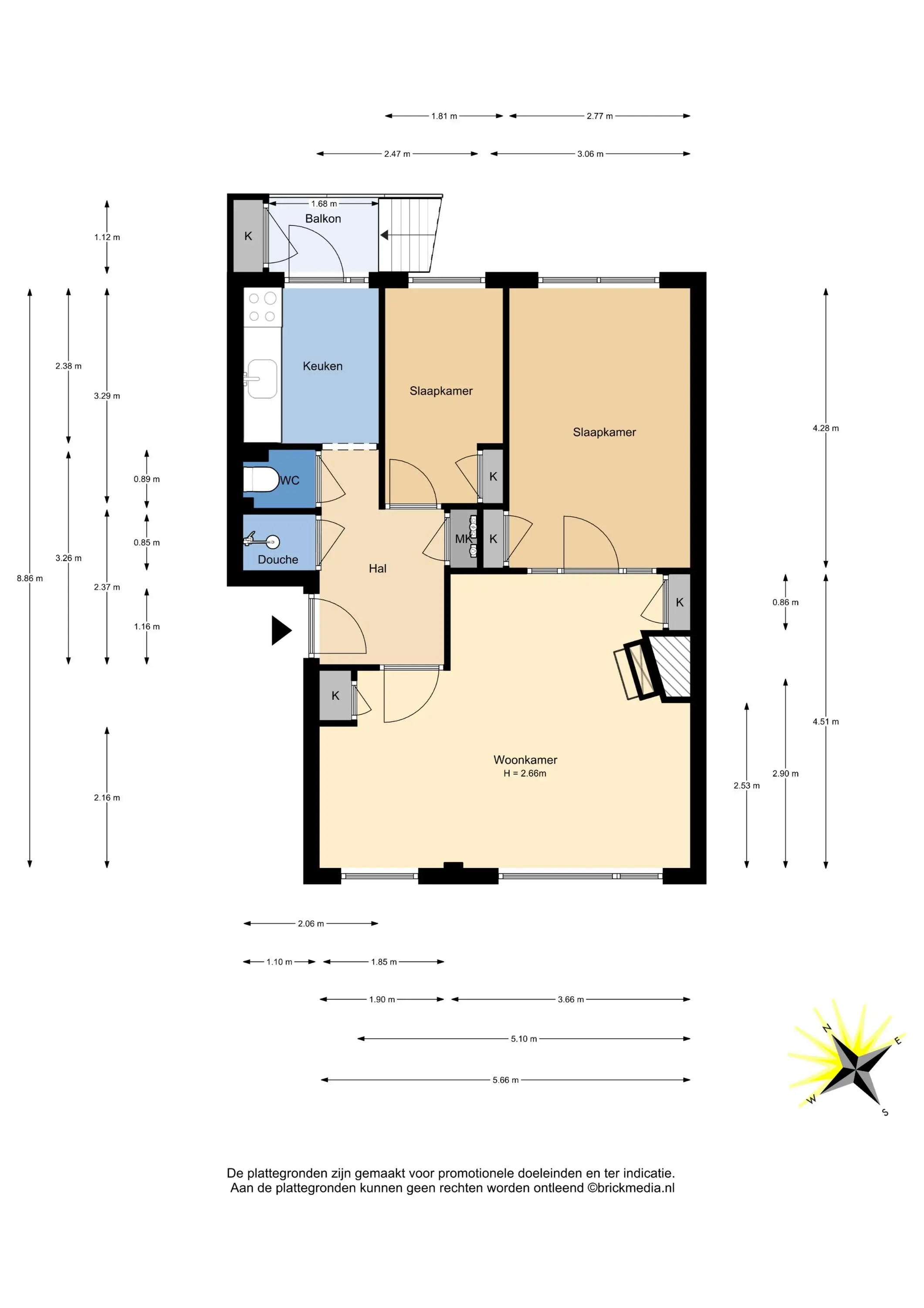 "Bovenstaande  informatie is door ons met de hoogst nodige zorgvuldigheid samengesteld. Door ons wordt echter geen enkele aansprakelijkheid aanvaard voor enige onvolledigheid, onjuistheid of anderszins, dan wel de gevolgen daarvan. Alle opgegeven maten en oppervlakten zijn indicatief. De woning is gemeten met gebruikmaking van de Meetinstructie, die is gebaseerd op de normen zoals vastgelegd in NEN 2580. De Meetinstructie is bedoeld om een meer eenduidige manier van meten toe te passen voor het geven van een indicatie van gebruiksoppervlakte. De Meetinstructie sluit verschillen in meetuitkomsten niet volledig uit, door bijvoorbeeld interpretatieverschillen, afrondingen of beperkingen bij het uitvoeren van de meting. Hoewel wij de woning zorgvuldig hebben opgemeten, wordt noch door ons kantoor, noch door de verkoper enige aansprakelijkheid aanvaard voor afwijkingen in de opgegeven maten. Koper wordt in de gelegenheid gesteld om de opgegeven maten te (laten) controleren”.