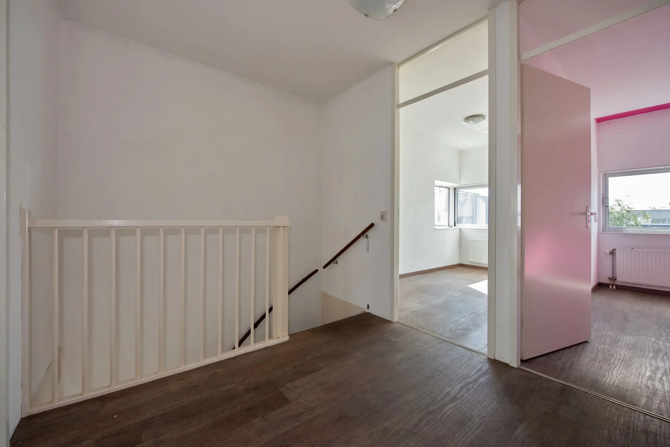 1e verdieping: ruime overloop, voorgelegen hoofdslaapkamer over de volle breedte van ca. 515x305, achtergelegen slaapkamer van ca. 295x295, badkamer (geheel betegeld) voorzien van douche met rainshower, vrij hangend toilet, wastafelmeubel en opstelplaats voor wasmachine en droger, door hoekligging een extra lichte slaapkamer aan de achterzijde van ca. 360x215.