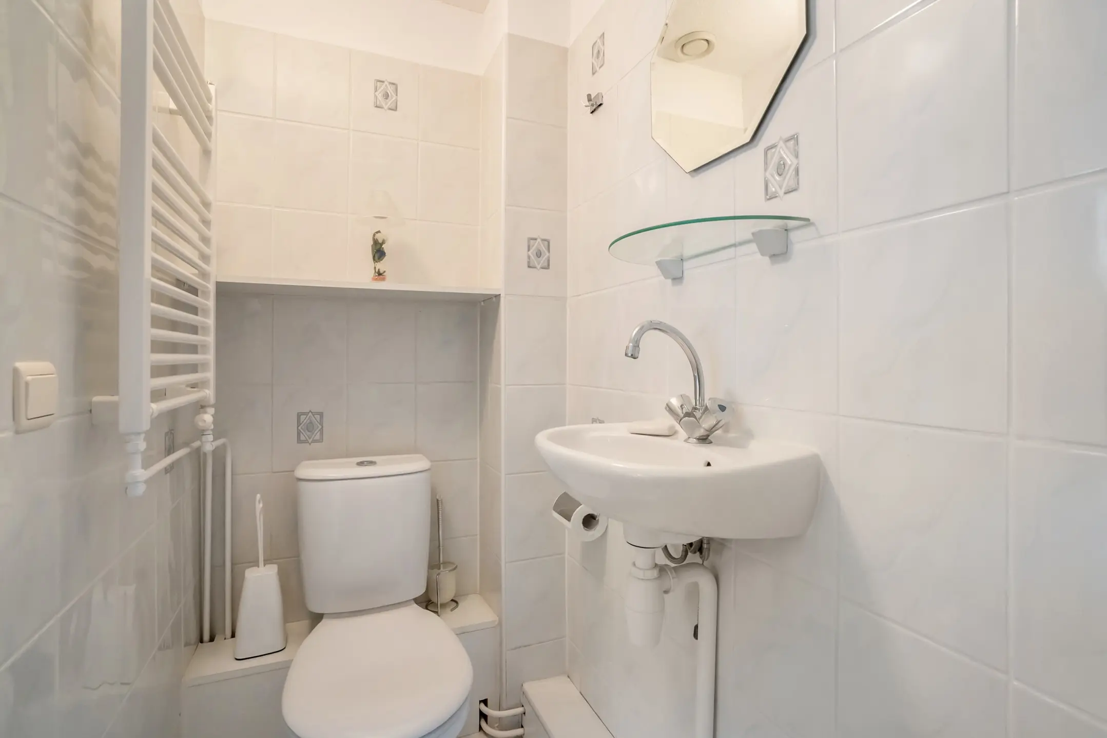 De tweede badkamer is uitgerust met een toilet, douche, wastafel en een designradiator.