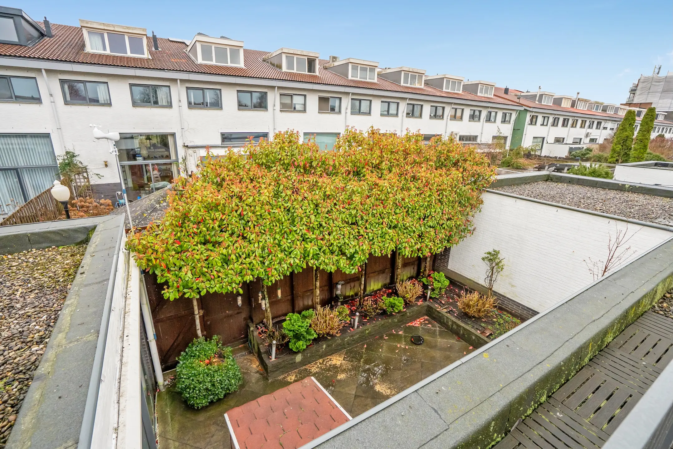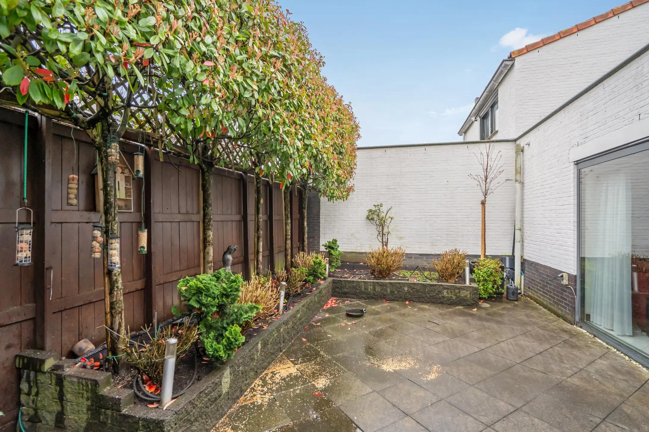 De patio beschikt over elektra, een buitenkraan, een elektrisch zonnescherm en een achterom. Daarnaast is er een houten schuurtje aanwezig voor extra opslag.