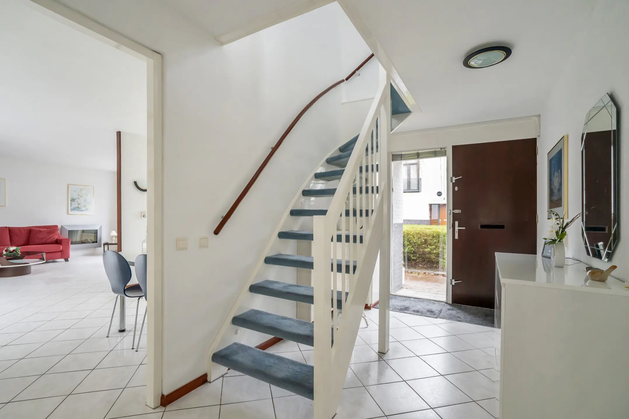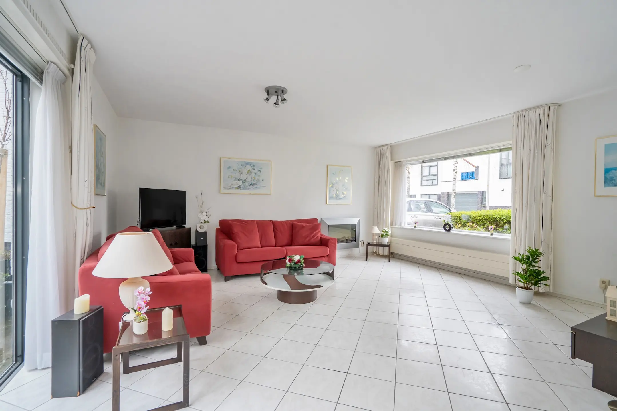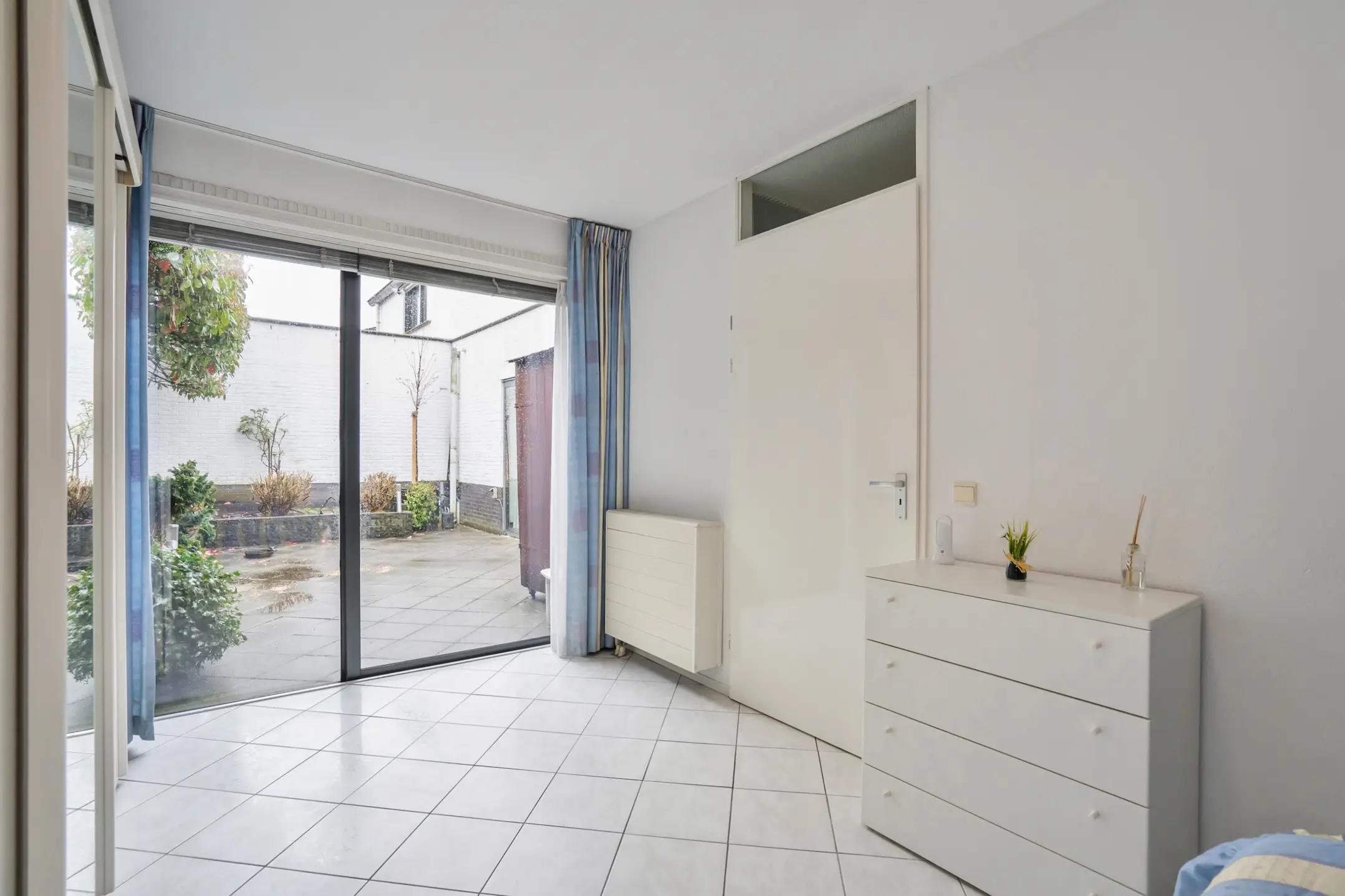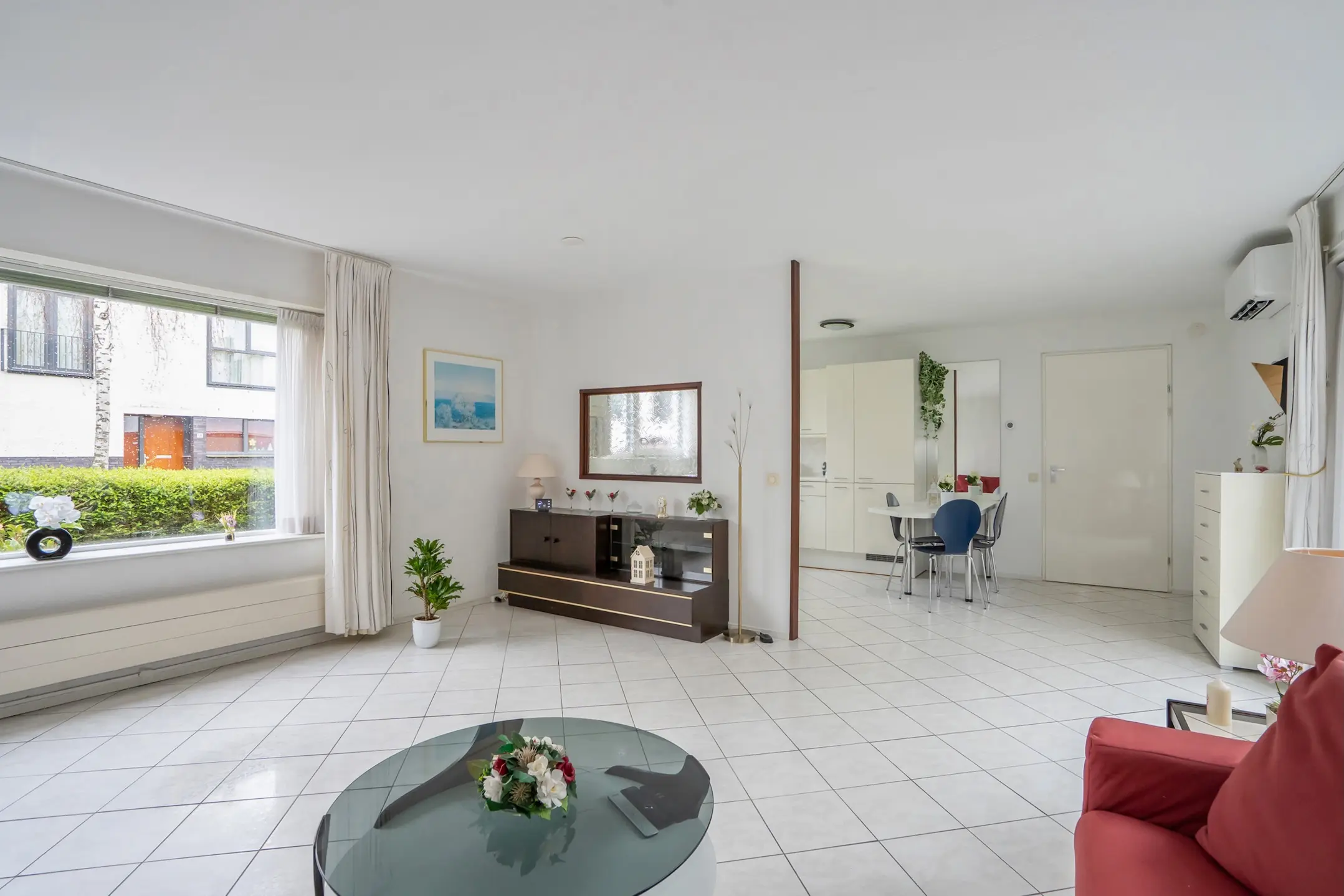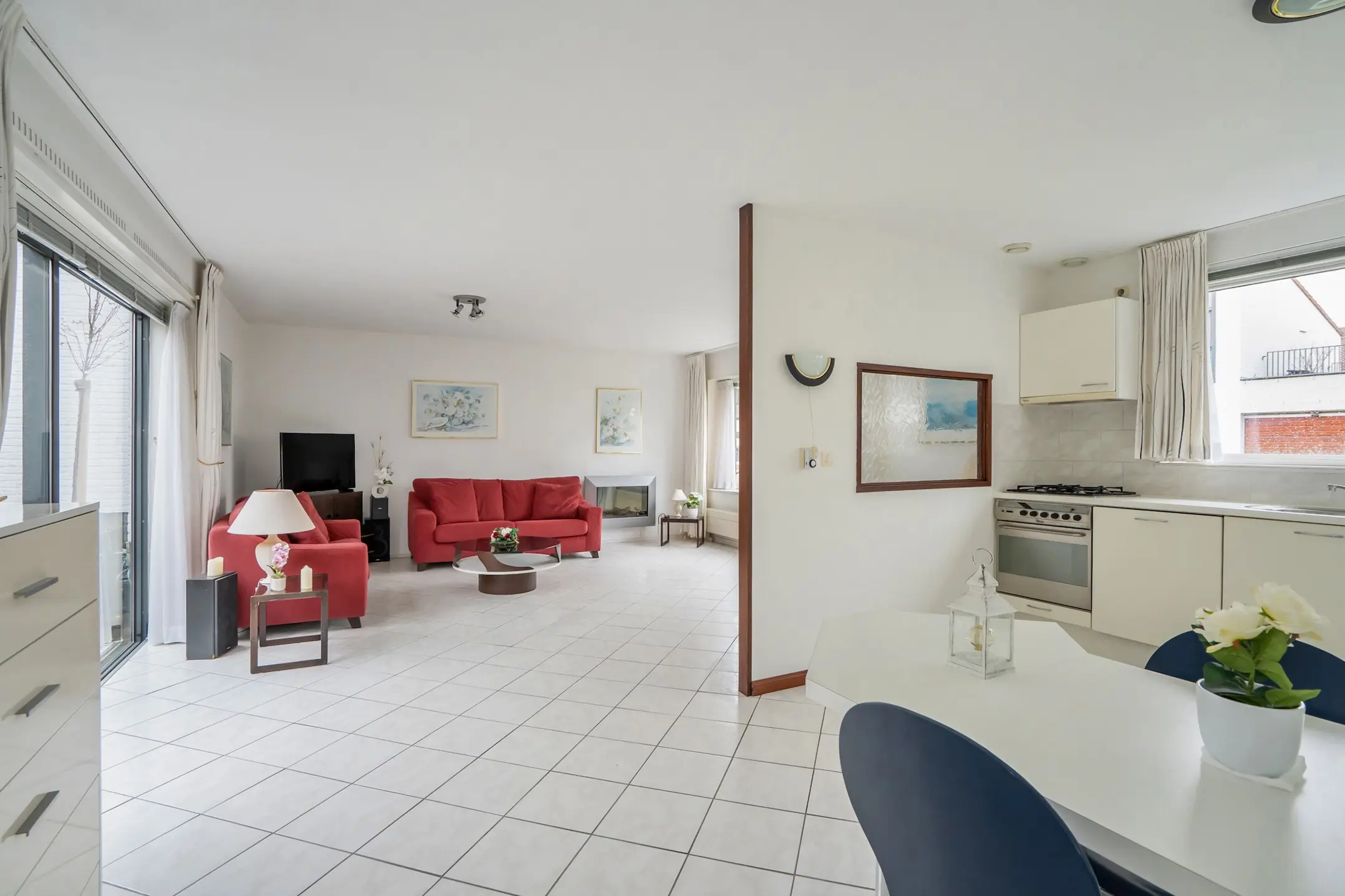 De ruime woonkamer is afgewerkt met witte plavuizen en voorzien van vloerverwarming. Via een schuifdeur heeft u toegang tot de patio.