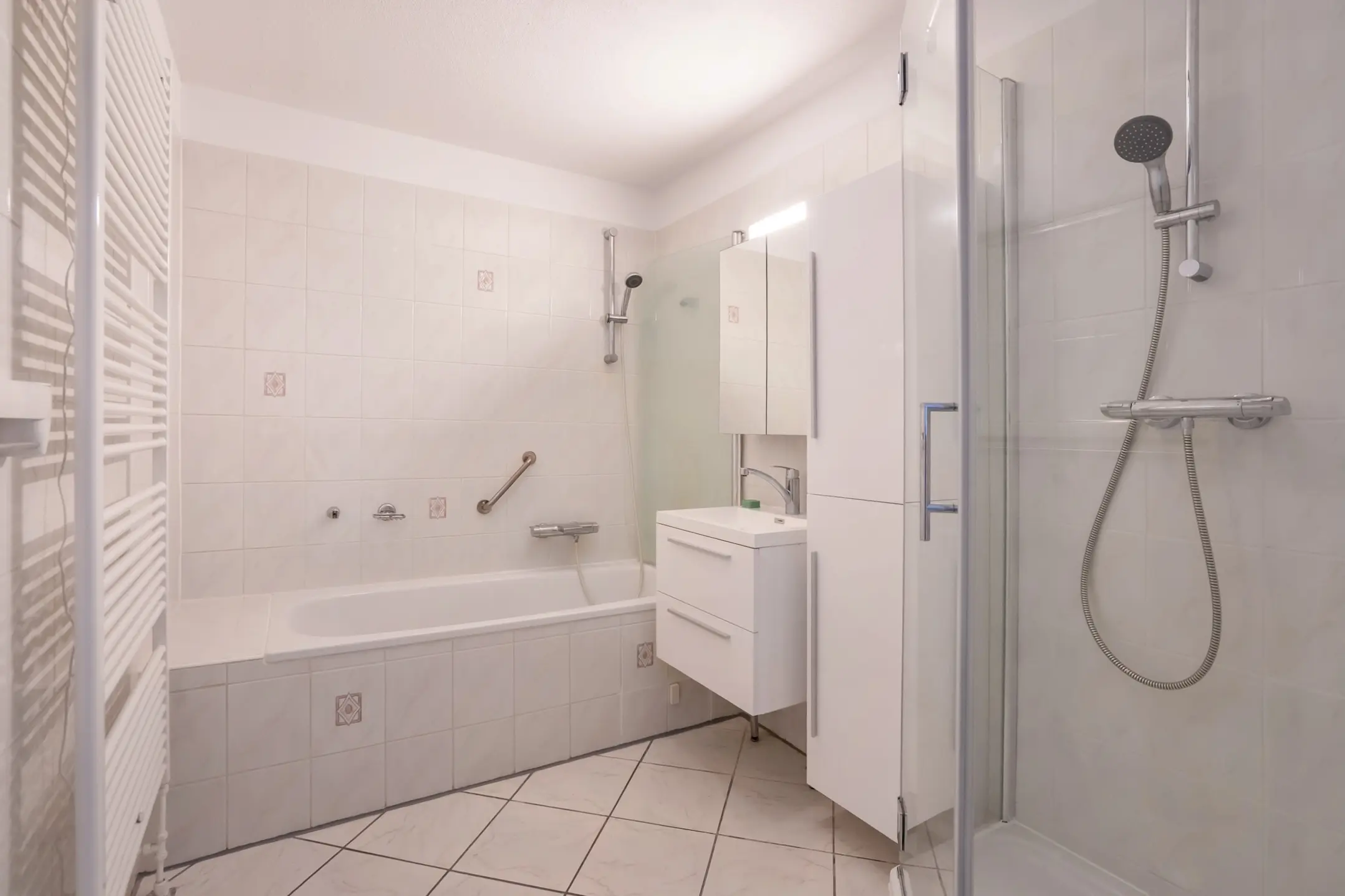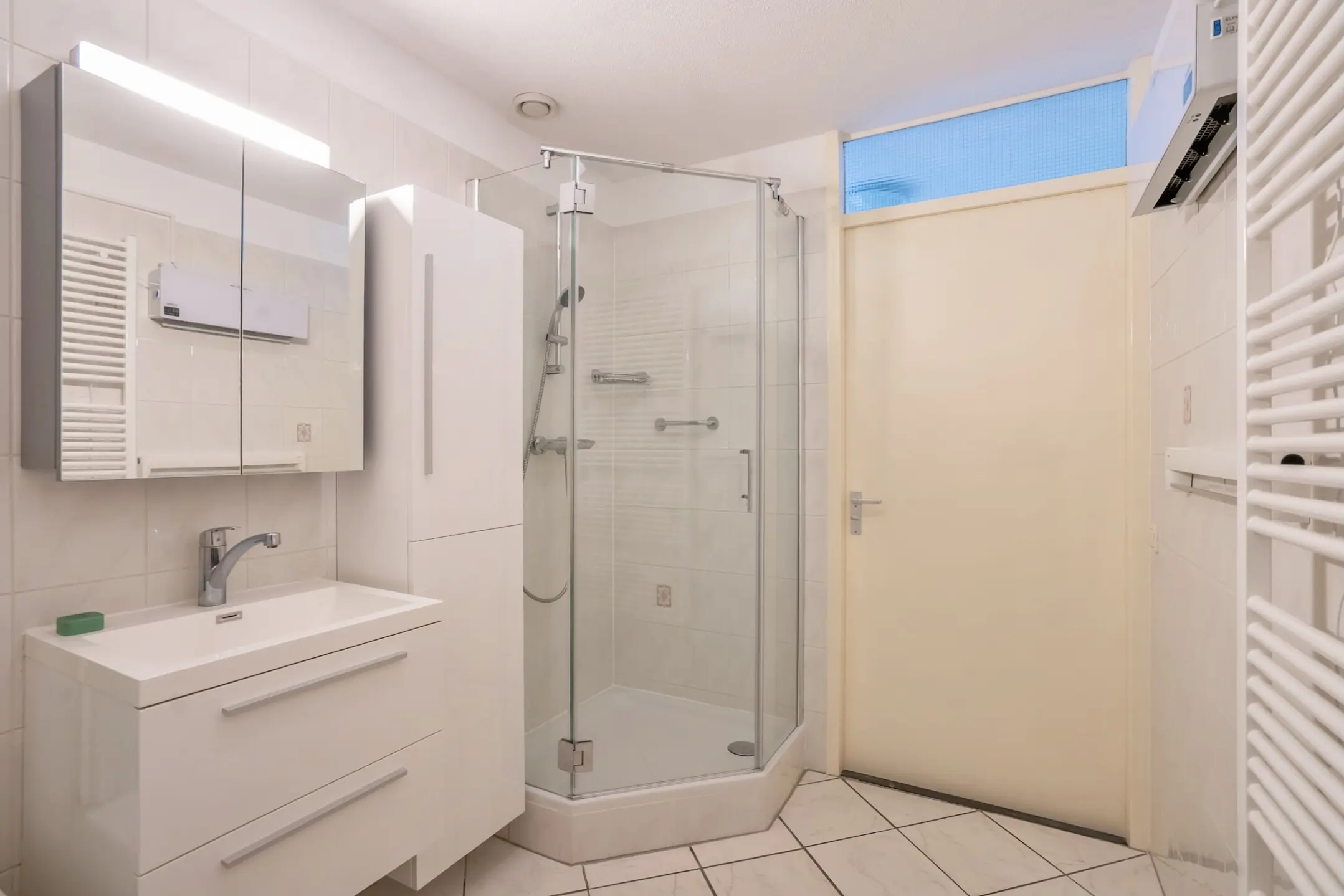 De eerste badkamer is volledig betegeld en uitgerust met een douchehoek, ligbad met mengkraan, wastafelmeubel, designradiator en een verwarmingsunit van Eurom.