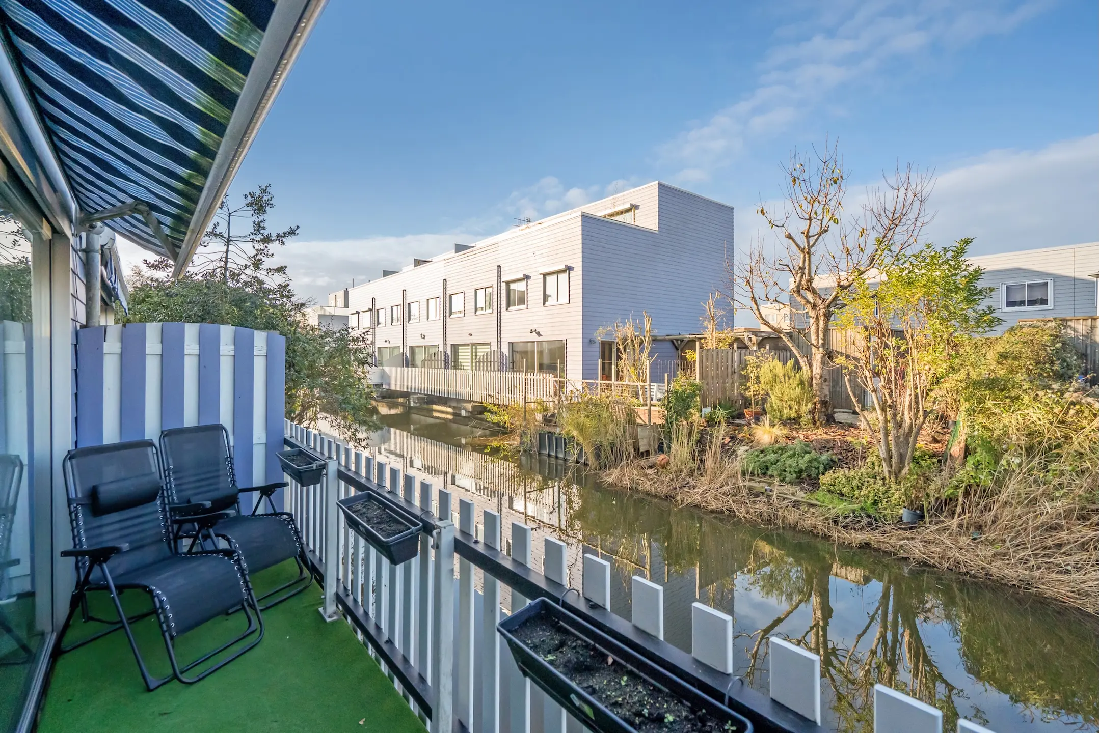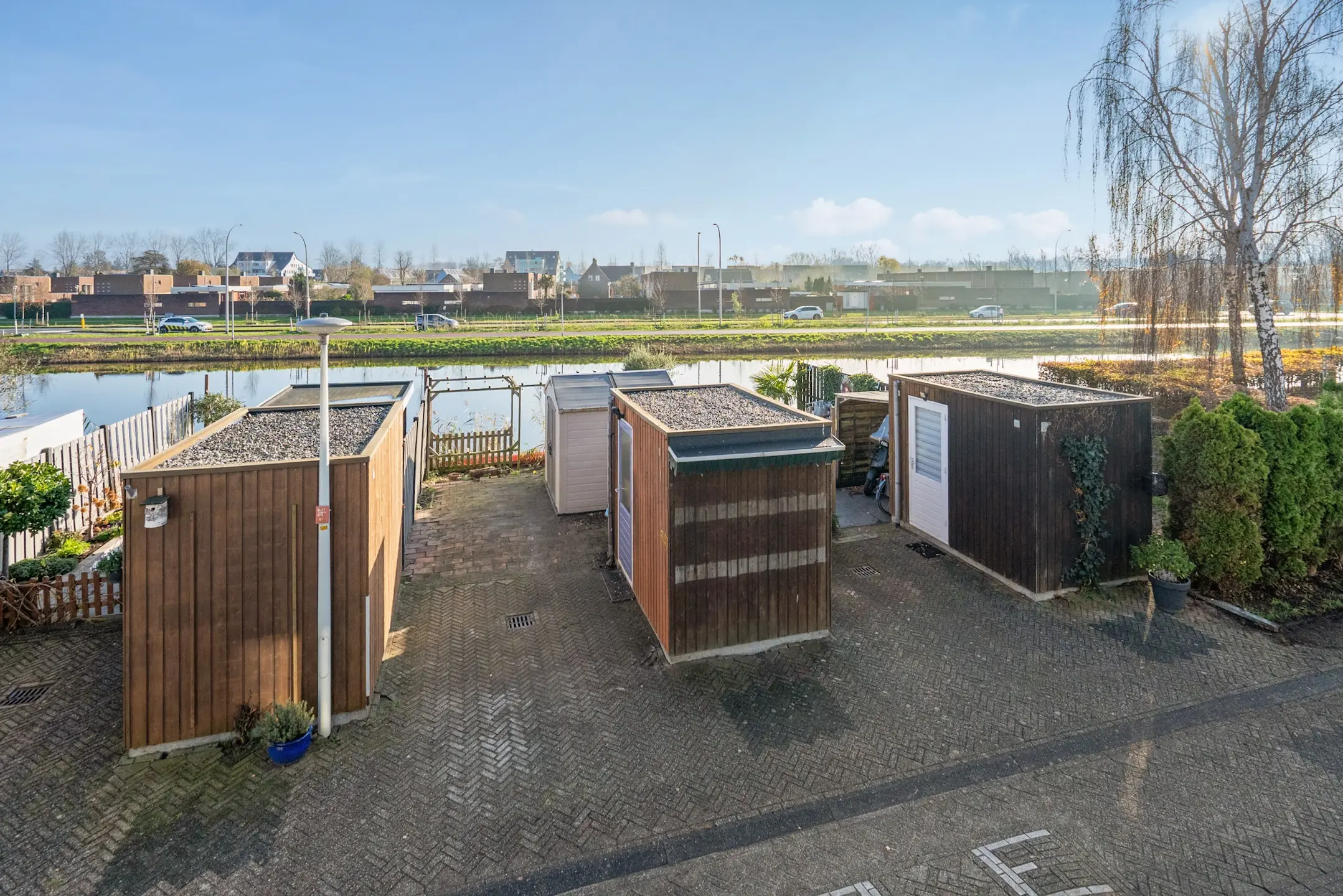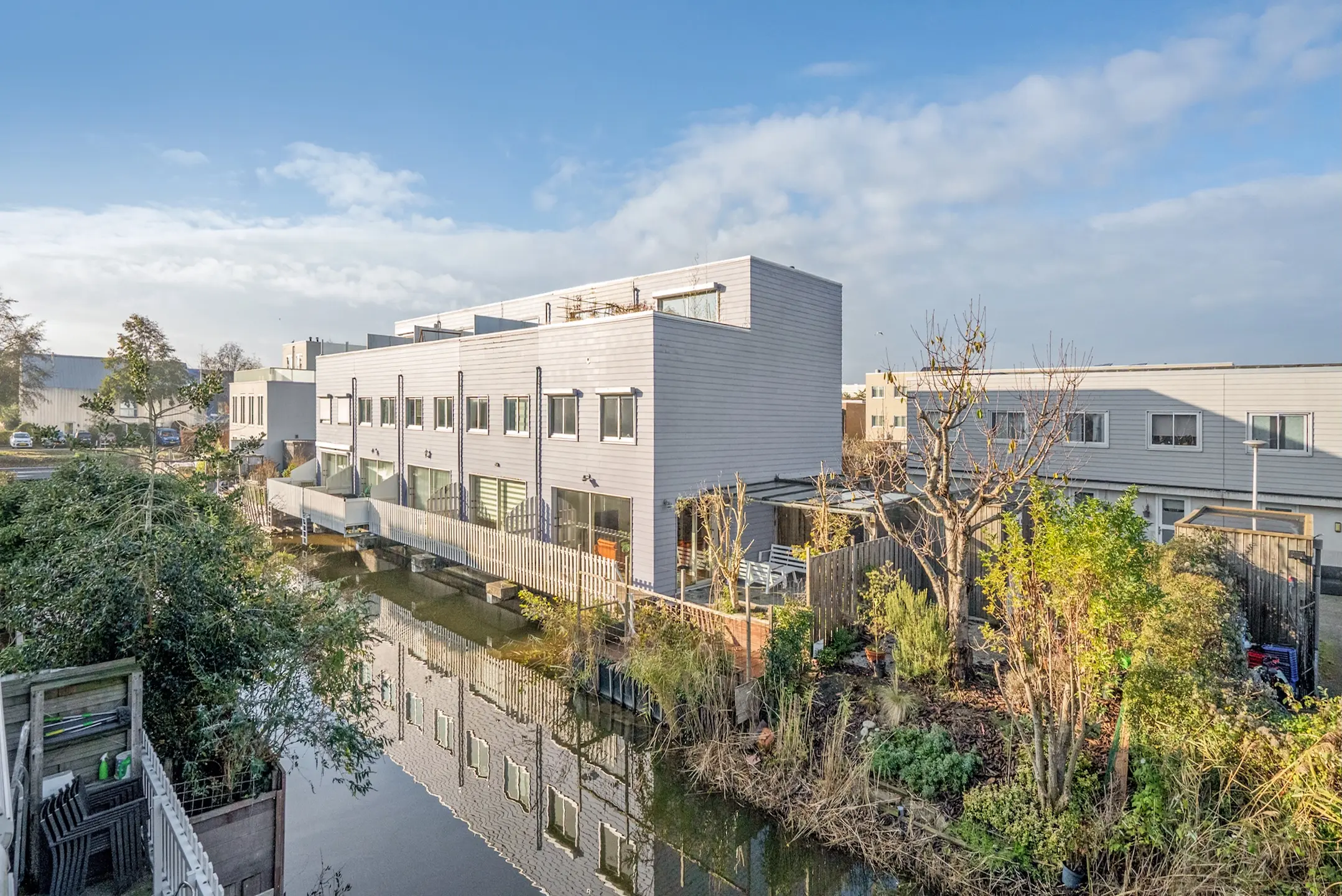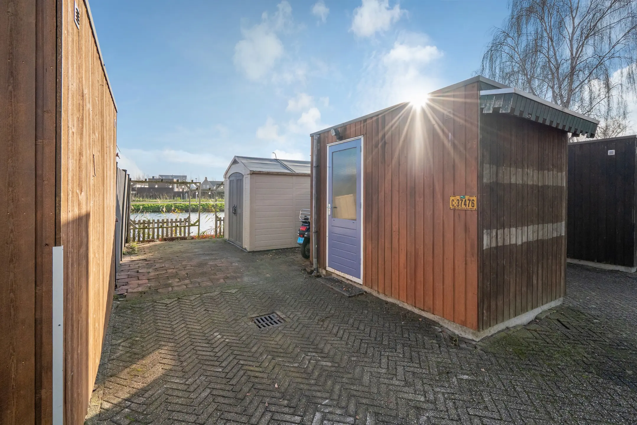 Aan de voorzijde bevindt zich de tuin, gelegen aan het water, met privéparkeerplaats en 2 bergingen. Fraai uitzicht met vlonders.