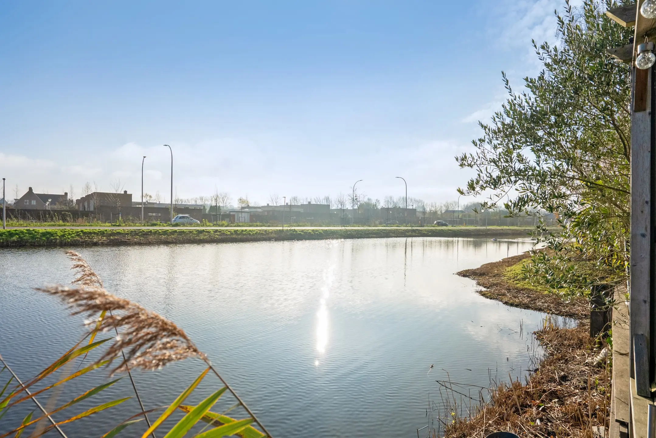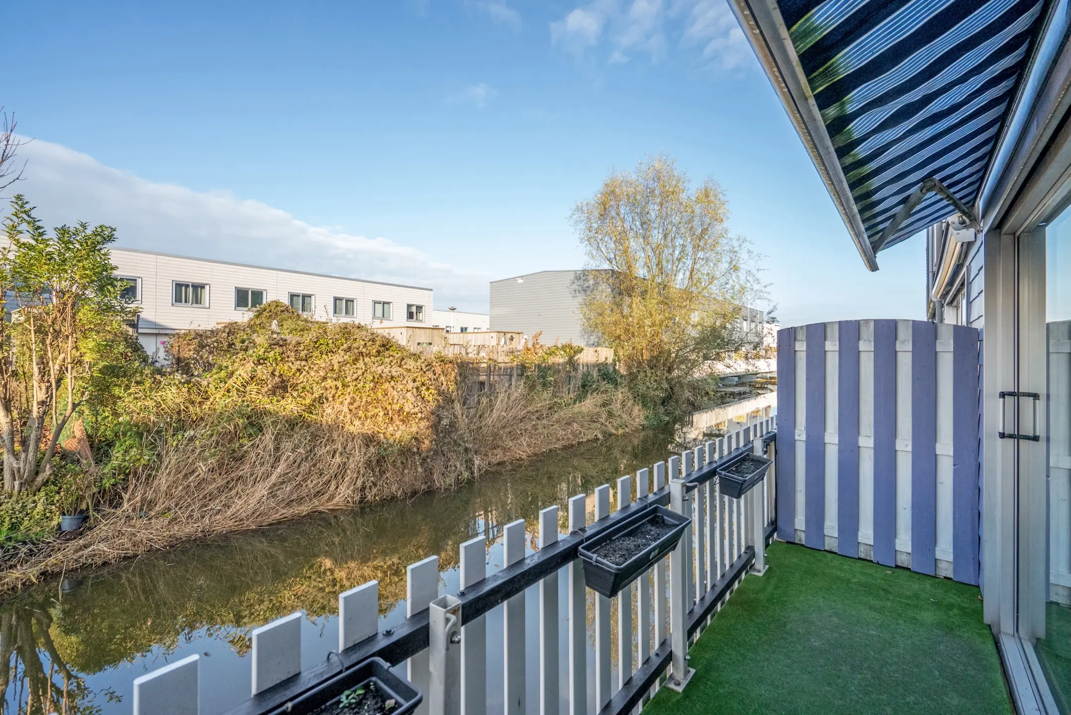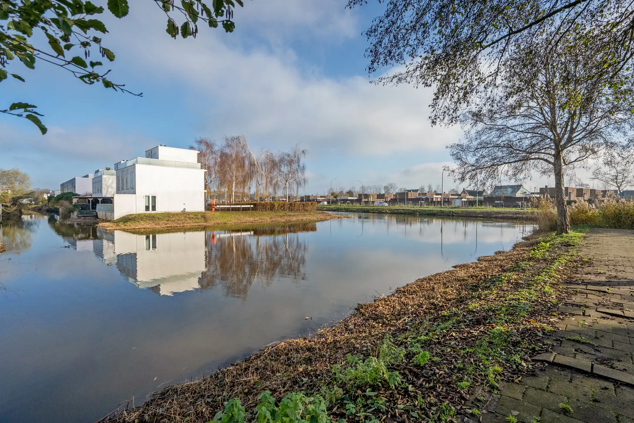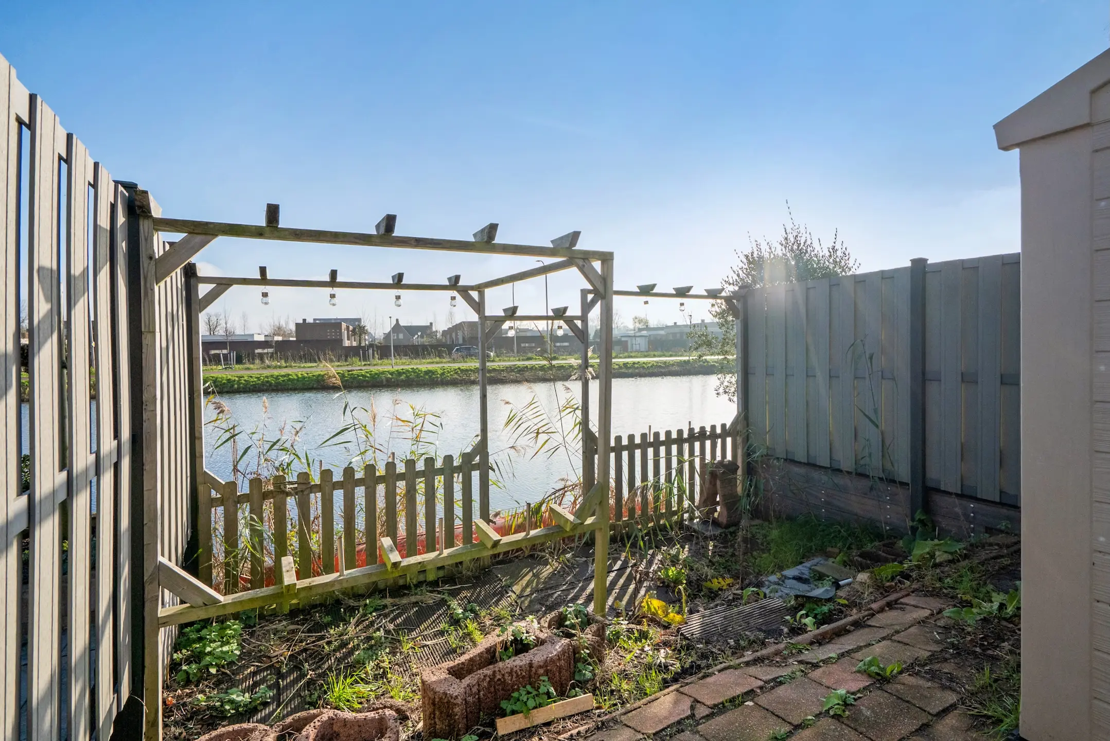 Aan de voorzijde bevindt zich de tuin, gelegen aan het water, met privéparkeerplaats en 2 bergingen. Fraai uitzicht met vlonders.