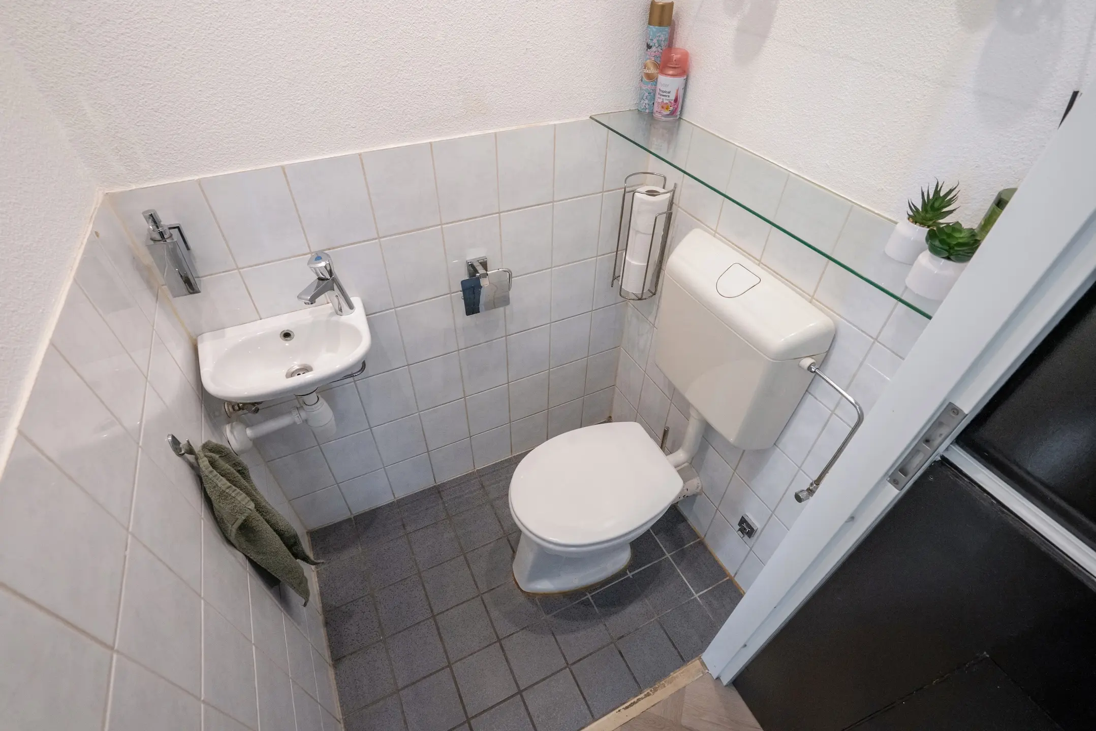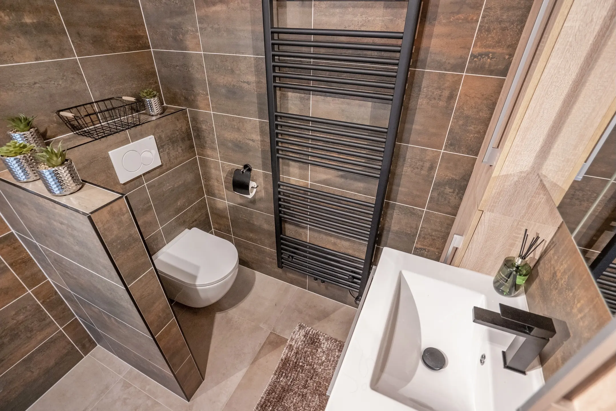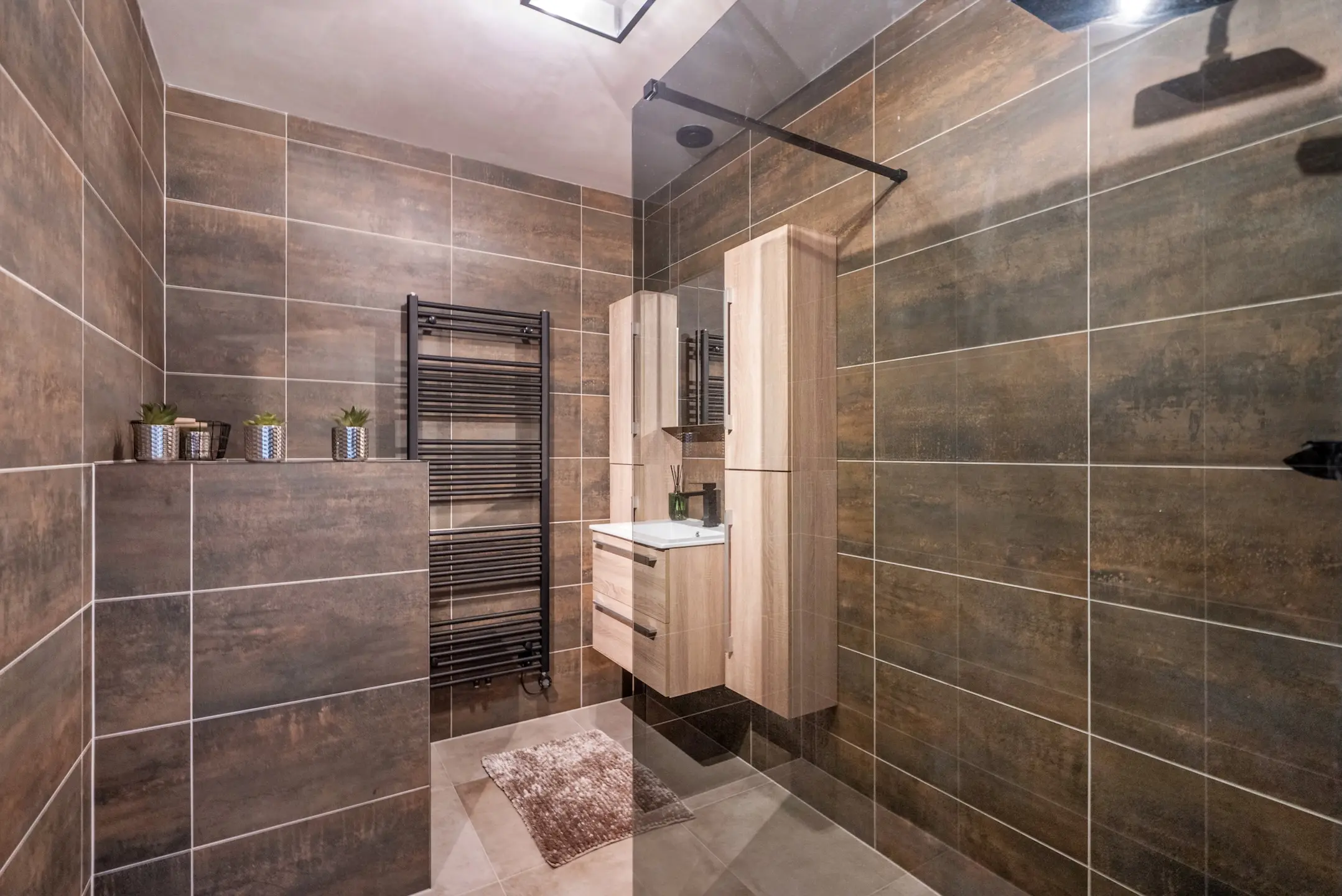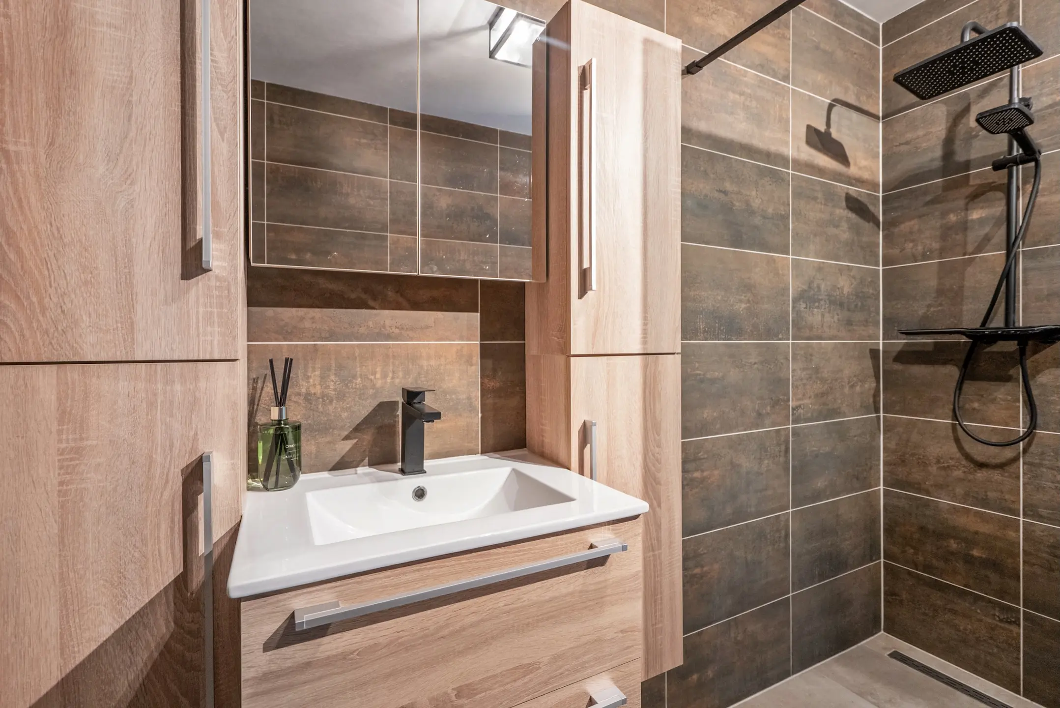 Geheel voorzien van modieuze wand- en vloertegels, moderne inloopdouche met hand- en regendouche, wastafelmeubel, spiegelkast, modern toilet, designradiator en ventilatie.