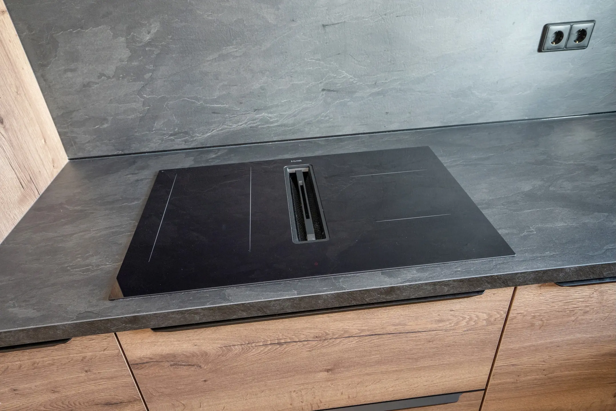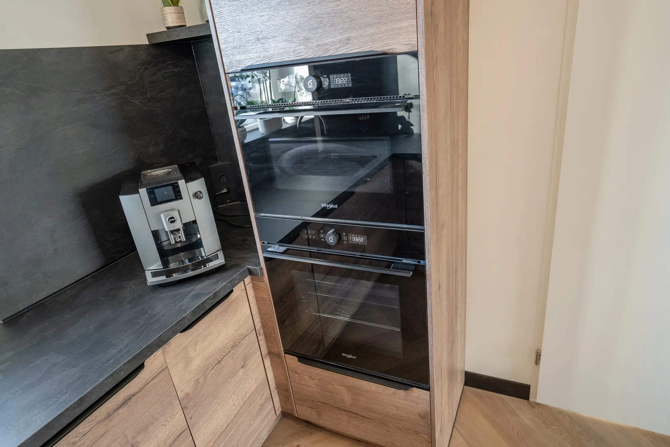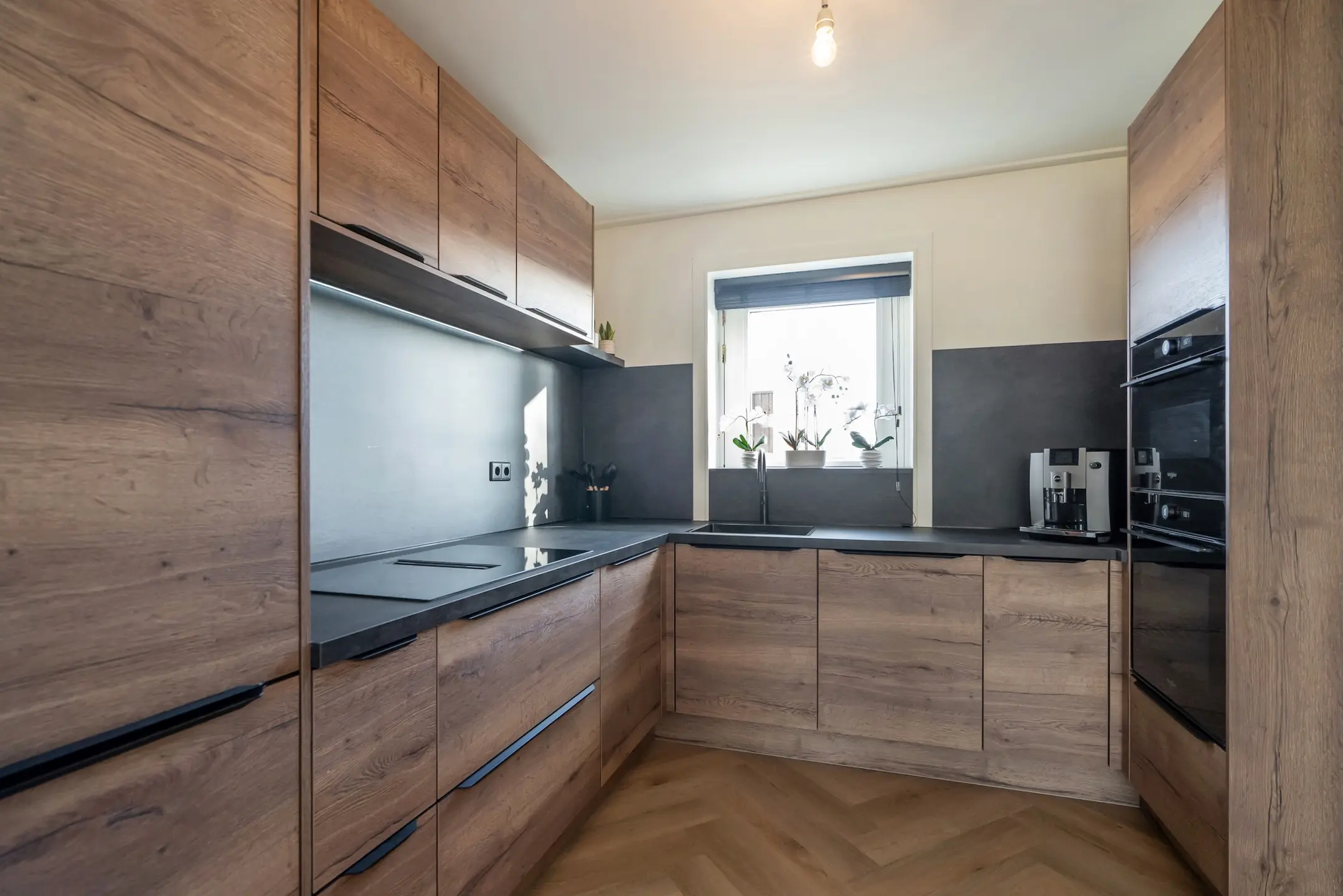L-vormige opstelling, houtkleurige fronten, zwart aanrechtblad, 4-pits inductiekookplaat met geïntegreerde afzuiging, combi-oven, magnetron, vaatwasser en spoelbak met mengkraan en Quooker.