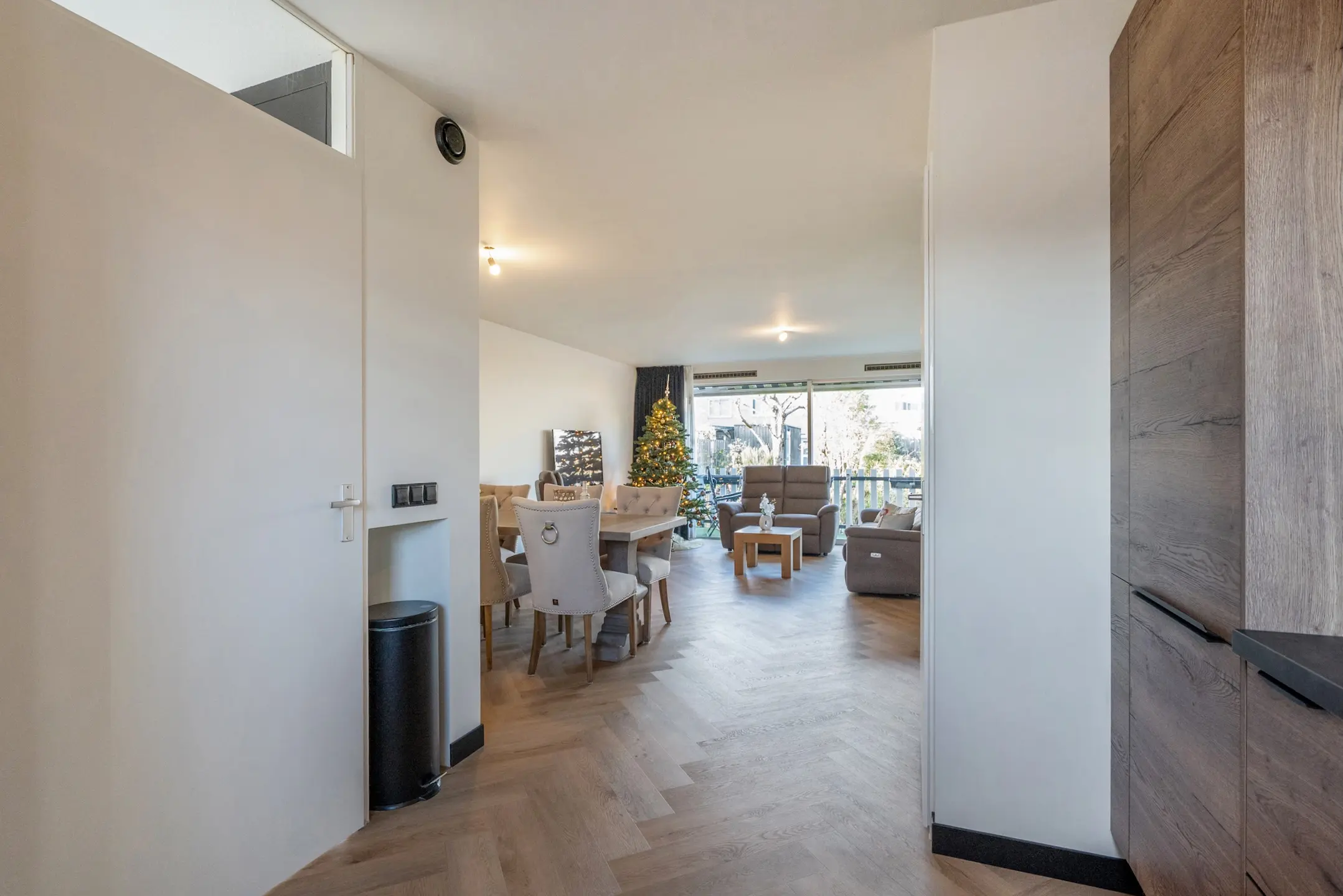 Entree, hal, meterkast (6 groepen a.l.s.), stadsverwarming, vaste kast, toilet met fontein, woon-/eetkamer met vloerverwarming en pvc-vloer in visgraatmotief. Praktische bergkast onder de trap. Schuifpui naar het balkon met uitzicht op de waterpartij en een elektrisch zonnescherm over de gehele breedte. Strak gestuukte wanden en plafonds met fraai schilderwerk.