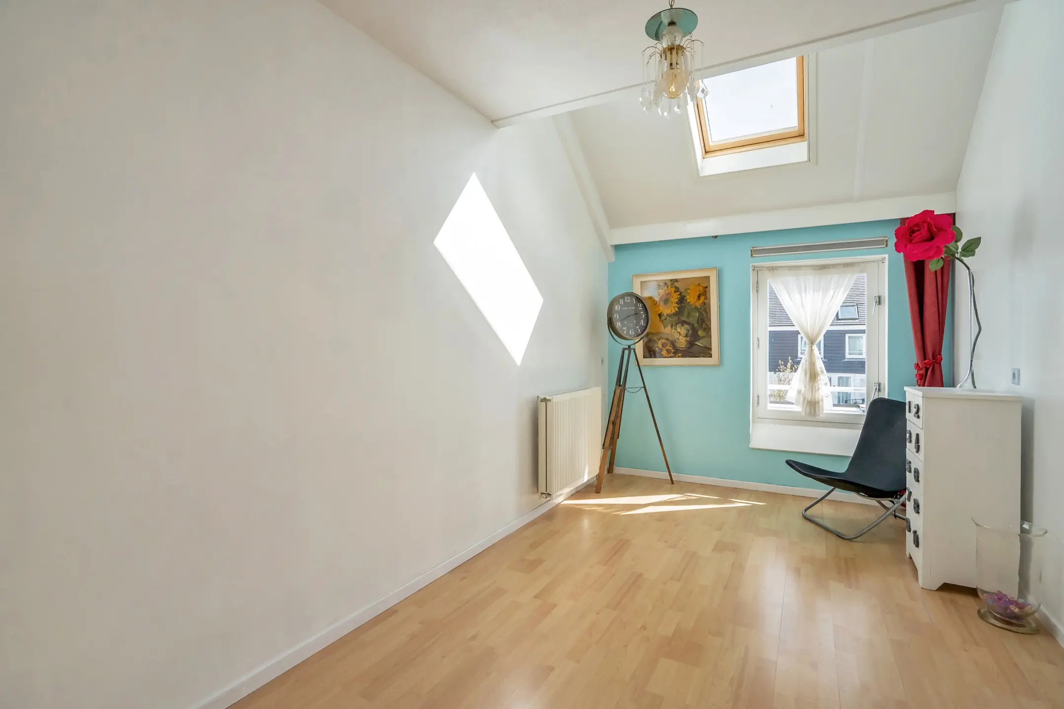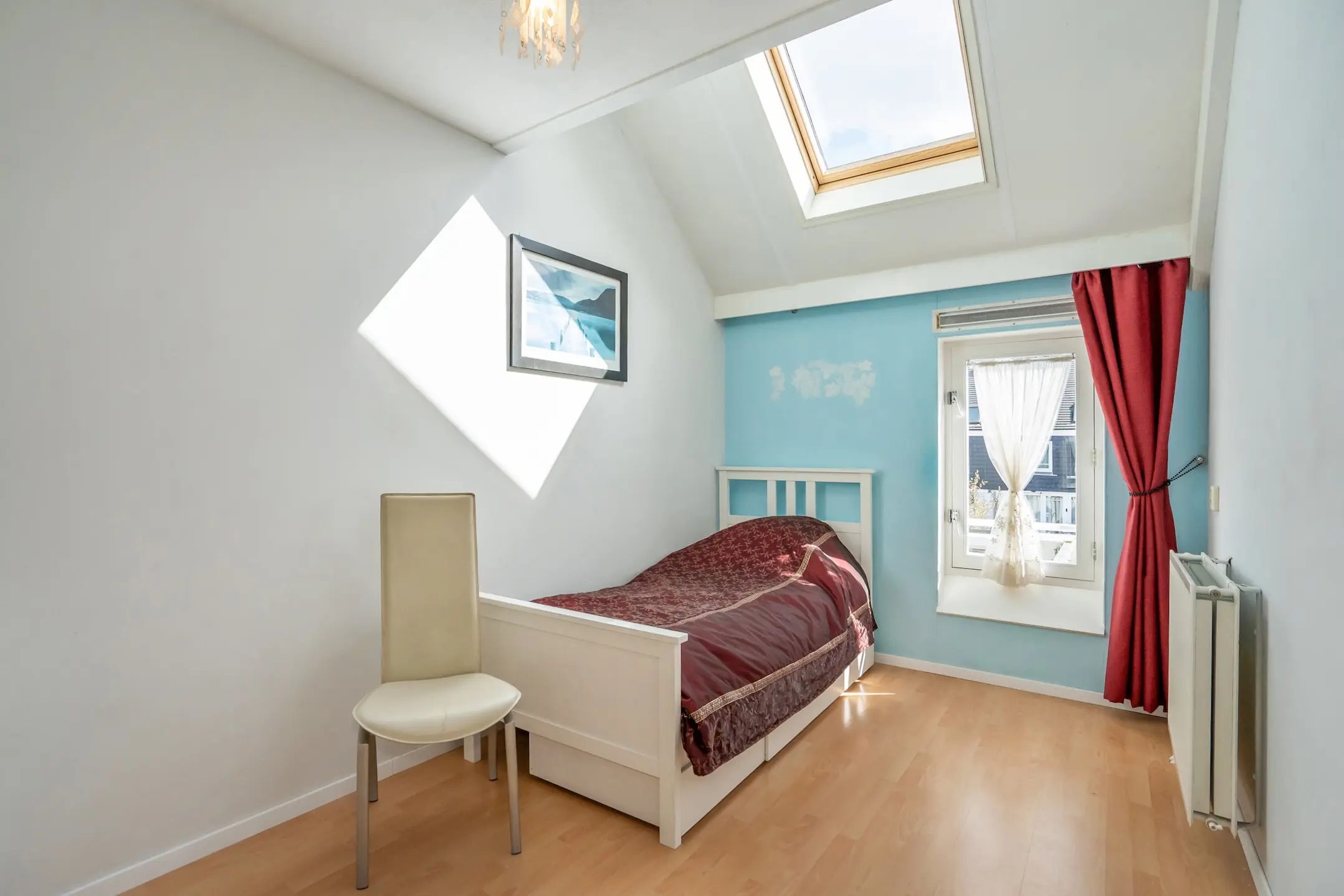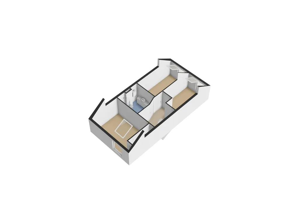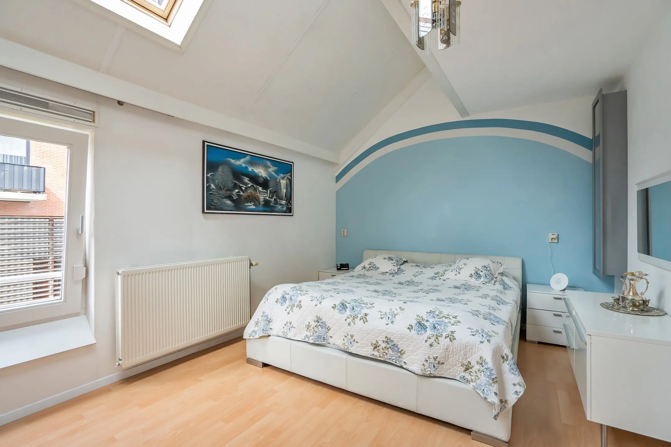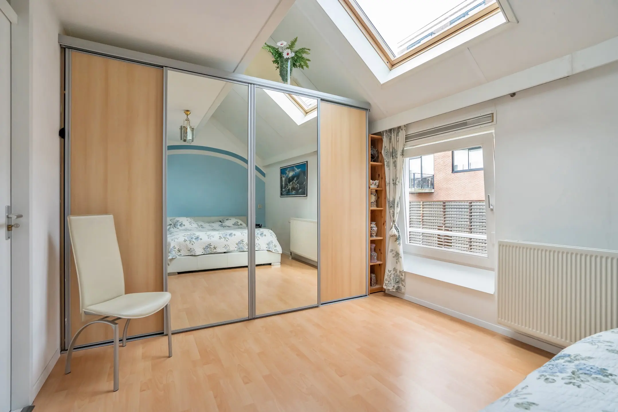 1e verdieping: overloop, royale voorgelegen hoofdslaapkamer over de volle breedte van de woning met speels verspringend plafond, Velux dakraam en vaste kastenwand, ruime achtergelegen slaapkamer met verspringend plafond en Velux dakraam, moderne badkamer (volledig betegeld) met inloop douche, groot wastafelmeubel, design radiator en vrij hangend toilet, 3e slaapkamer aan de achterzijde gelegen met wederom een Velux dakraam. De gehele verdieping is voorzien van een laminaat vloer.
