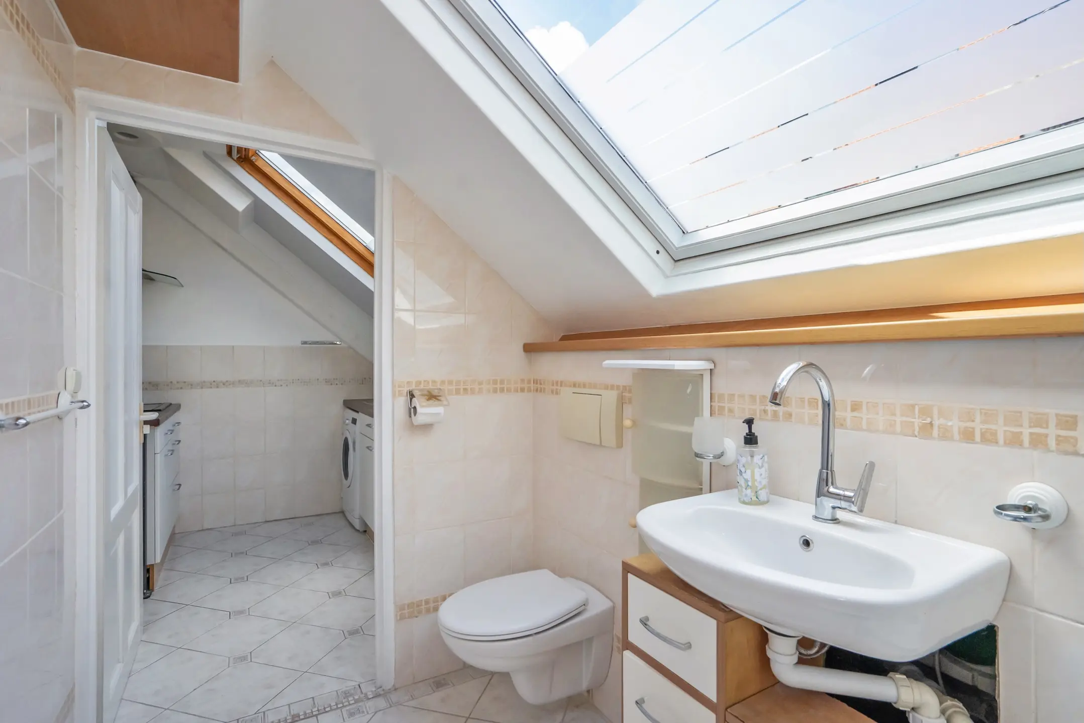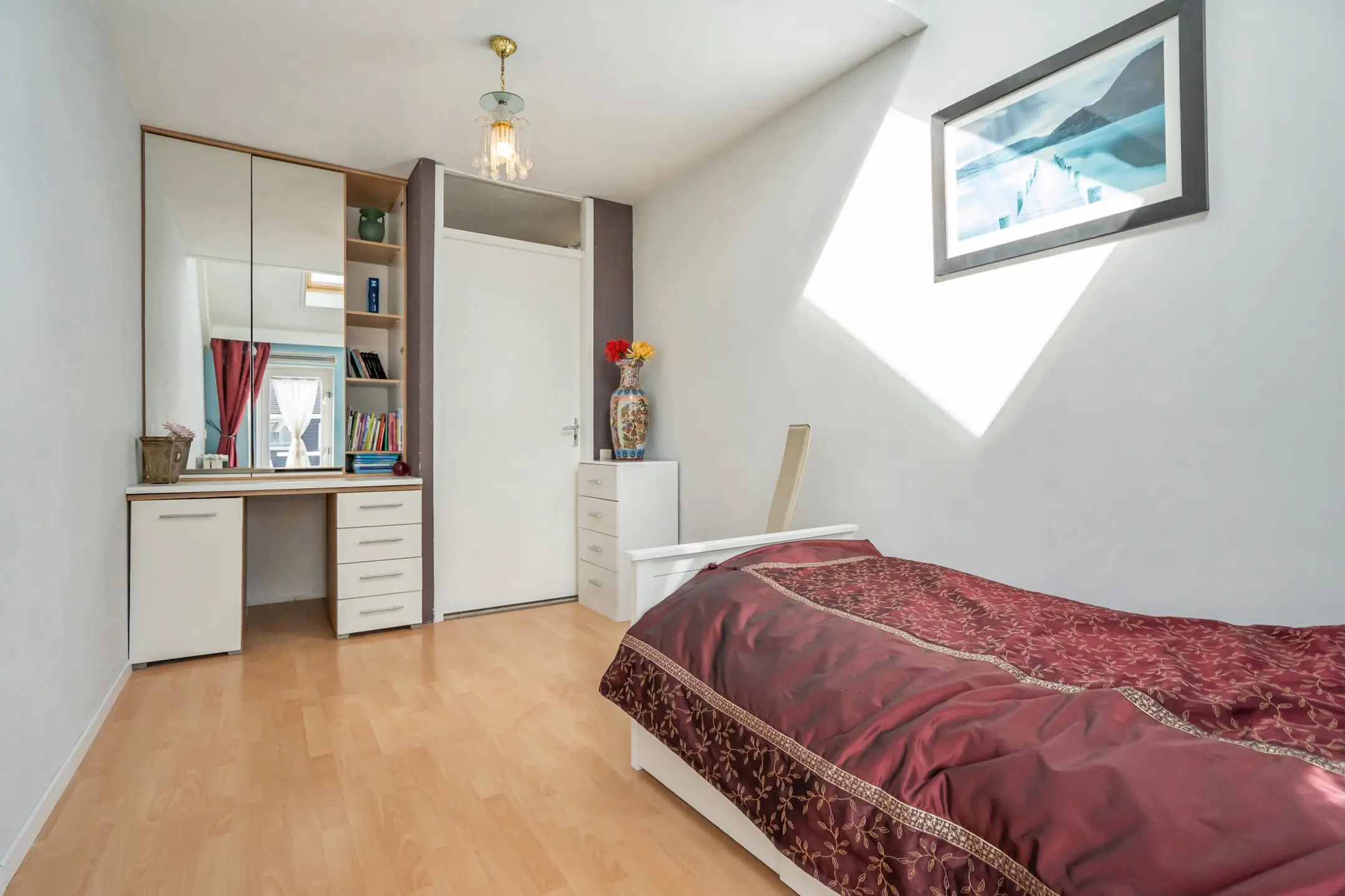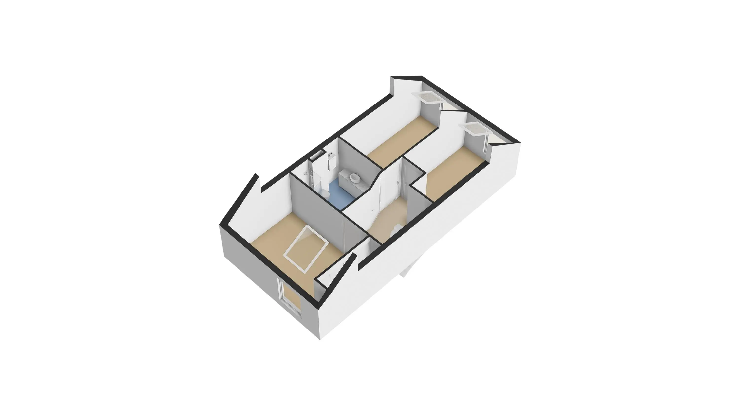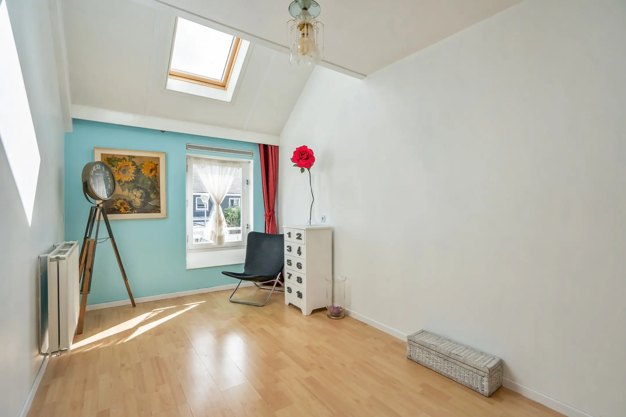 1e verdieping: overloop, royale voorgelegen hoofdslaapkamer over de volle breedte van de woning met speels verspringend plafond, Velux dakraam en vaste kastenwand, ruime achtergelegen slaapkamer met verspringend plafond en Velux dakraam, moderne badkamer (volledig betegeld) met inloop douche, groot wastafelmeubel, design radiator en vrij hangend toilet, 3e slaapkamer aan de achterzijde gelegen met wederom een Velux dakraam. De gehele verdieping is voorzien van een laminaat vloer.
