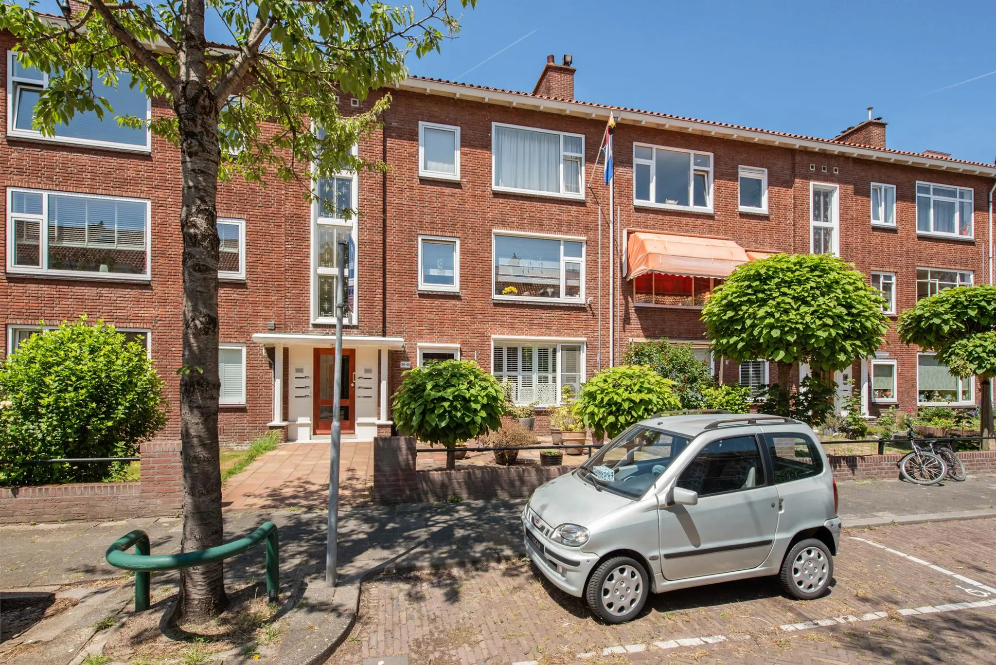 Voortuin met bestrating en border. Afgesloten portiek met brievenbussen en bellentableau. Portiek. Entree benedenwoning. Hal met toilet met vrijdragend closet, garderobenis, meterkast, intercom en voorraadkast.
