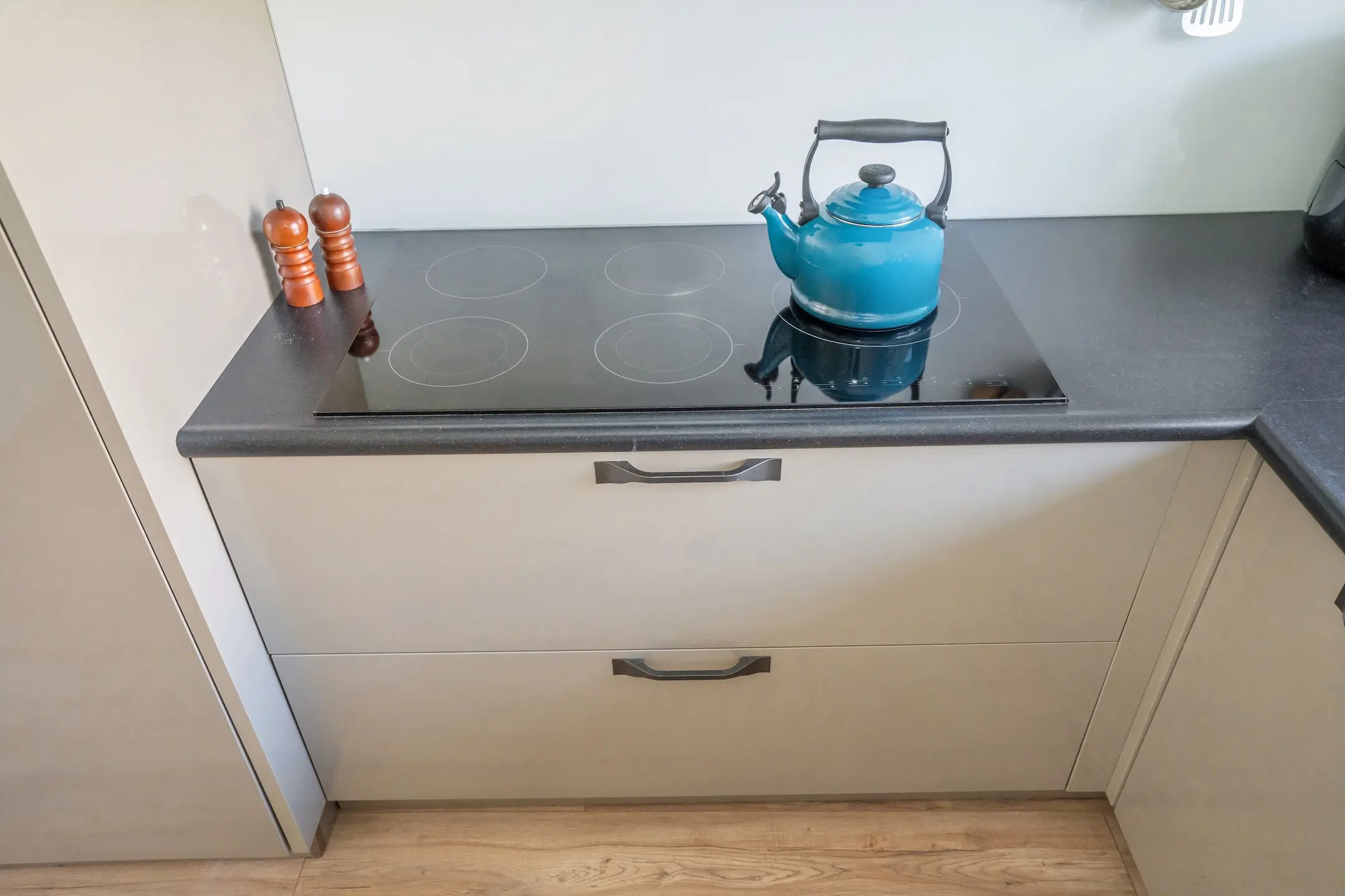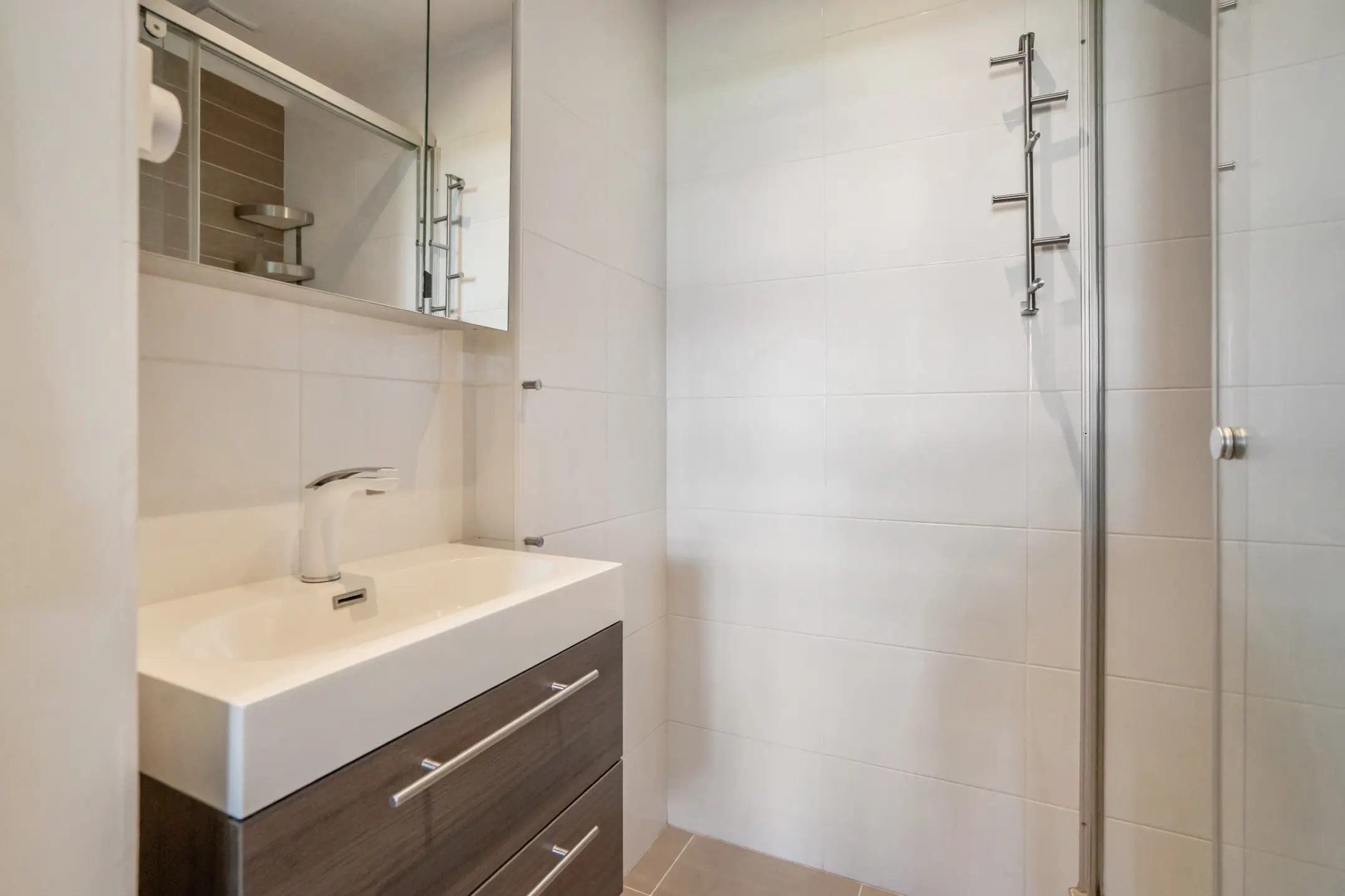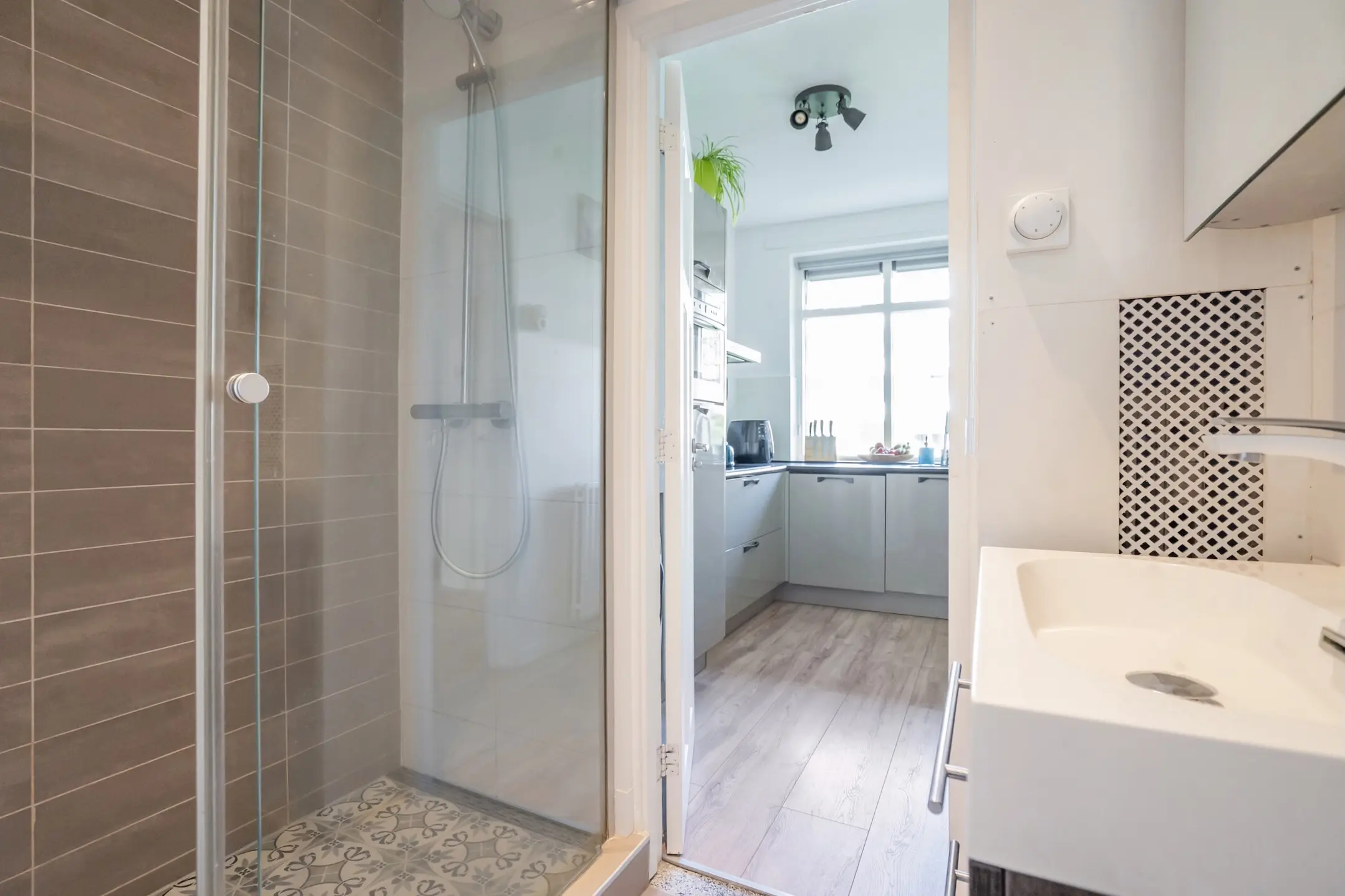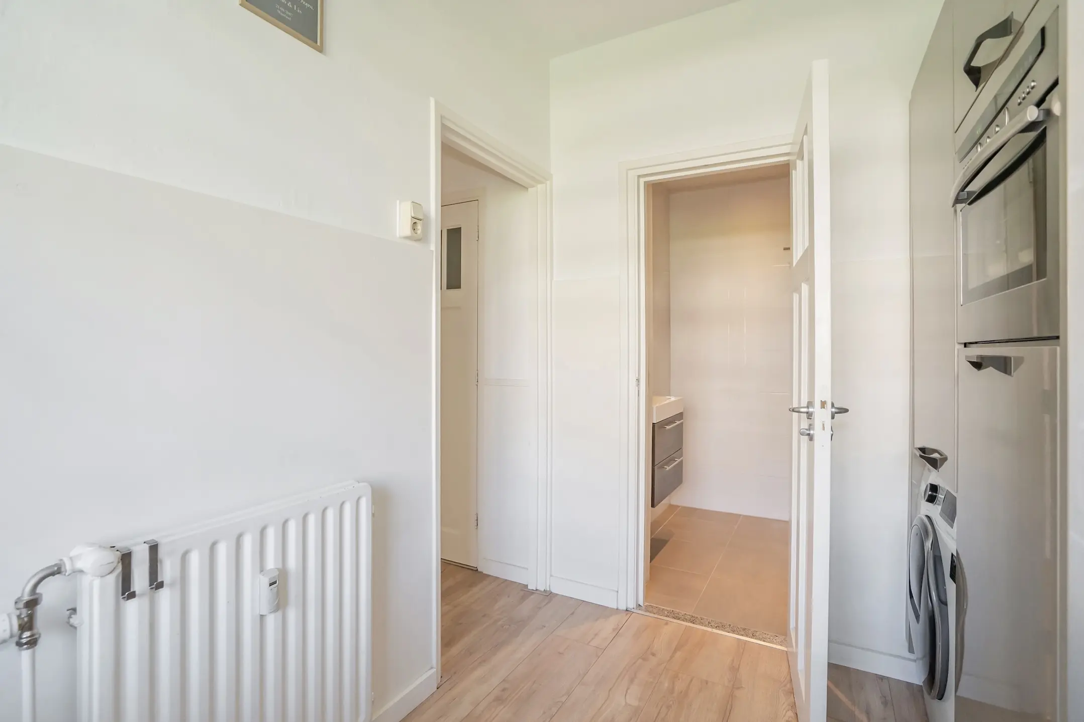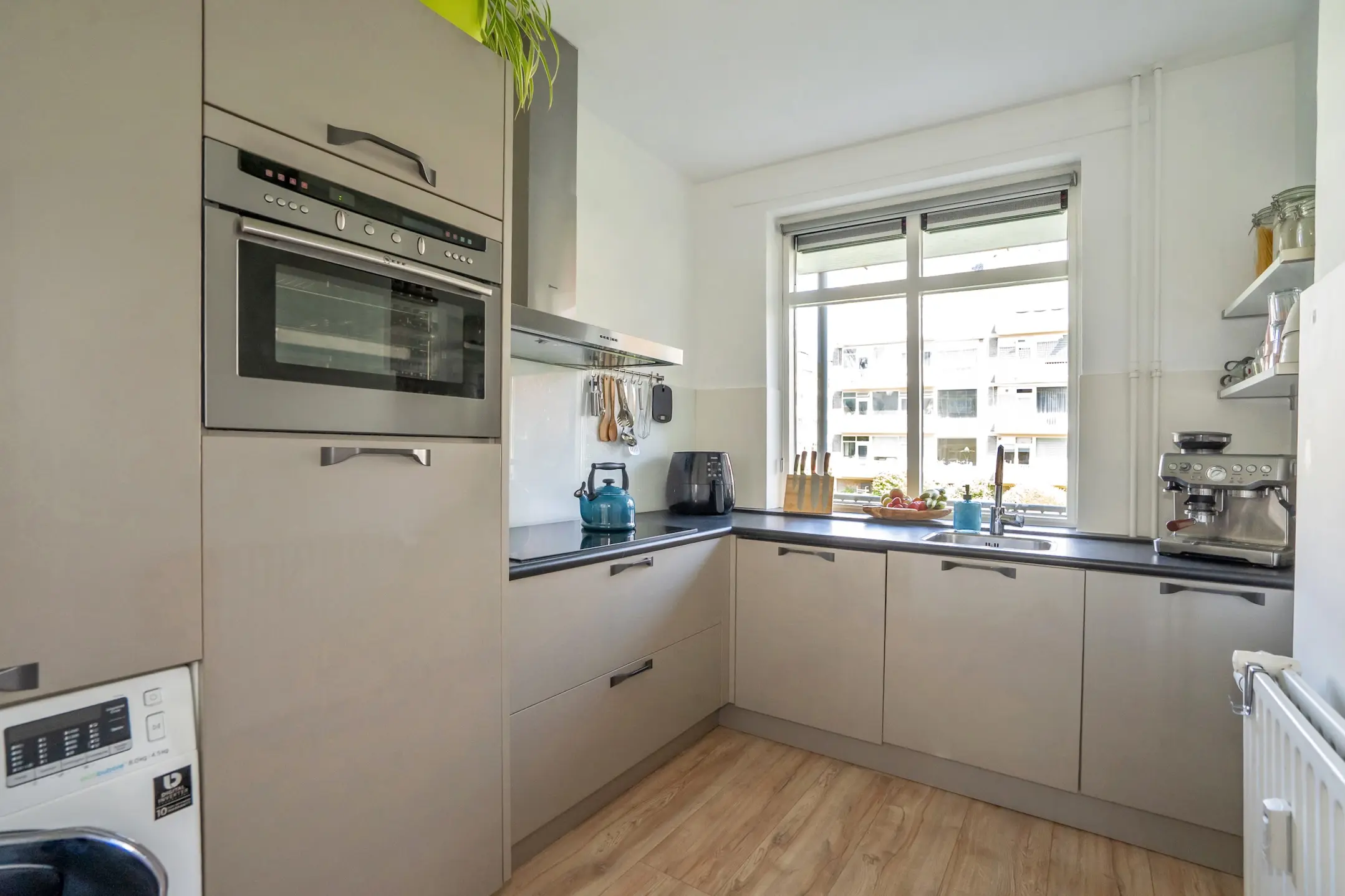 De moderne keuken is bereikbaar via de hal en is praktisch ingericht met onder andere een 5-pits inductiekookplaat, stoomoven, vaatwasser, wasmachineaansluiting en een elektrische boiler. Vanuit de keuken loop je door naar de stijlvolle badkamer, voorzien van een wastafelmeubel en een ruime inloop regendouche.