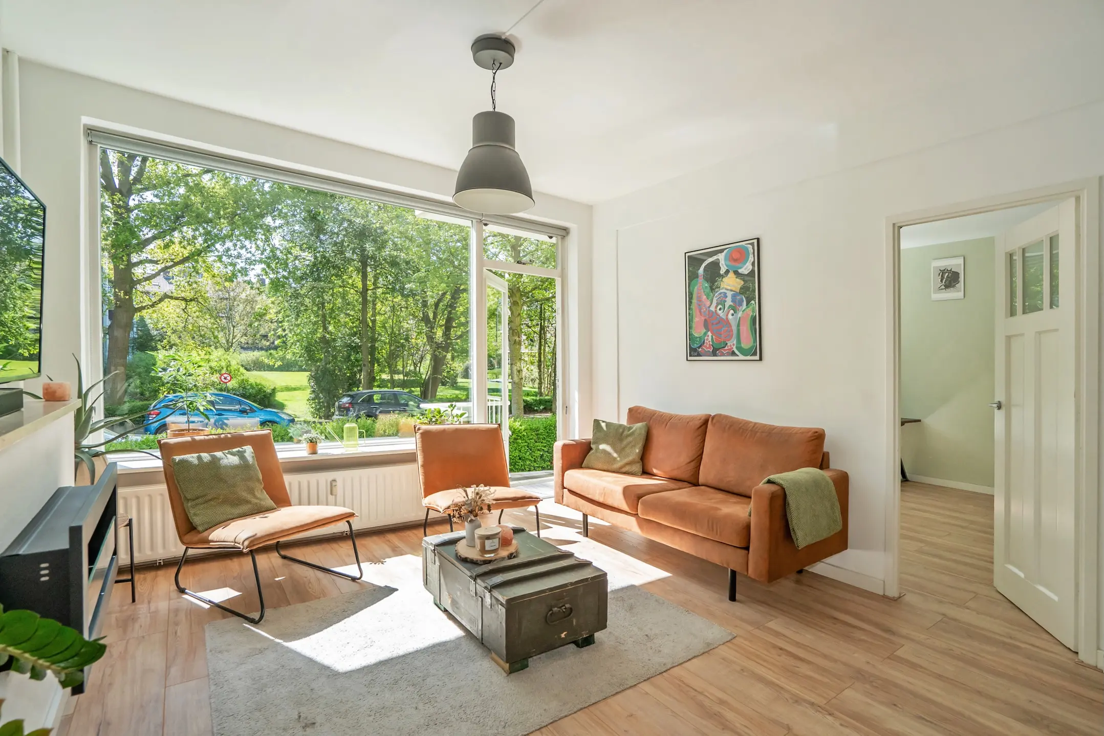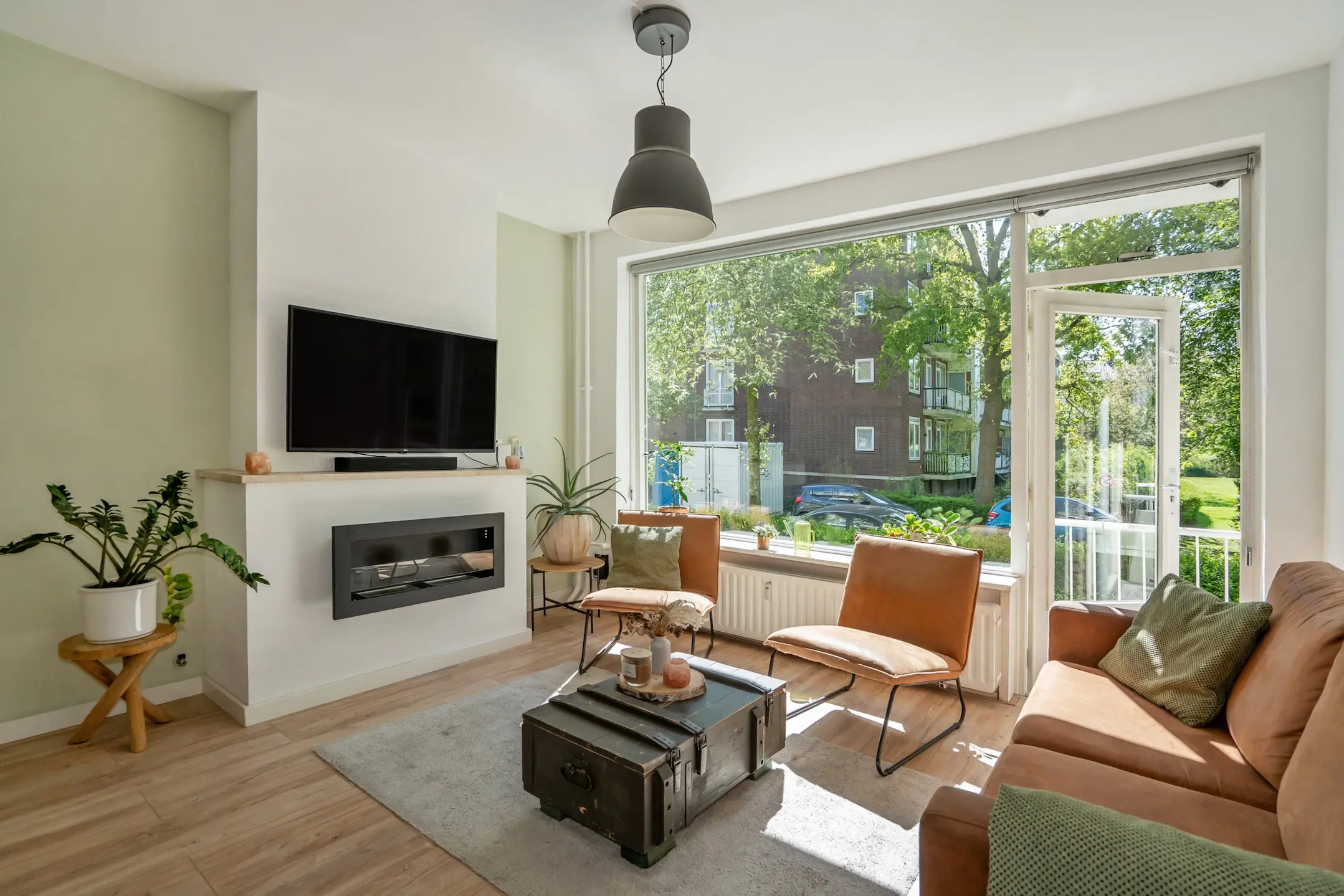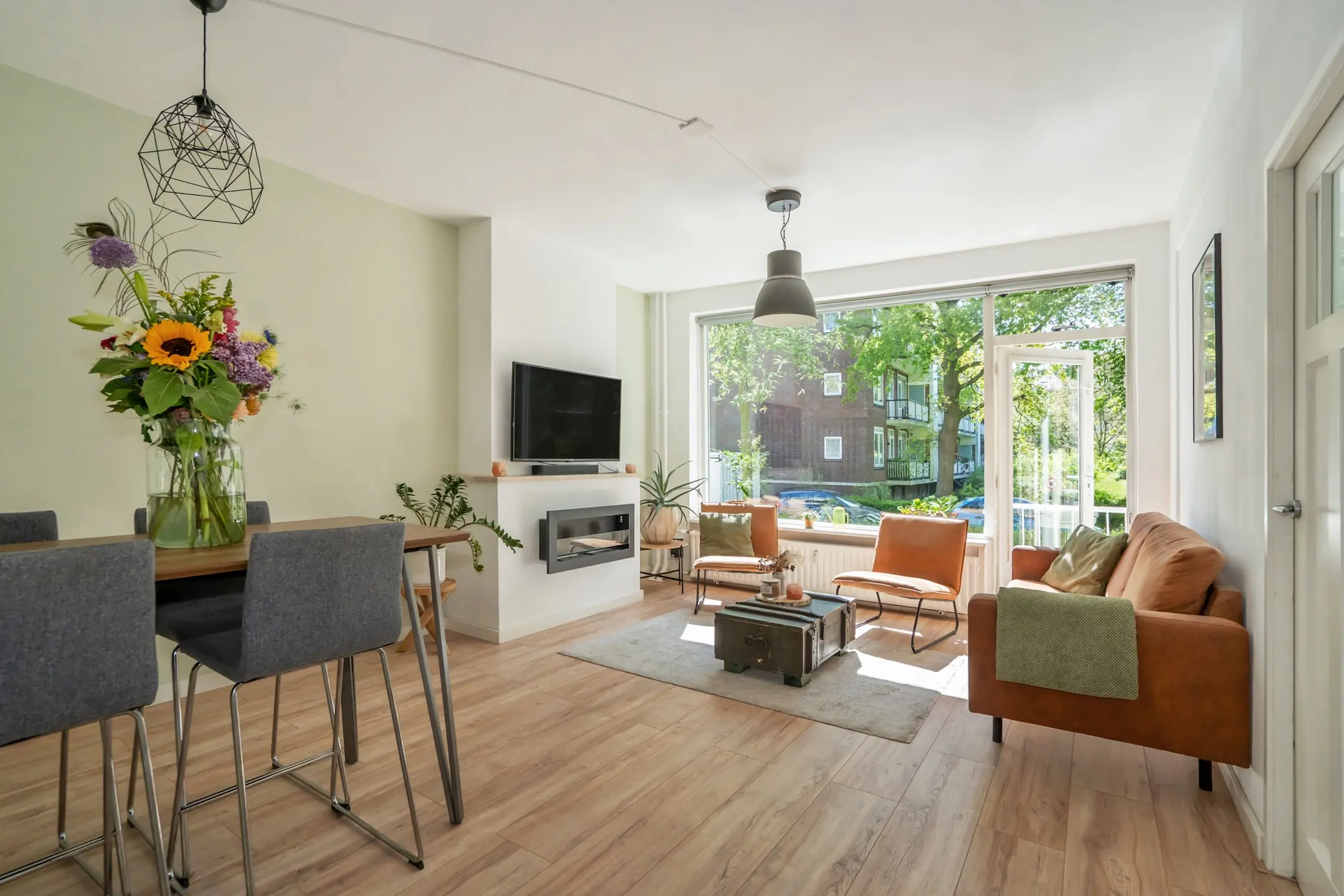 Wanneer je verder loopt, kom je in de sfeervolle woon- en eetkamer. Grote ramen zorgen hier voor een prachtige lichtinval en bieden een heerlijk groen uitzicht. Vanuit de woonkamer stap je zo het balkon op het zuidwesten op, een heerlijke plek om in de middag en avond van de zon te genieten.