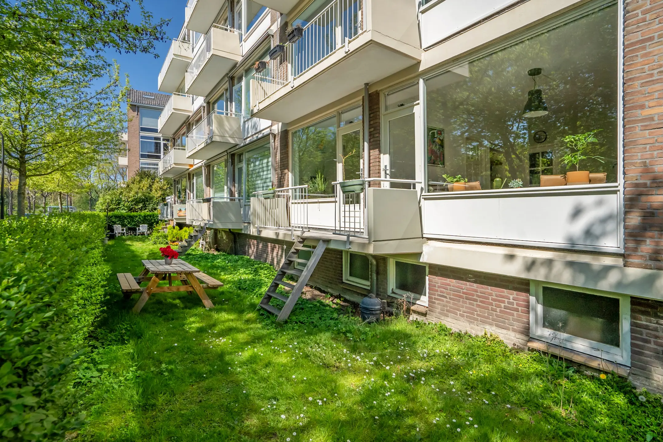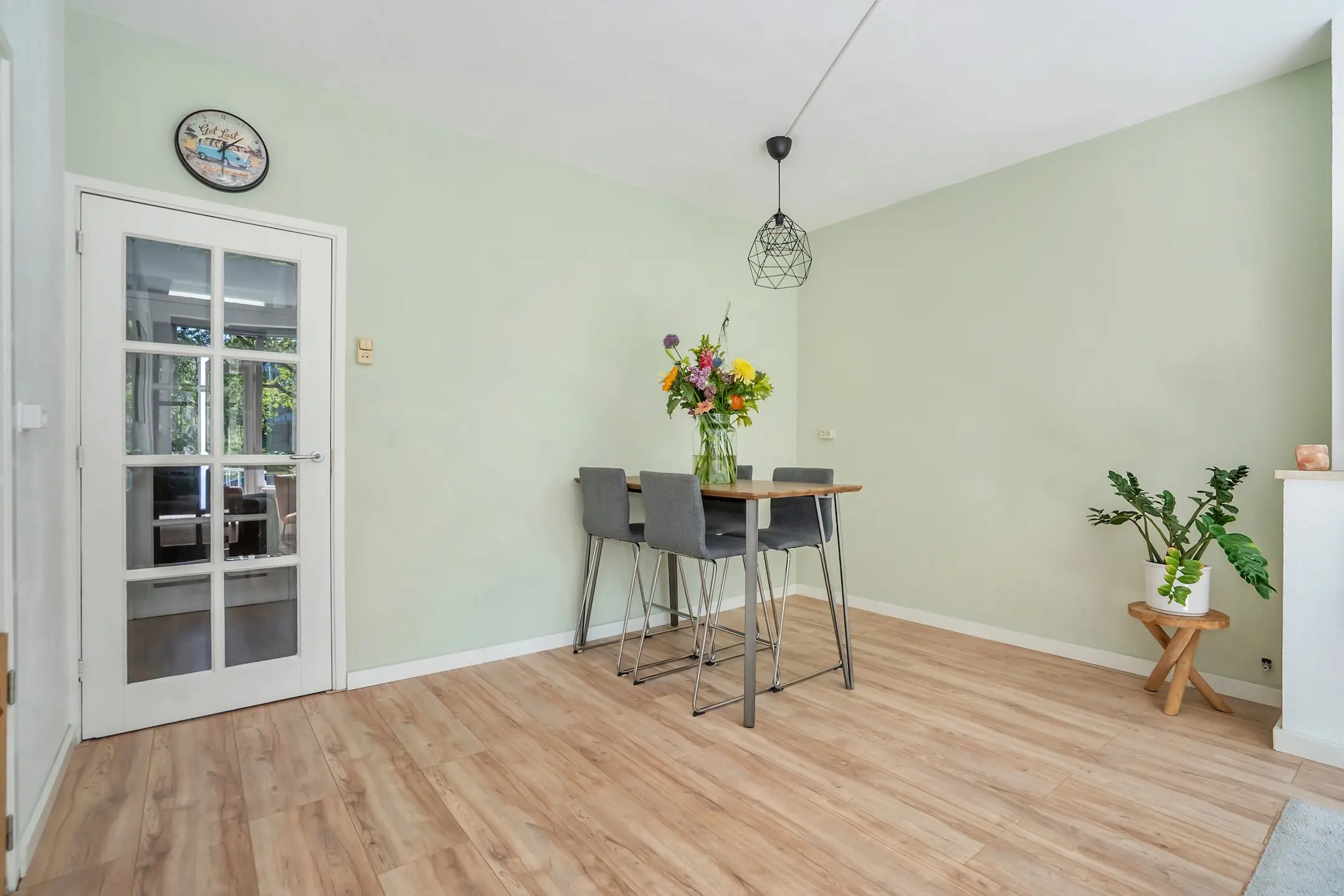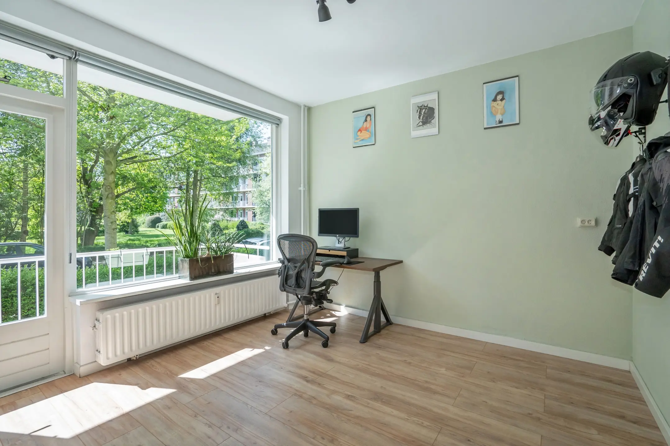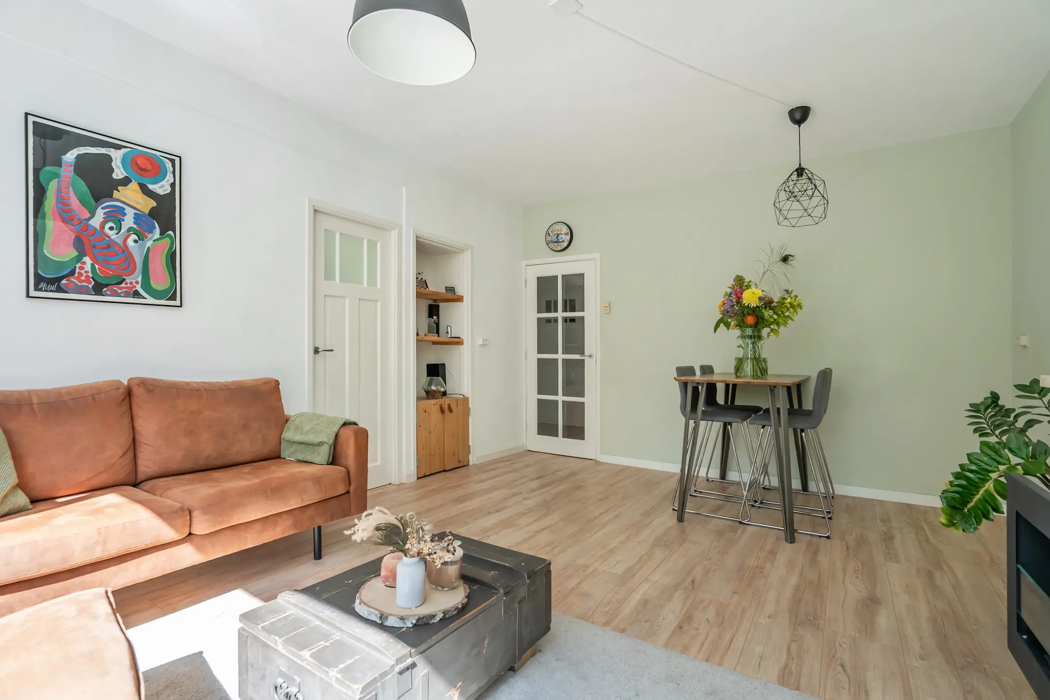 Wanneer je verder loopt, kom je in de sfeervolle woon- en eetkamer. Grote ramen zorgen hier voor een prachtige lichtinval en bieden een heerlijk groen uitzicht. Vanuit de woonkamer stap je zo het balkon op het zuidwesten op, een heerlijke plek om in de middag en avond van de zon te genieten.