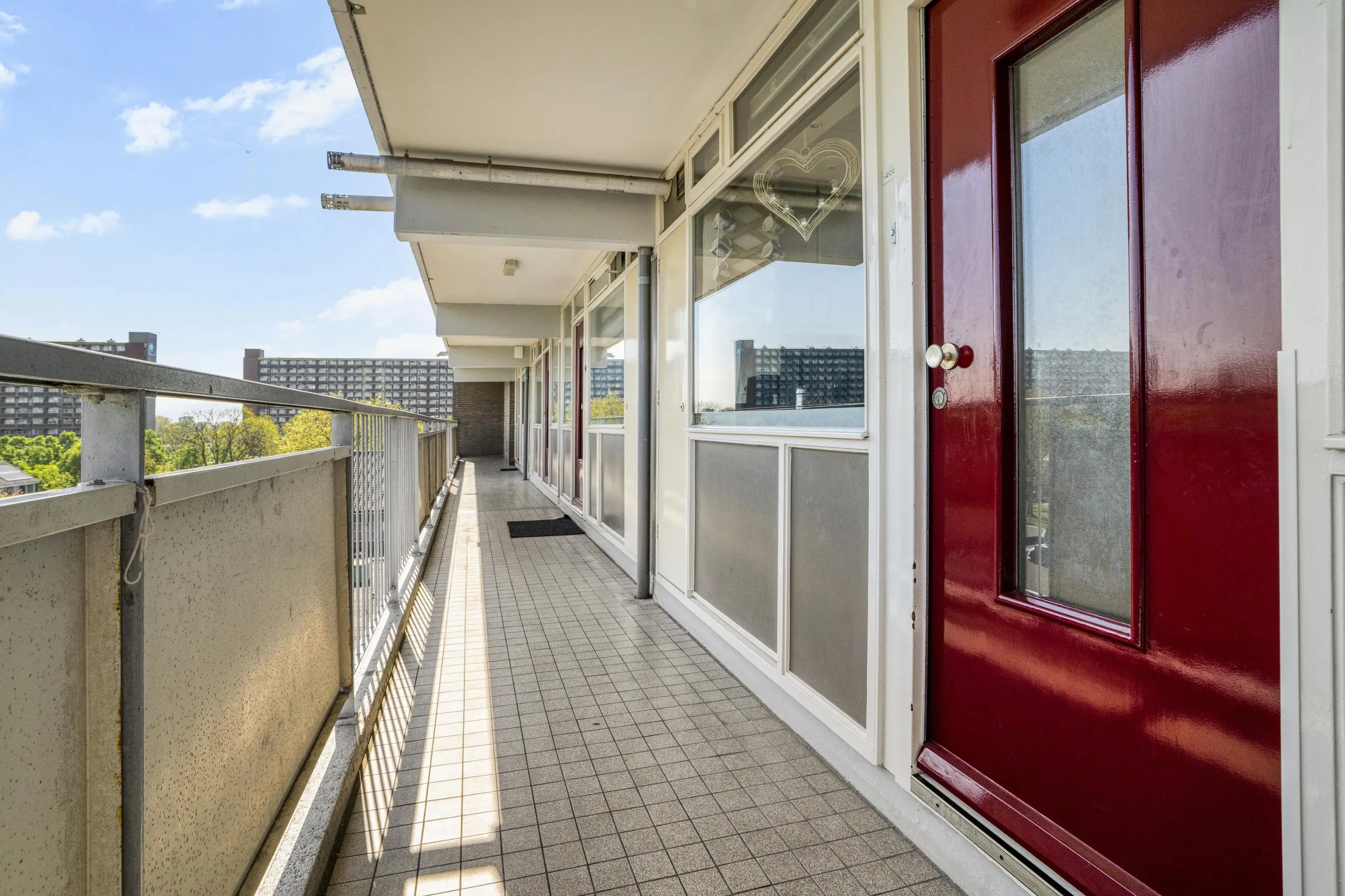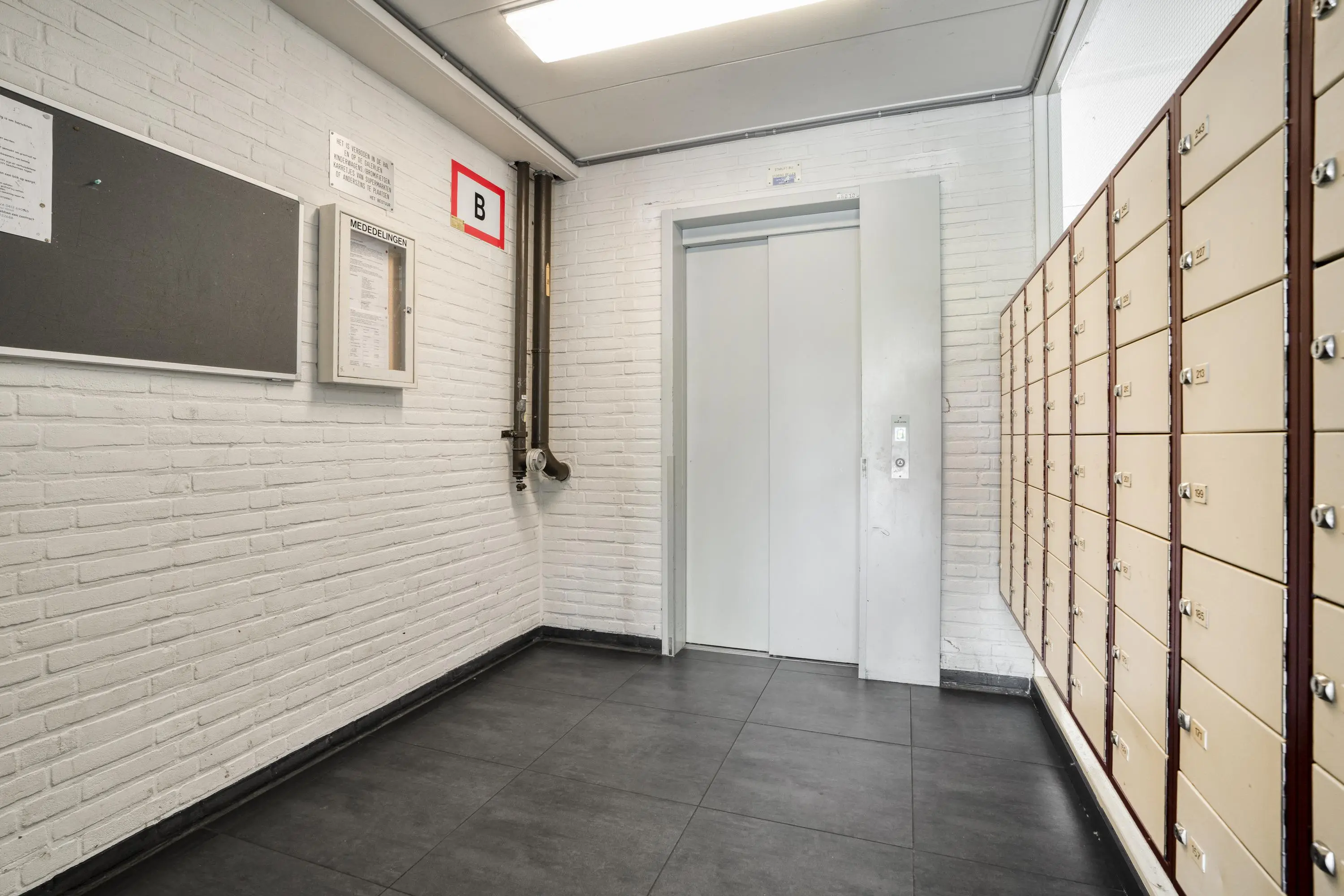 Afgesloten hoofdentree met brievenbussen en bellentableau, lift en trappenhuis, toegang tot de woning op de vierde verdieping vanaf de galerij.