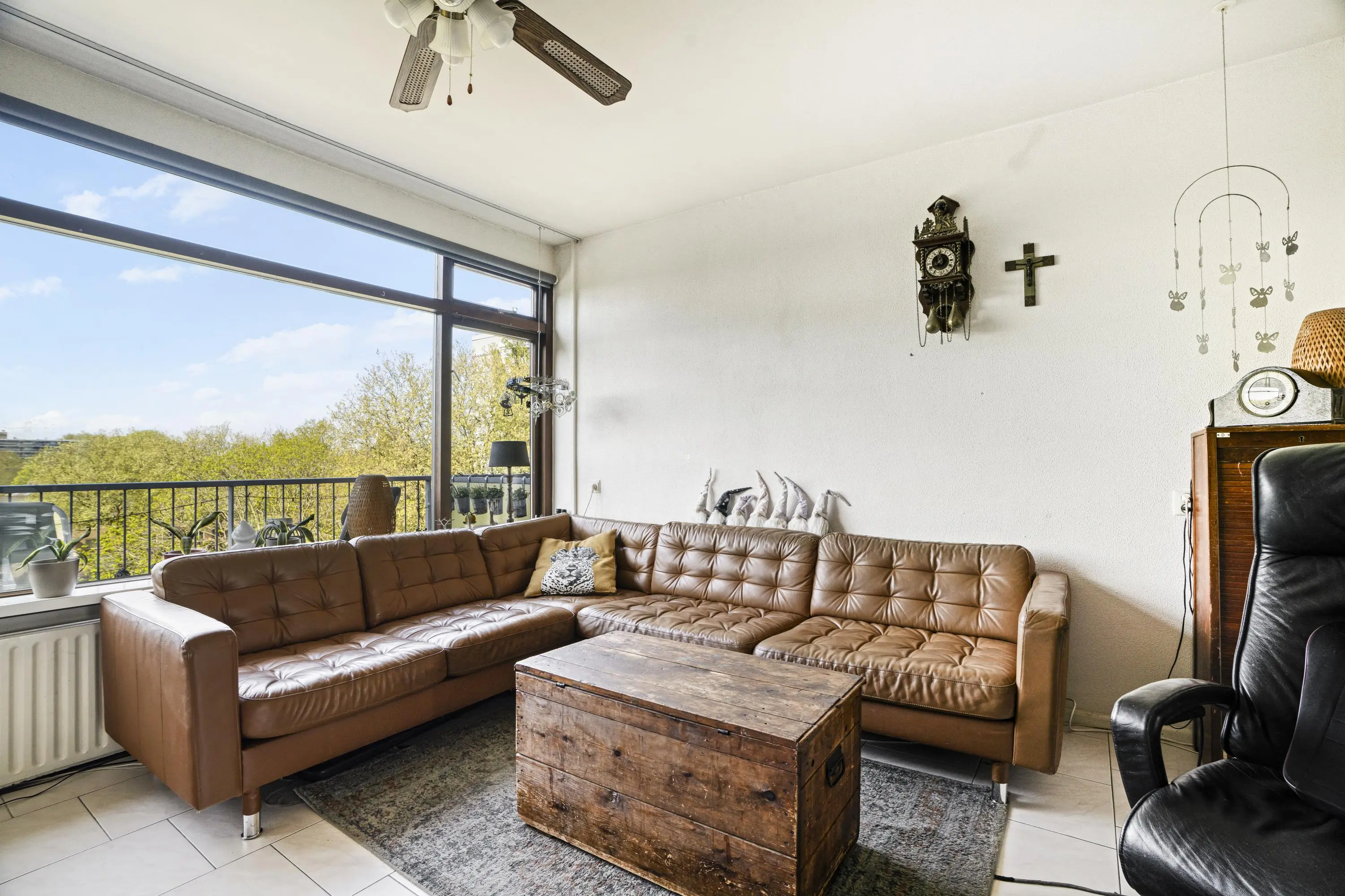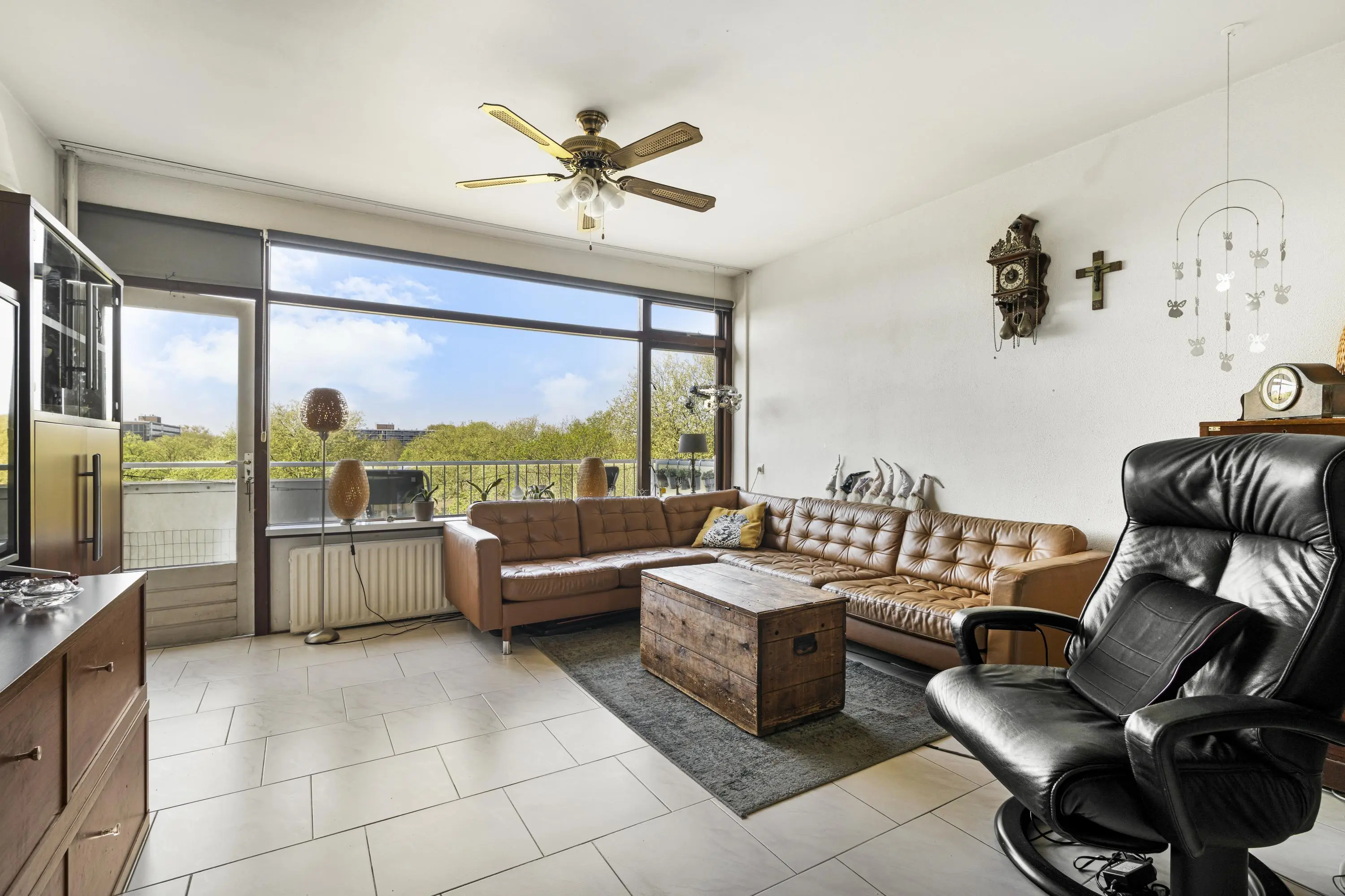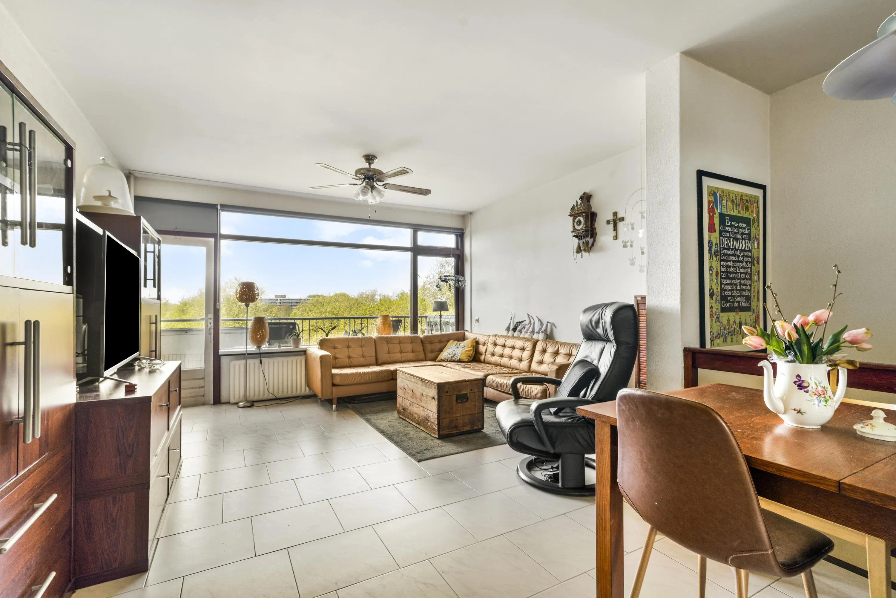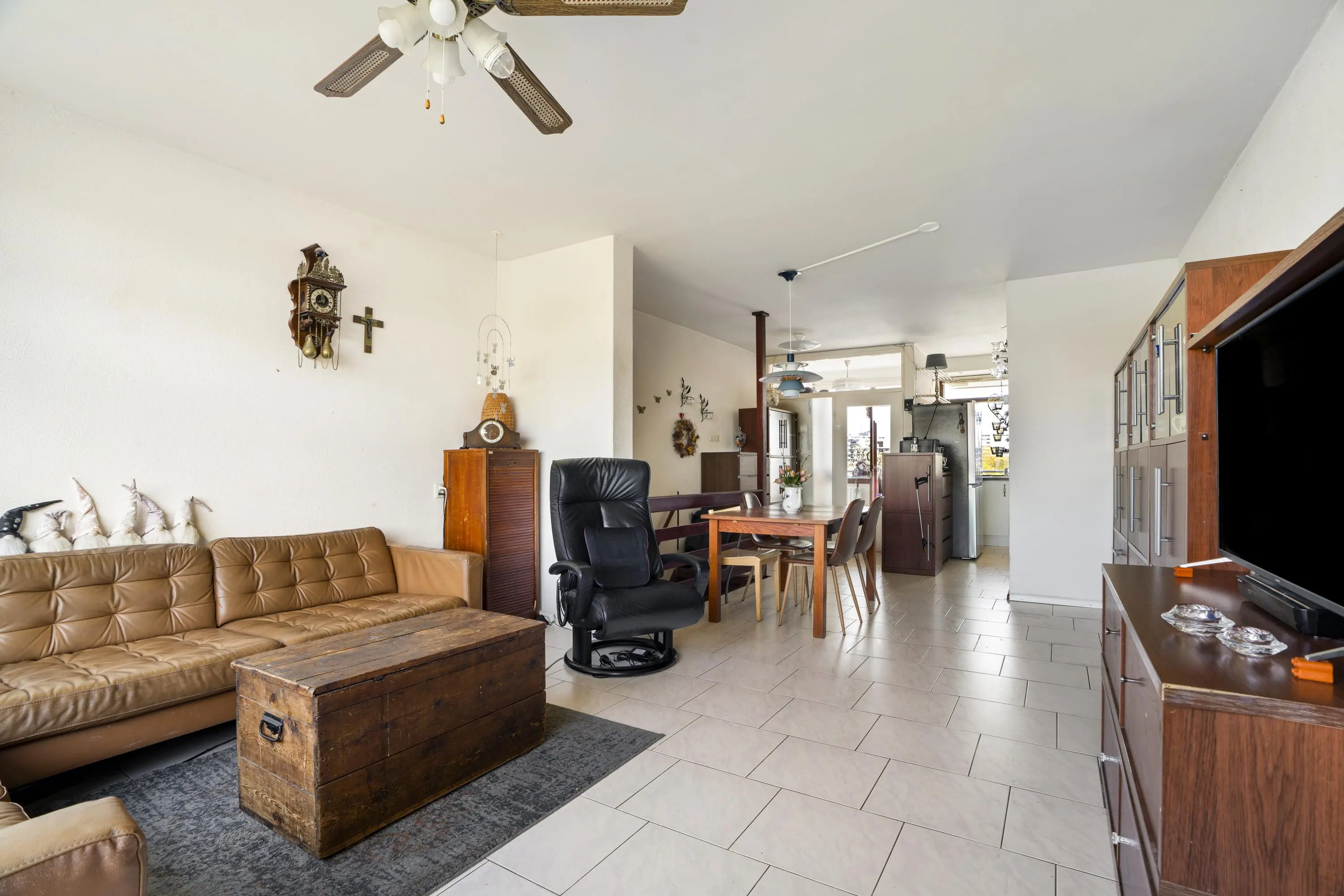 De woonkamer heeft grote ramen en een deur nar het balkon op het zuidwesten, zonnescherm en een weids uitzicht.