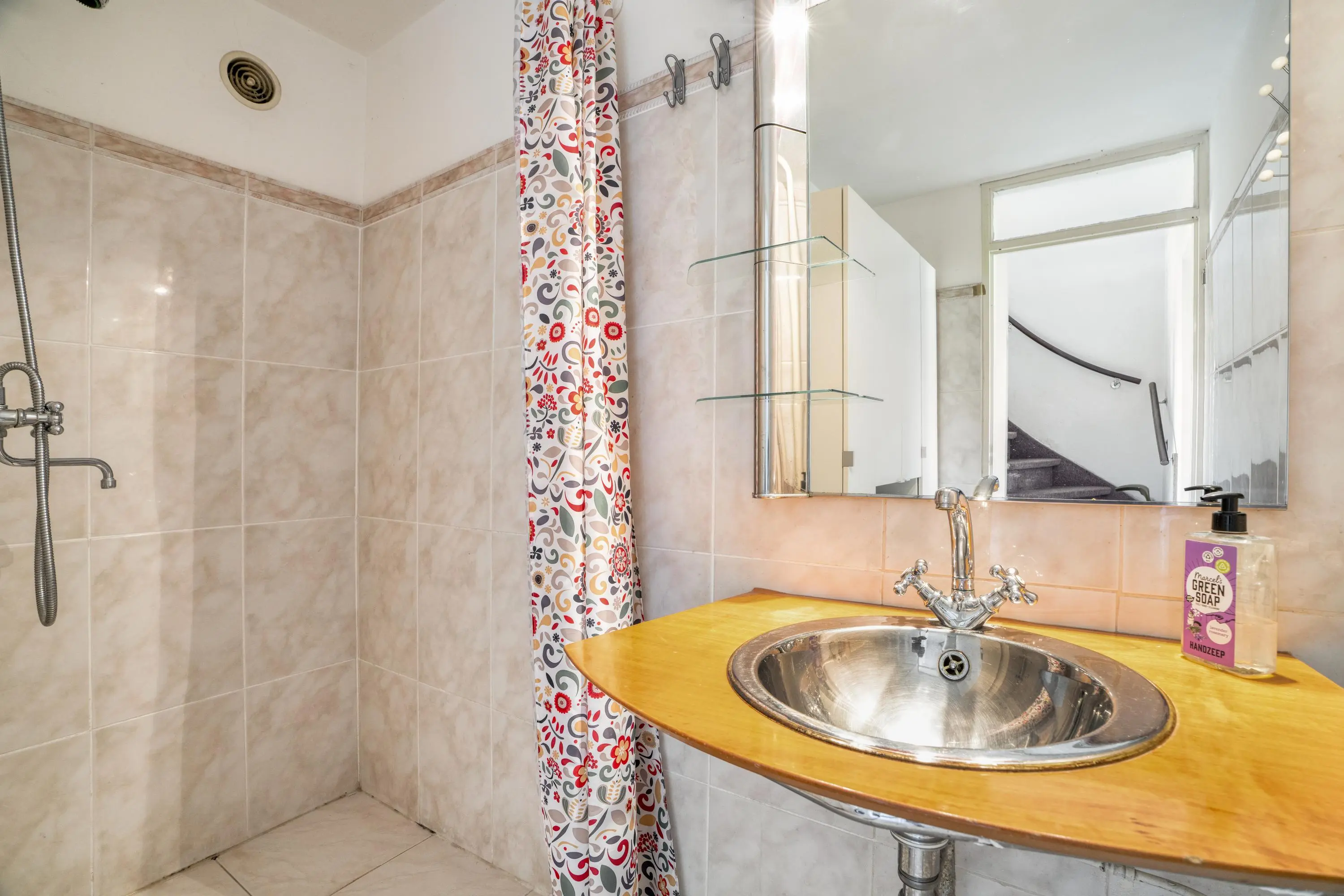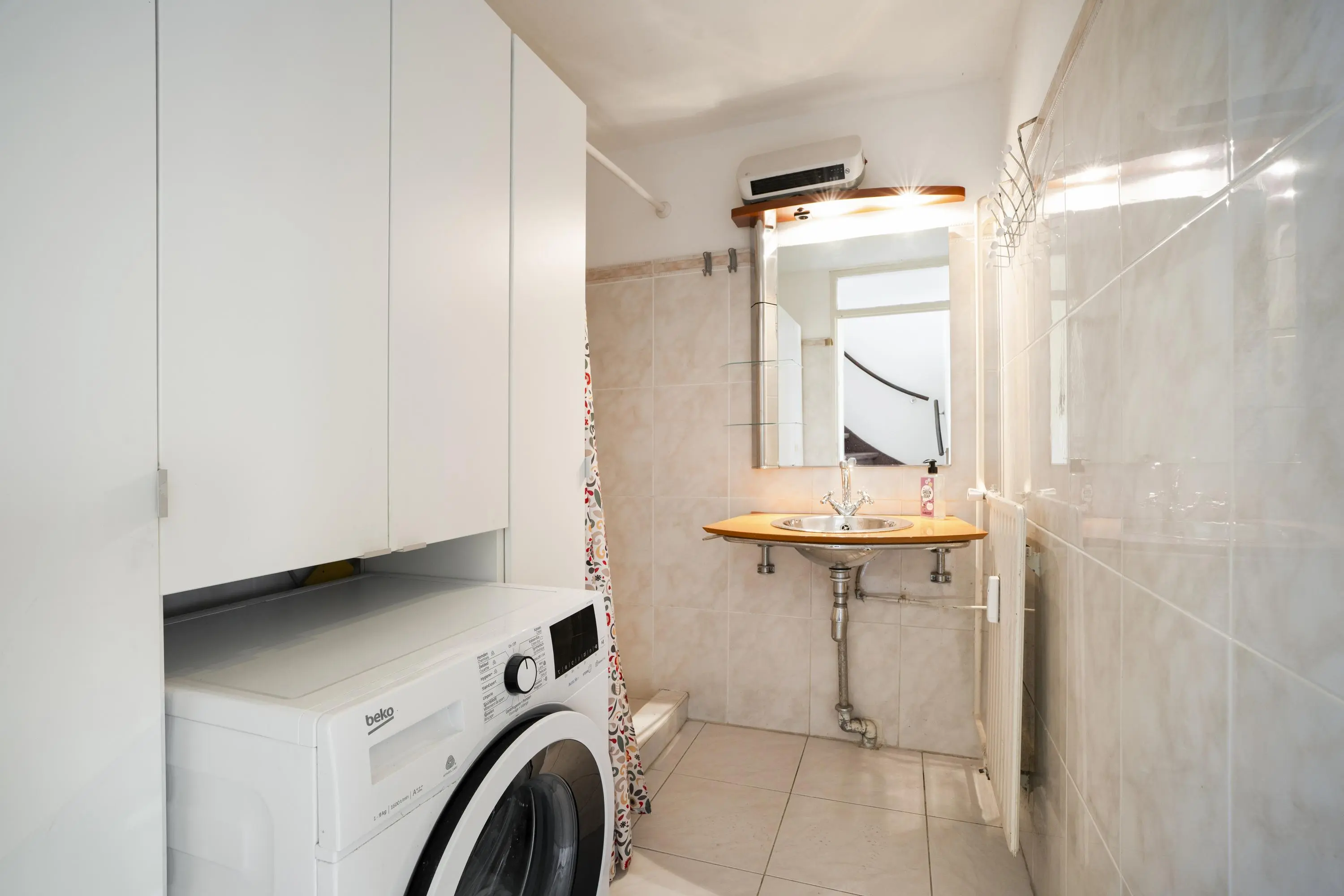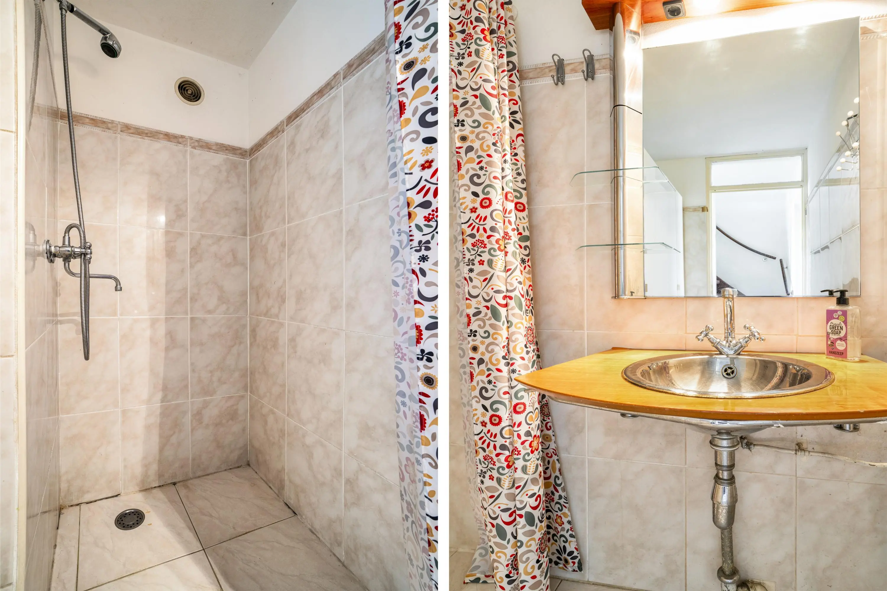 Lichtkleurig betegelde badkamer met een douchegelegenheid, wastafel en de opstelplaats van de wasmachine. De badkamerkasten blijven.