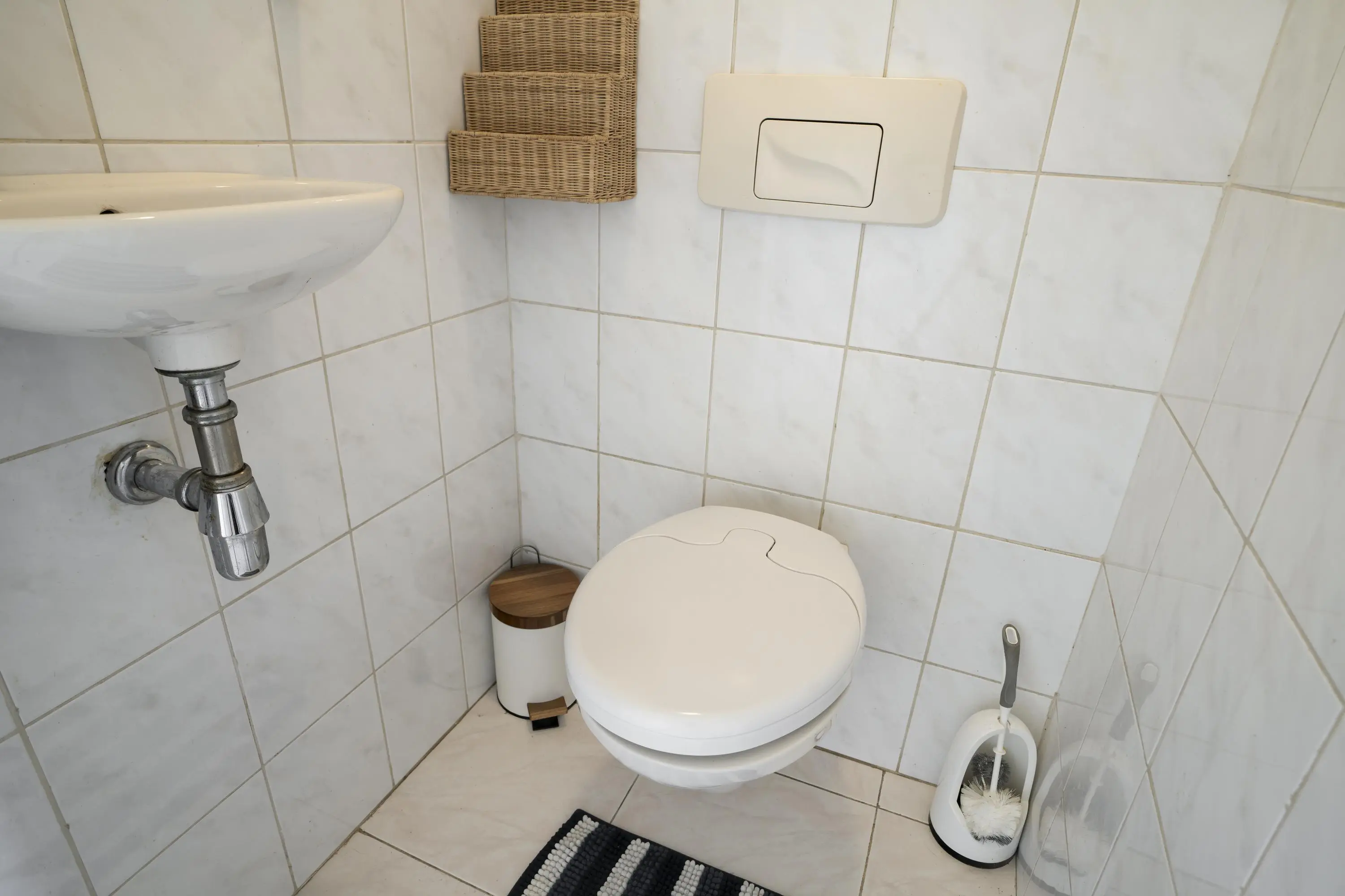 Separaat lichtkleurig betegeld toilet voorzien van wandcloset en een fonteintje.
