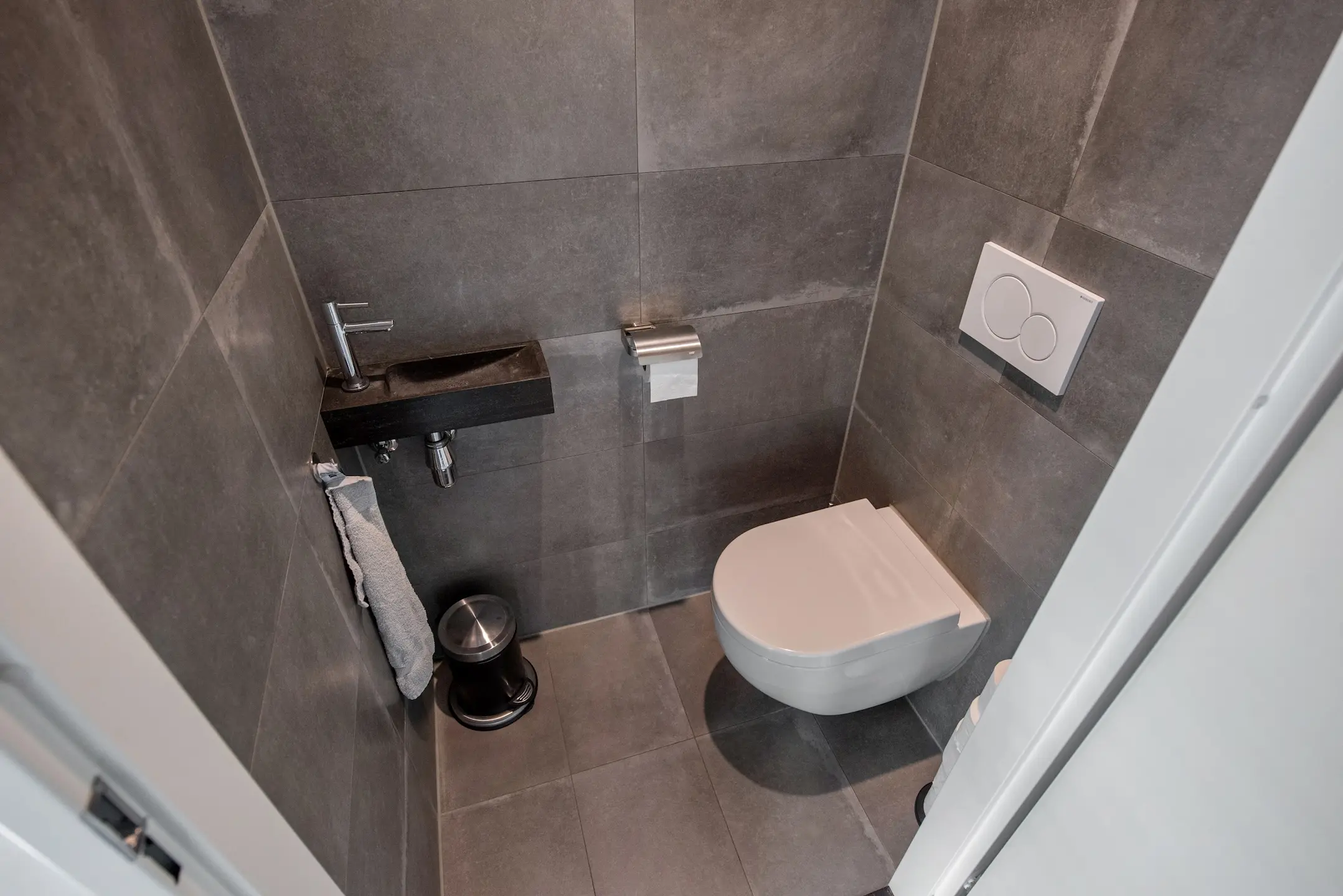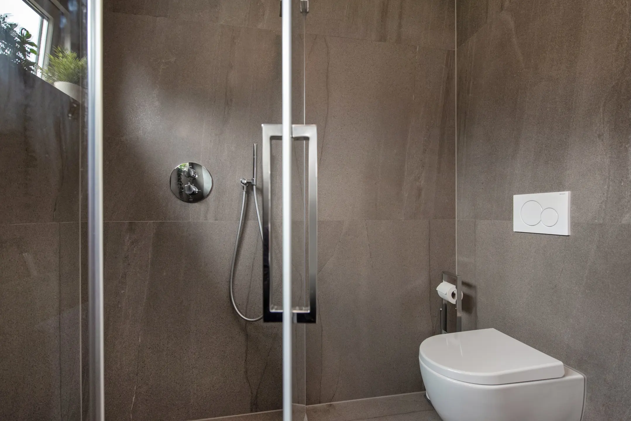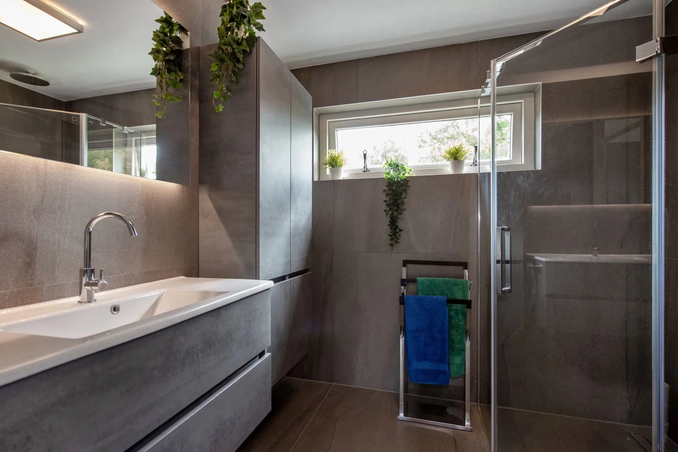 Fraaie badkamer (2019) met grote, grijs gemêleerde tegels. Wastafelmeubel met brede lades en een spiegel met verwarming en verlichting, daarnaast een vaste badkamerkast in dezelfde stijl, ruime douchegelegenheid met hardglazen spatschermen, handdouche en een Rainshower, elektrische vloerverwarming. Tweede wandcloset.