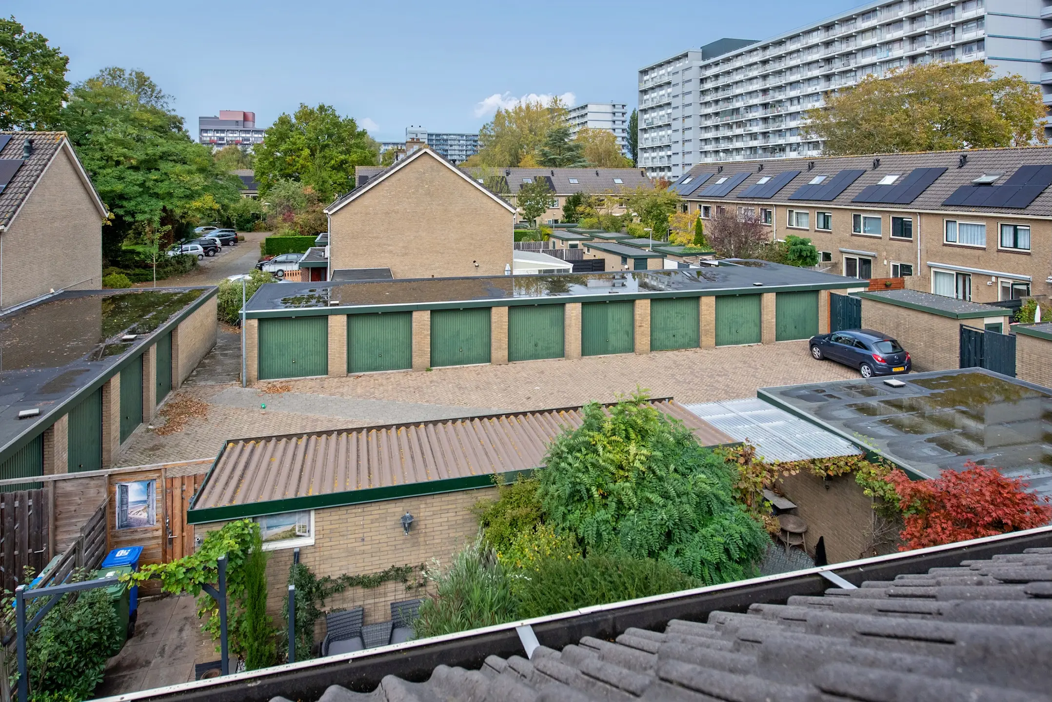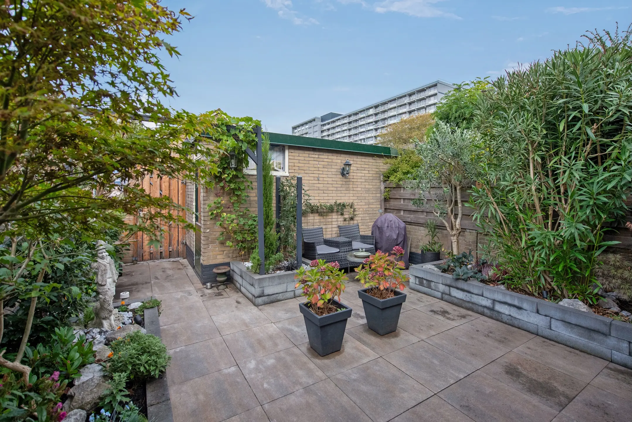 De achtertuin is gelegen op het noordwesten, is onderhoudsvriendelijk aangelegd en heeft veel groen in de verhoogd aangelegde plantenborders. Gemetselde schuur voorzien van elektra, achterom.