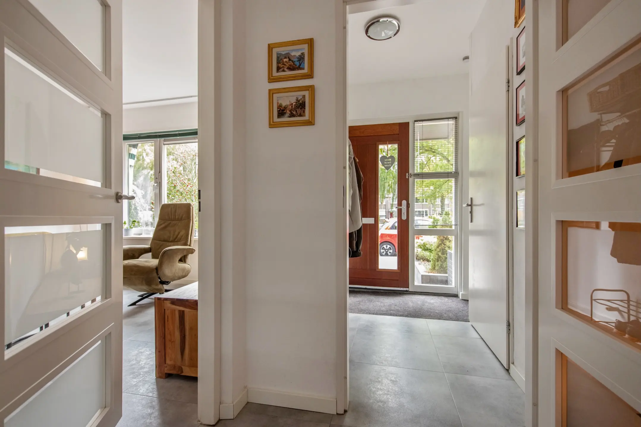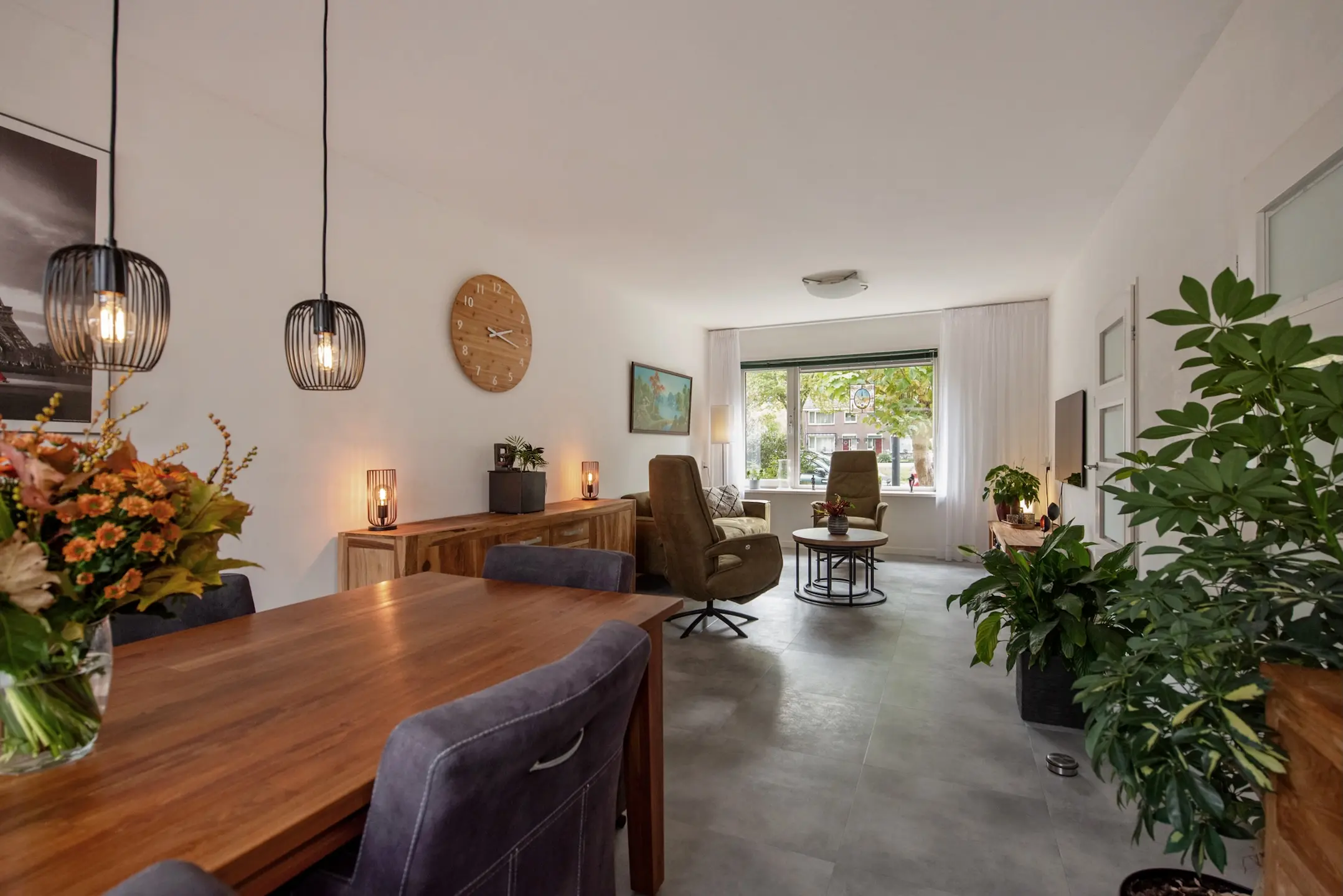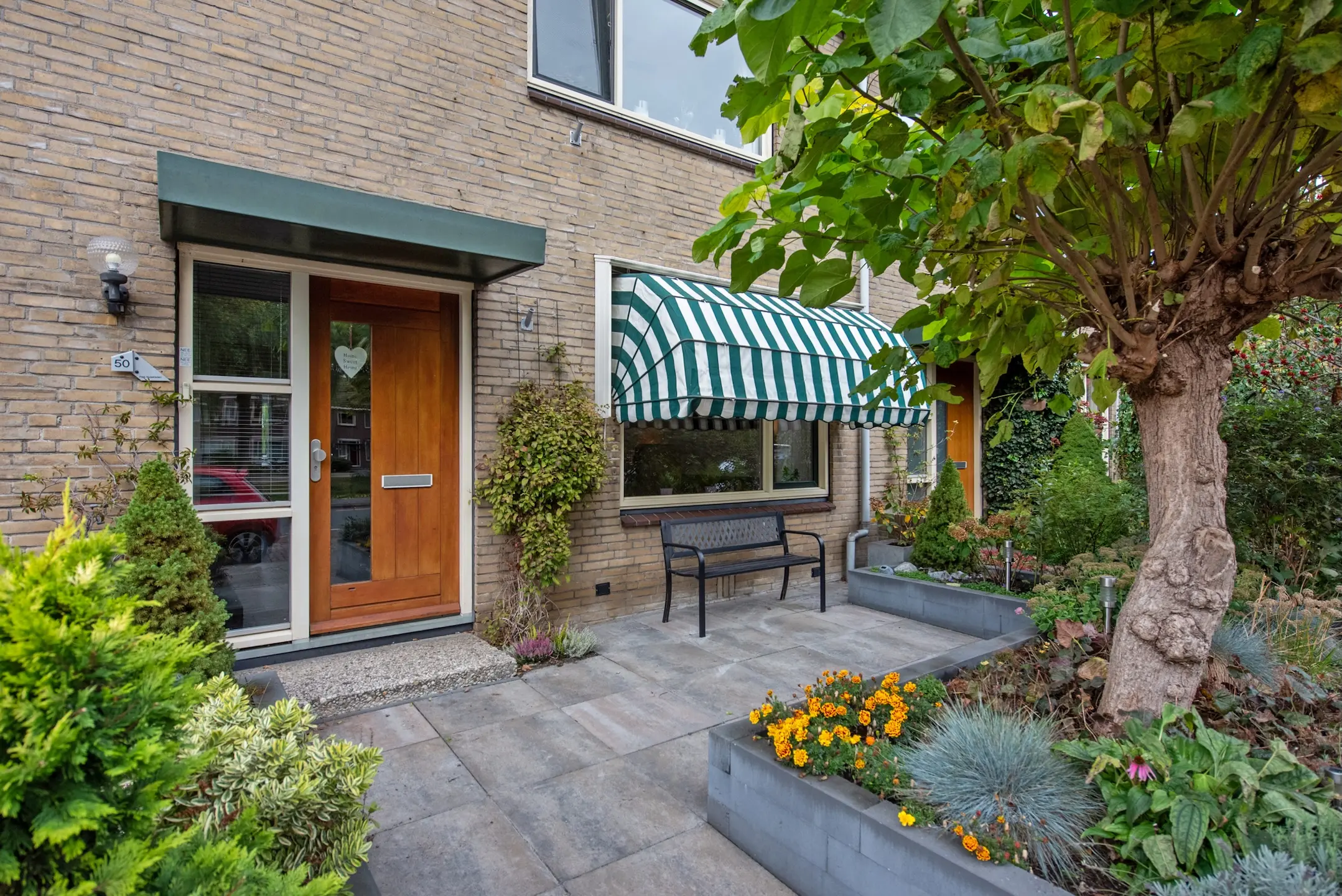 Begane grond: goed aangelegde voortuin, entree woning met tochtportaal voorzien van garderoberuimte, meterkast met vernieuwde elektrische installatie, hal met berging, fraai uitgevoerd toilet (2019) met wandcloset en een natuurstenen fonteintje, trap met gerenoveerde trapbekleding met geïntegreerde verlichting, vernieuwde deuren met glazen panelen en metalen deurposten, aangenaam lichte woon-/eetkamer met pvc tegelvloer voorzien van comfortabele vloerverwarming en een schuifpui naar de achtertuin. Aan de voorzijde een groen/wit gestreepte markies.