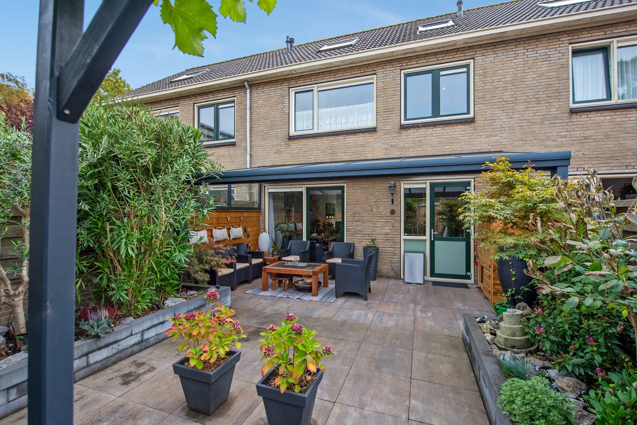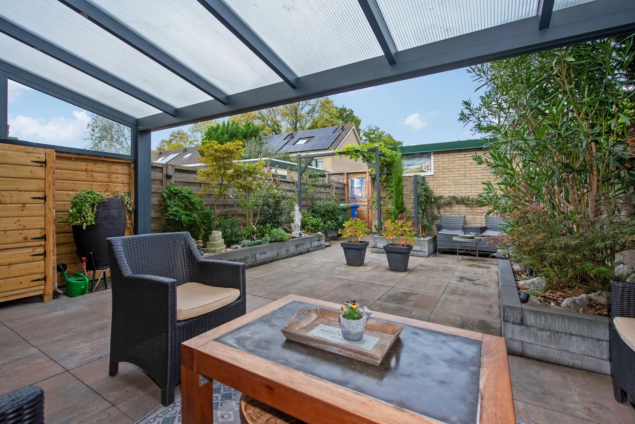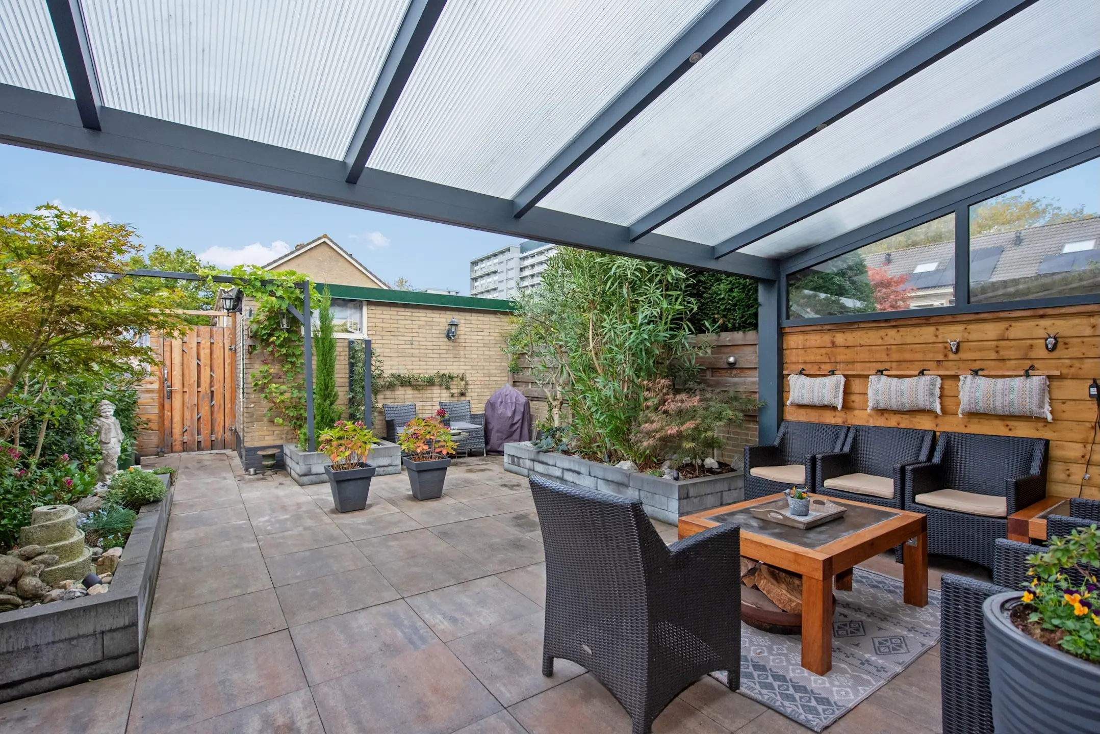 Fraai aangelegde achtertuin met tuinoverkapping (2019) waaronder u ook met minder goed weer buiten kunt verblijven, ook is het tuinmeubilair beschut tegen de weersinvloeden.