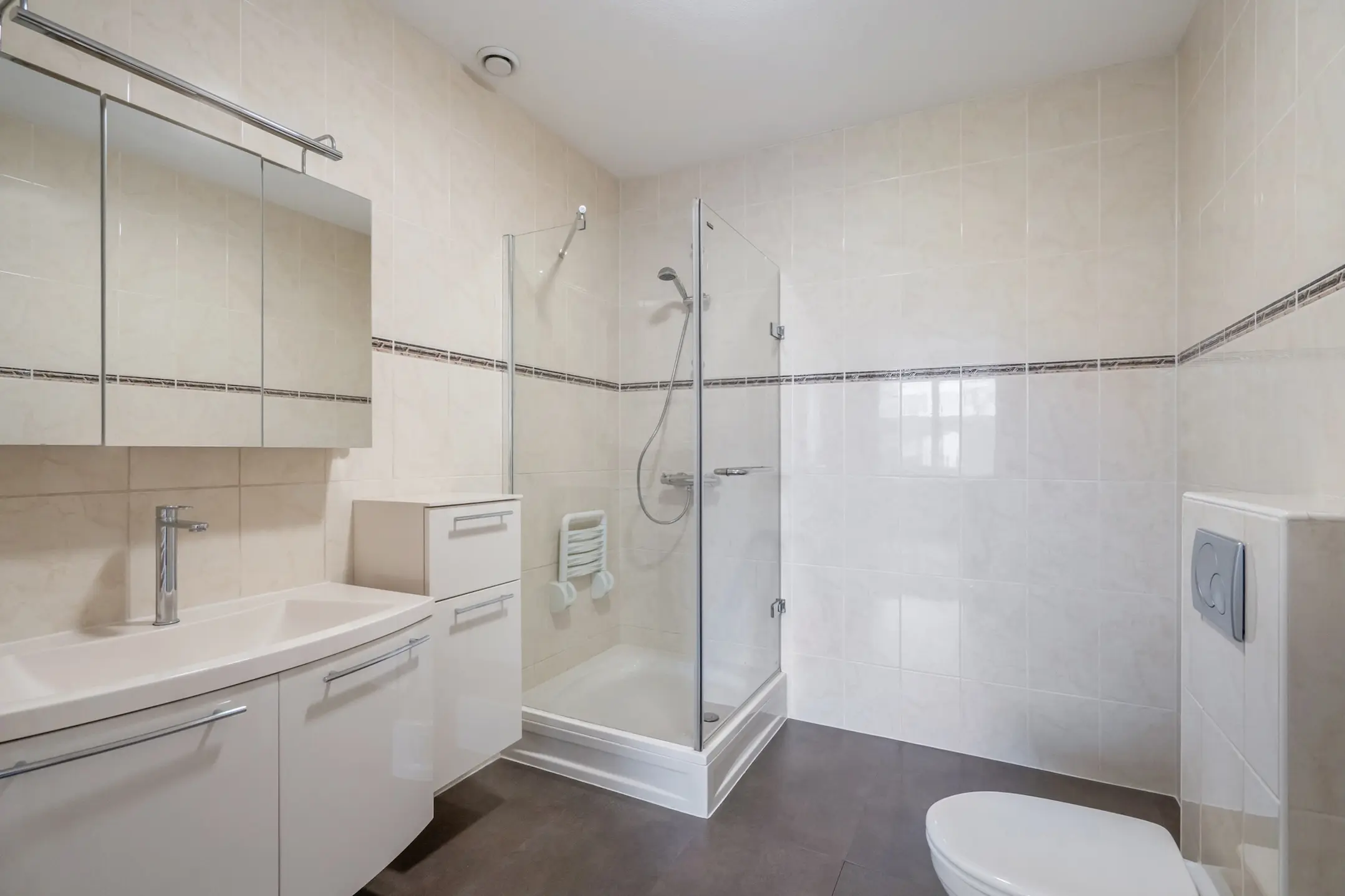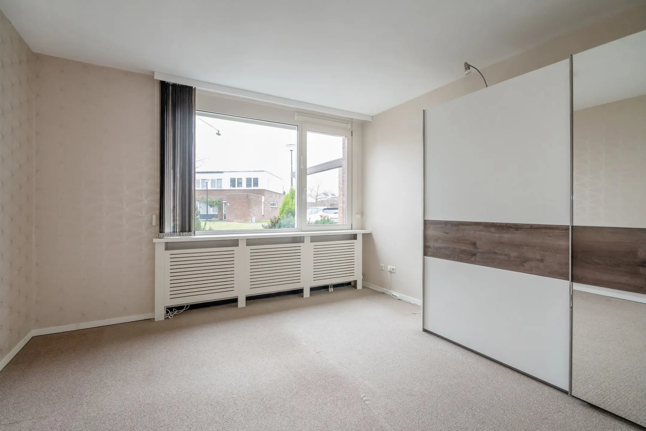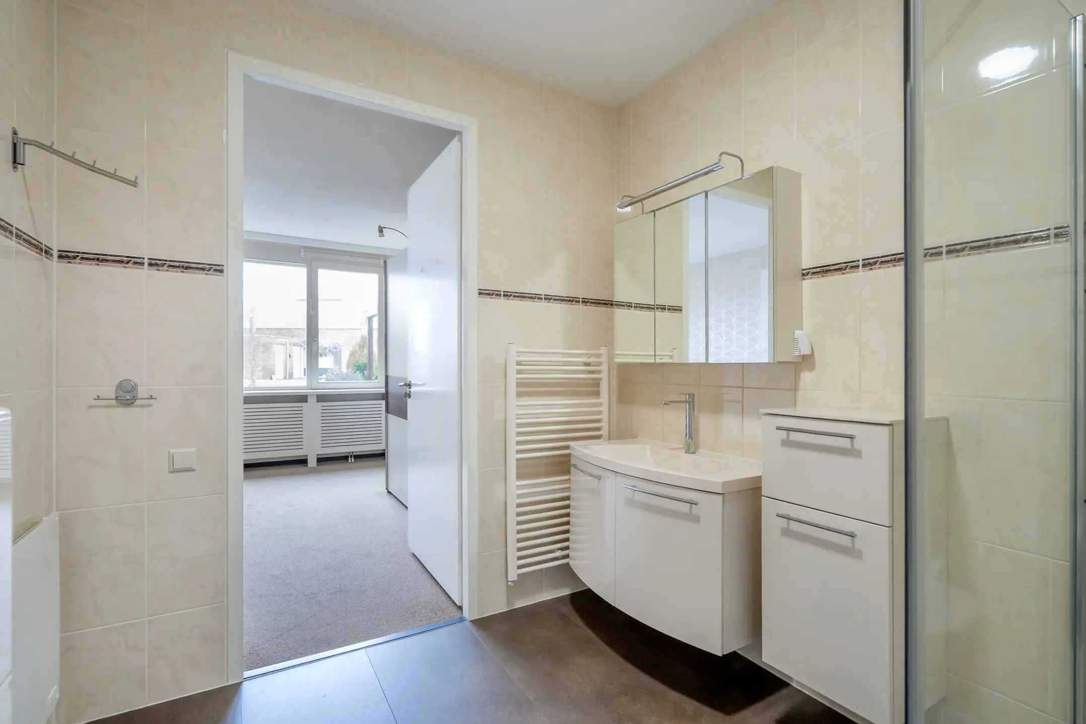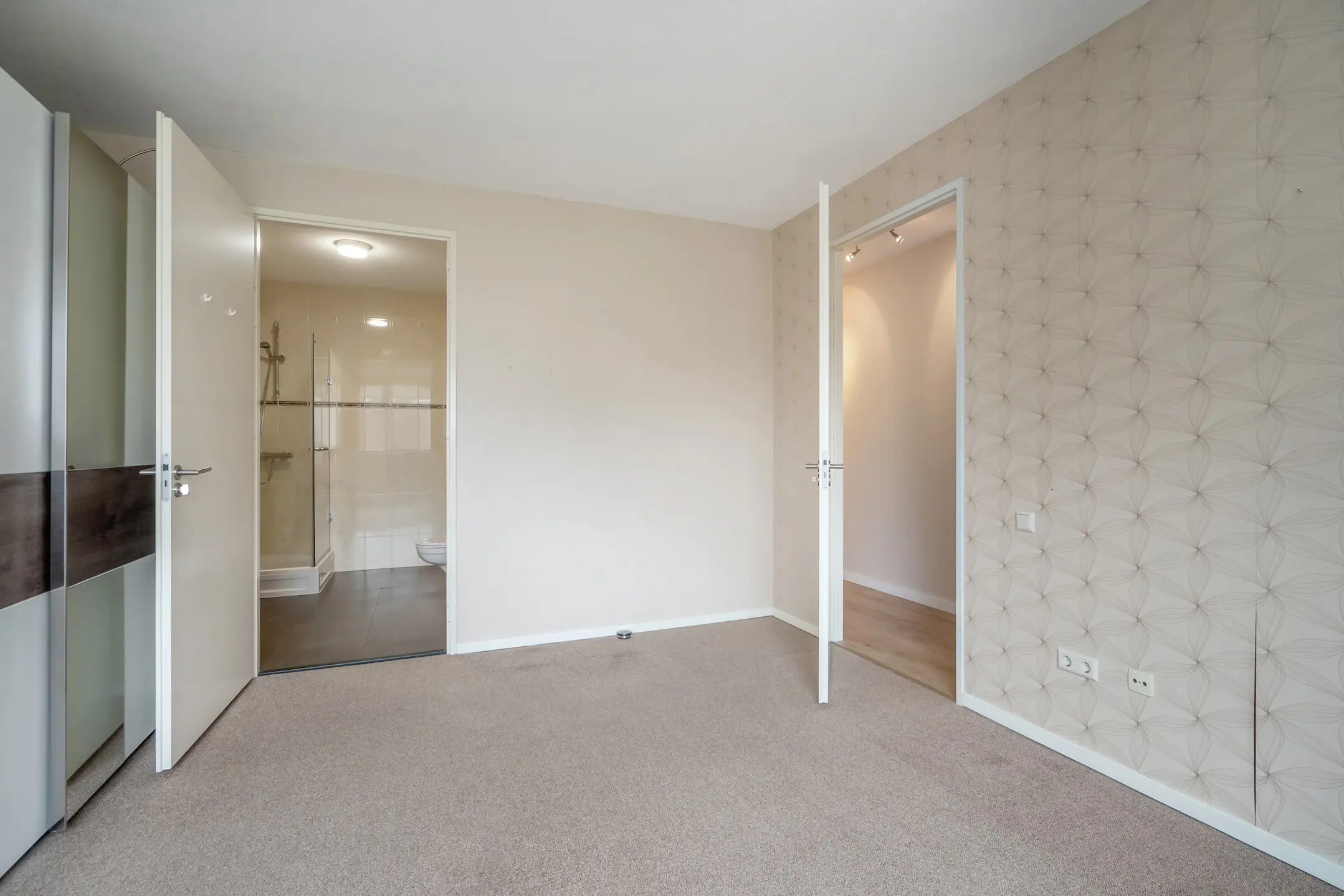 Hoofdslaapkamer aan de voorzijde van de woning. Elektrisch bedienbaar screen. Vanuit de slaapkamer toegang tot de ruime en lichtkleurige badkamer met douchegelegenheid, wastafelmeubel en een tweede wandcloset.