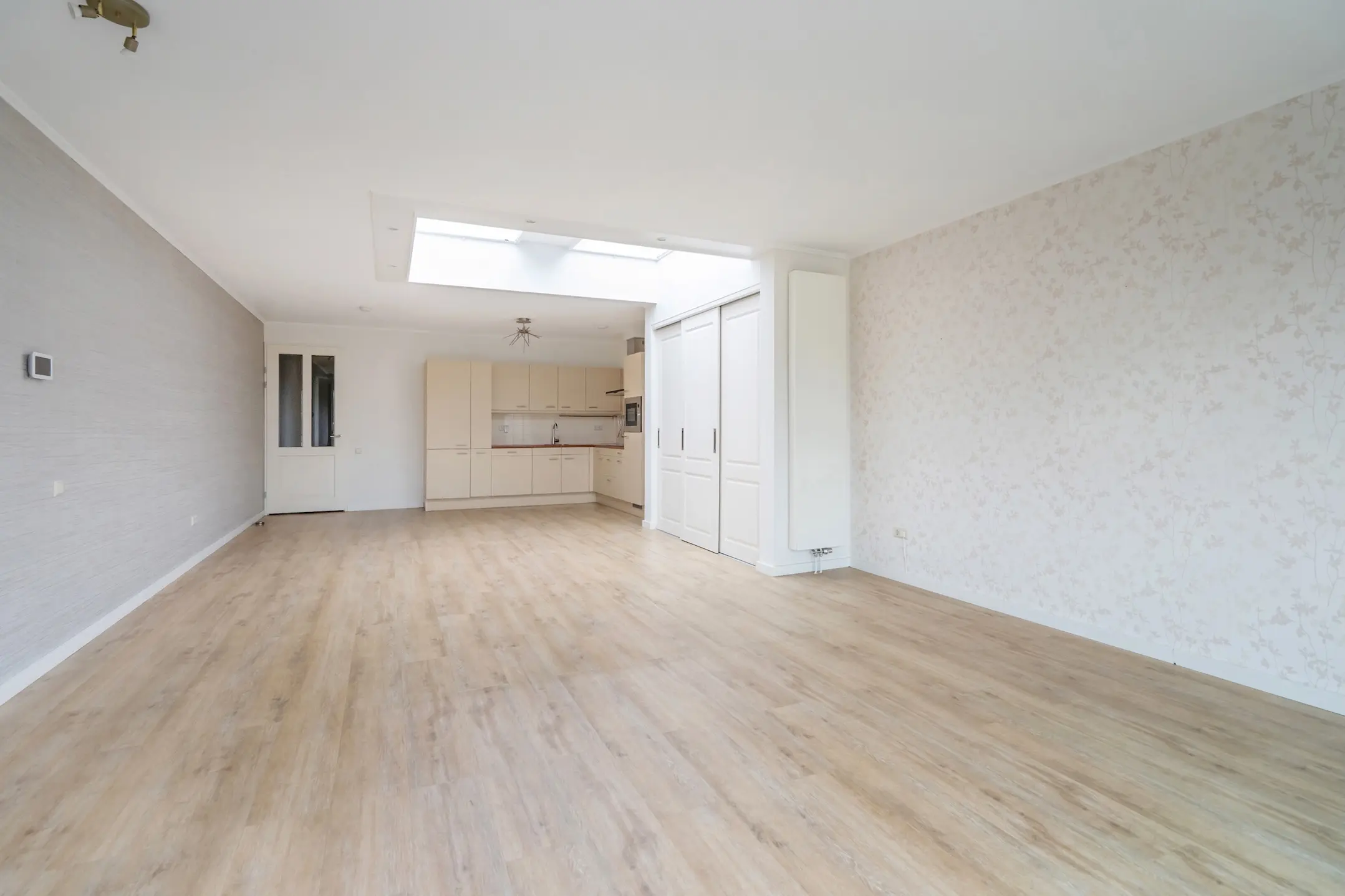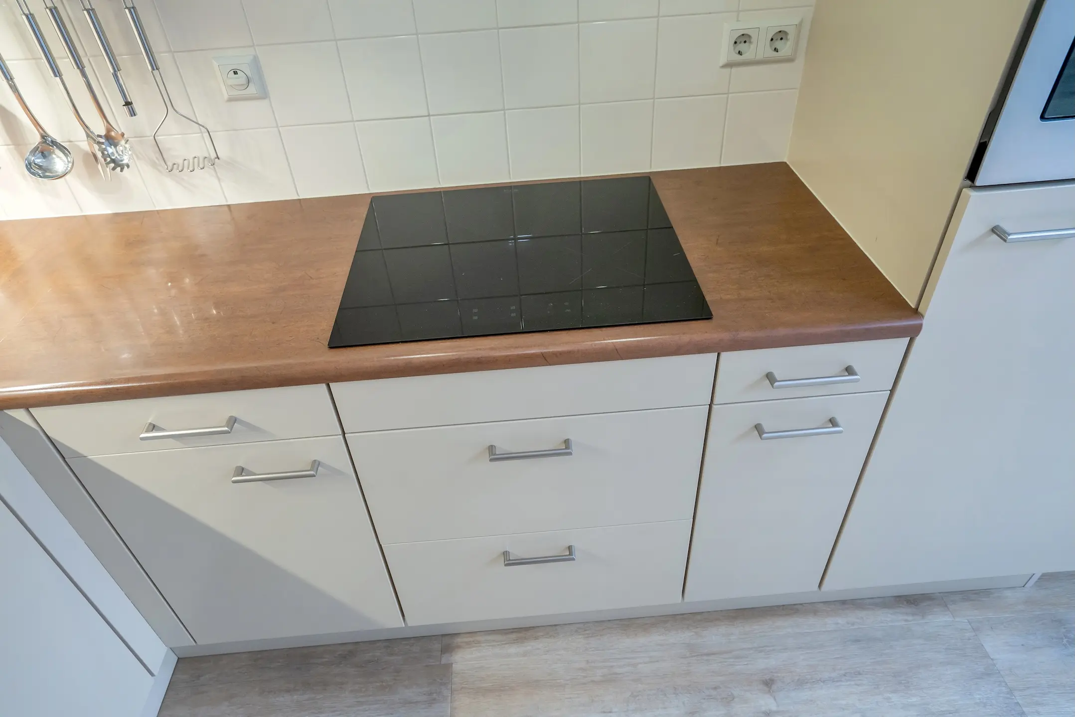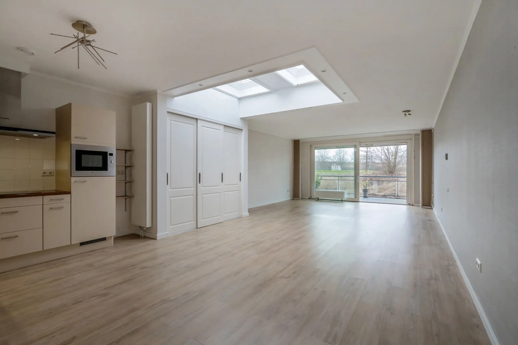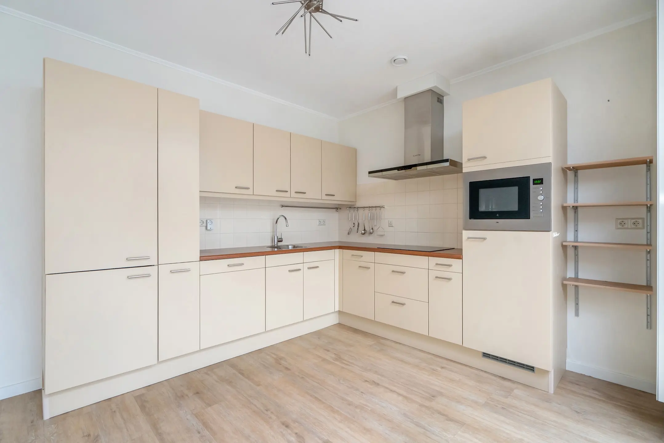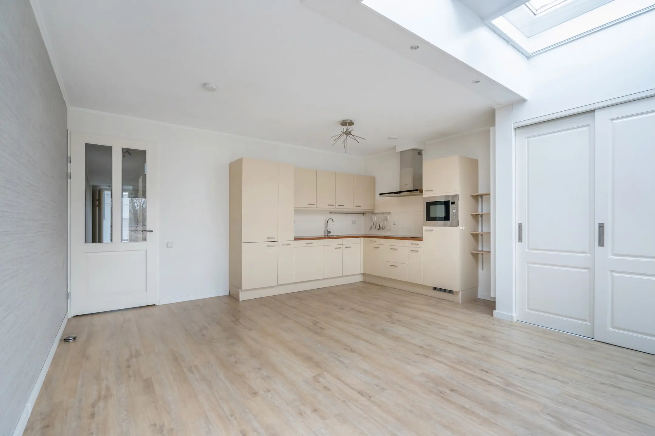 Geïntegreerde inductie kookplaat, afzuigkap, koelkast, vaatwasser en een combi magnetron. Veel kast- en werkruimte.