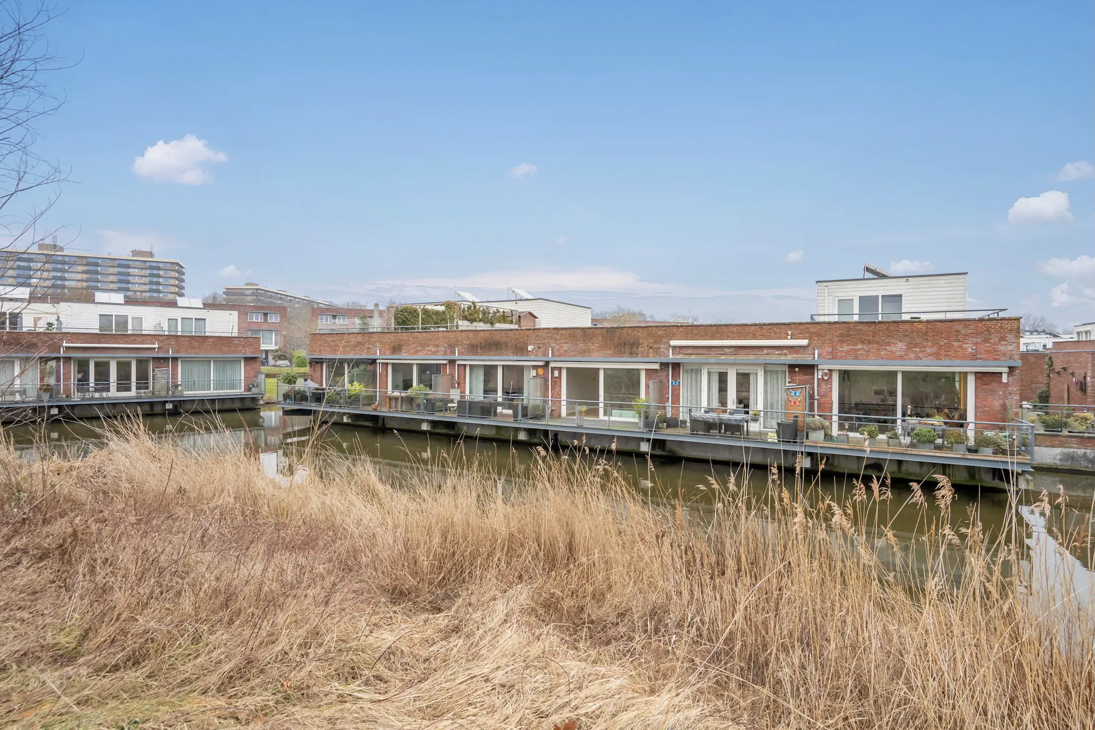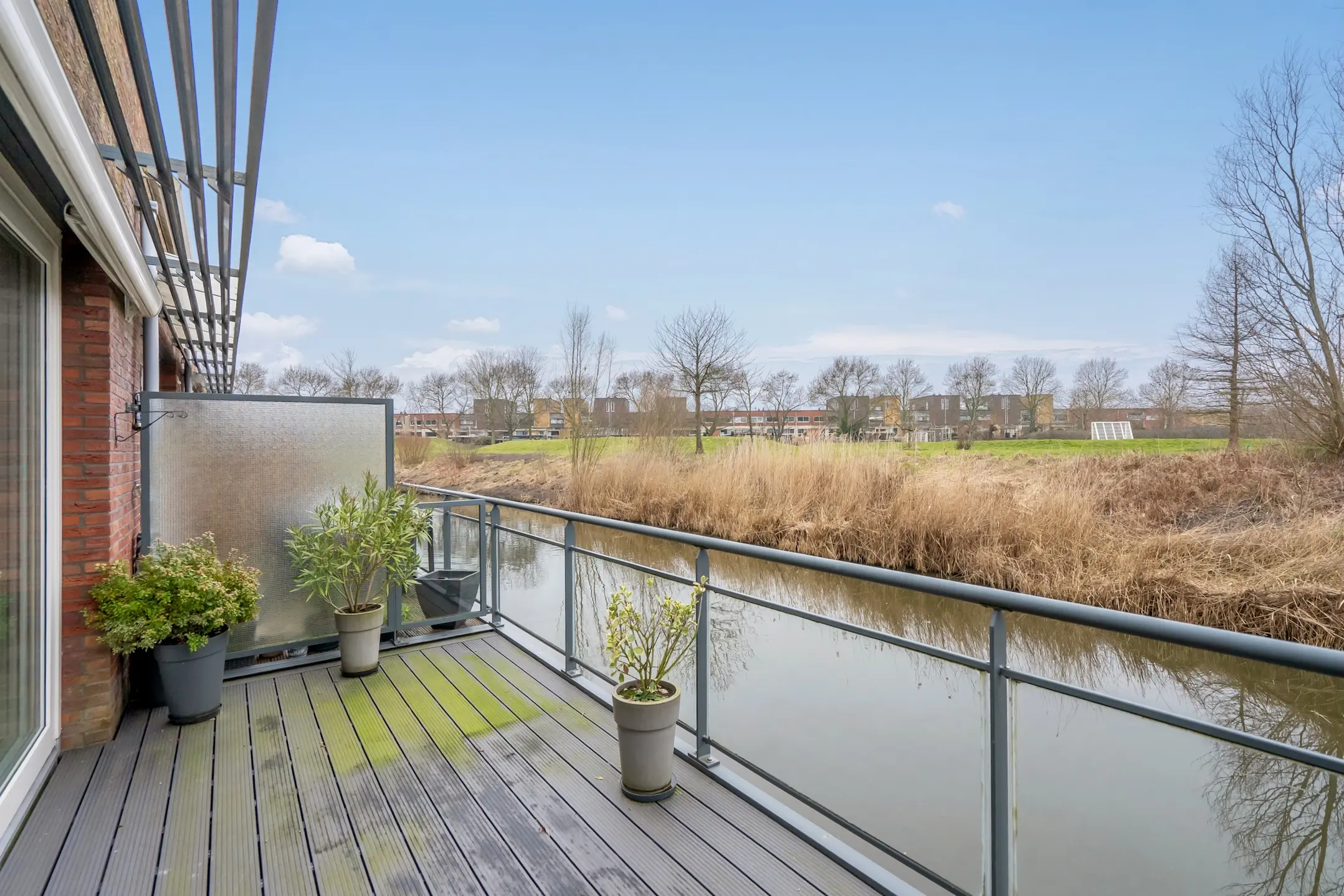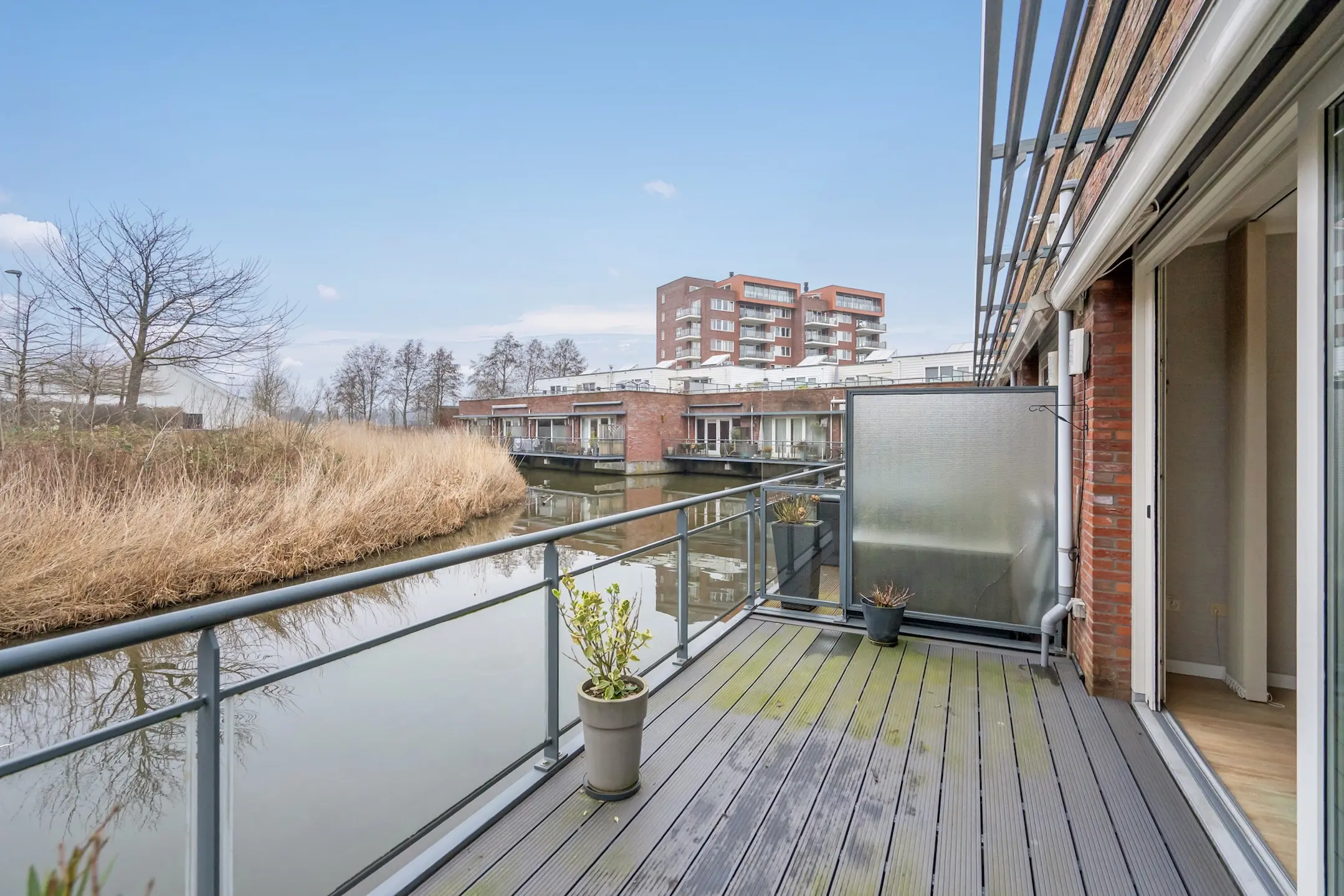 Het terras ca. 5.36x2.23 ligt op het zonnige zuidwesten en is voorzien van een elektrisch bedienbaar zonnescherm. Vanwege de glazen panelen in de balustrade is er direct contact met het aangrenzende water.