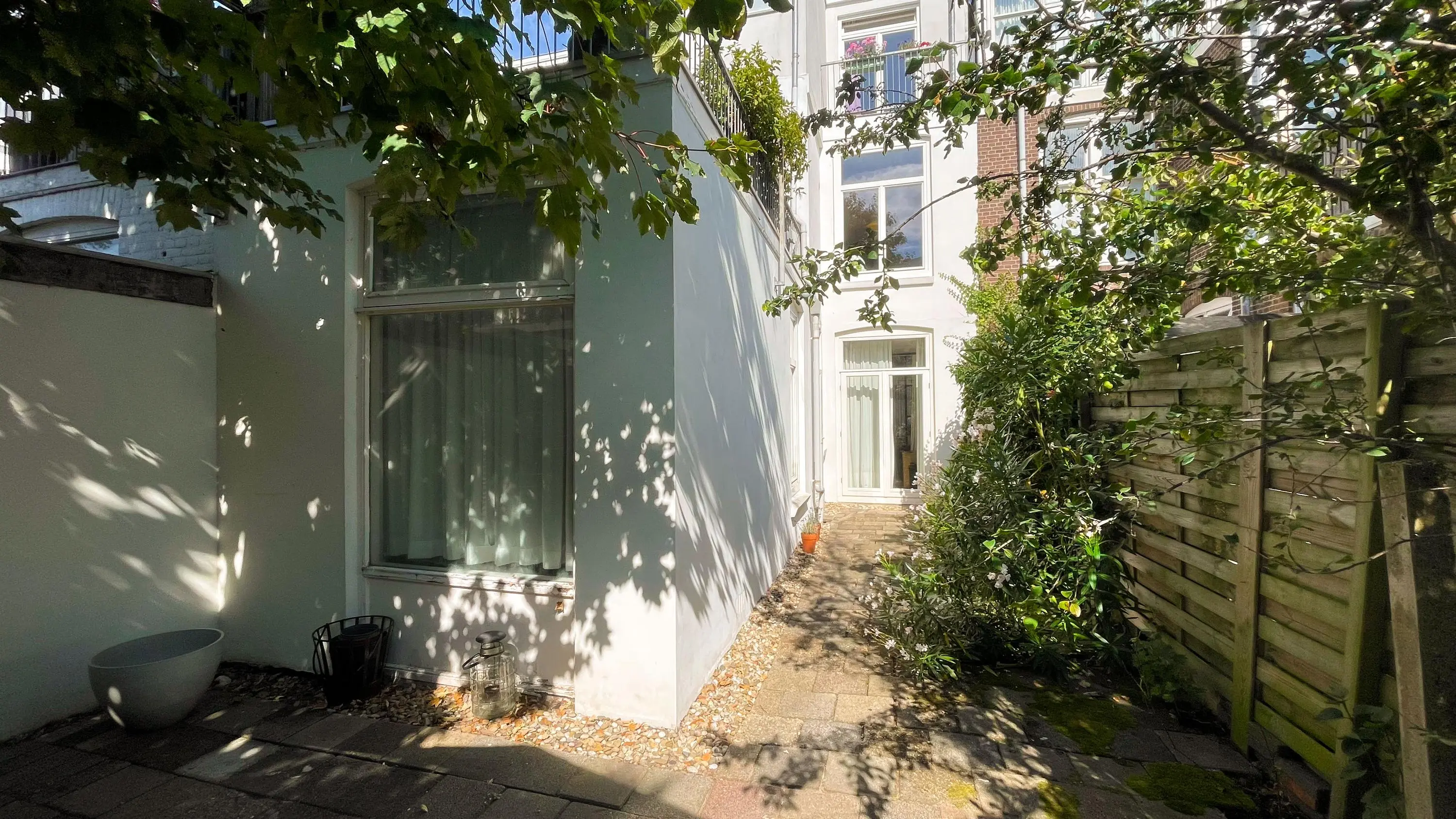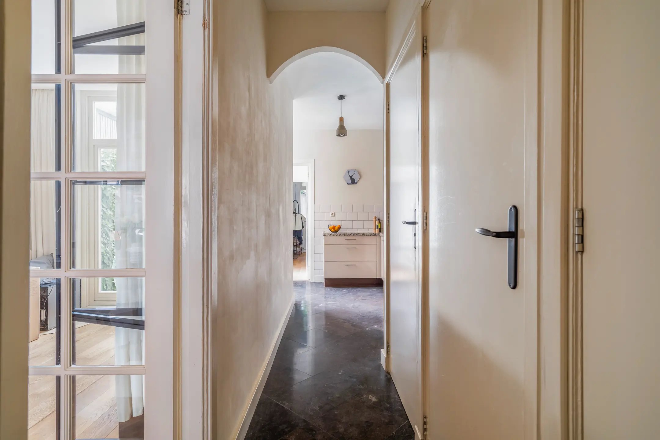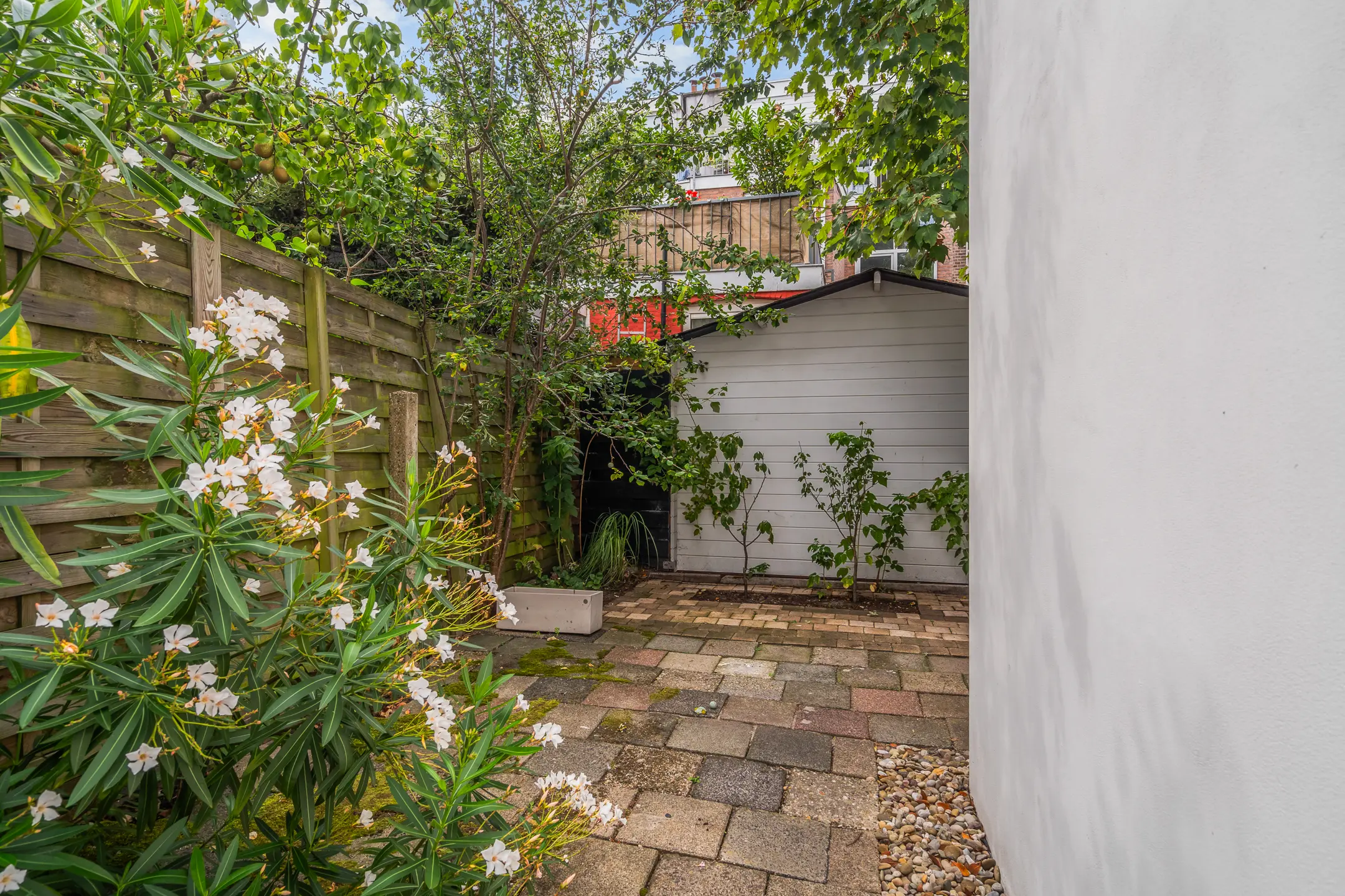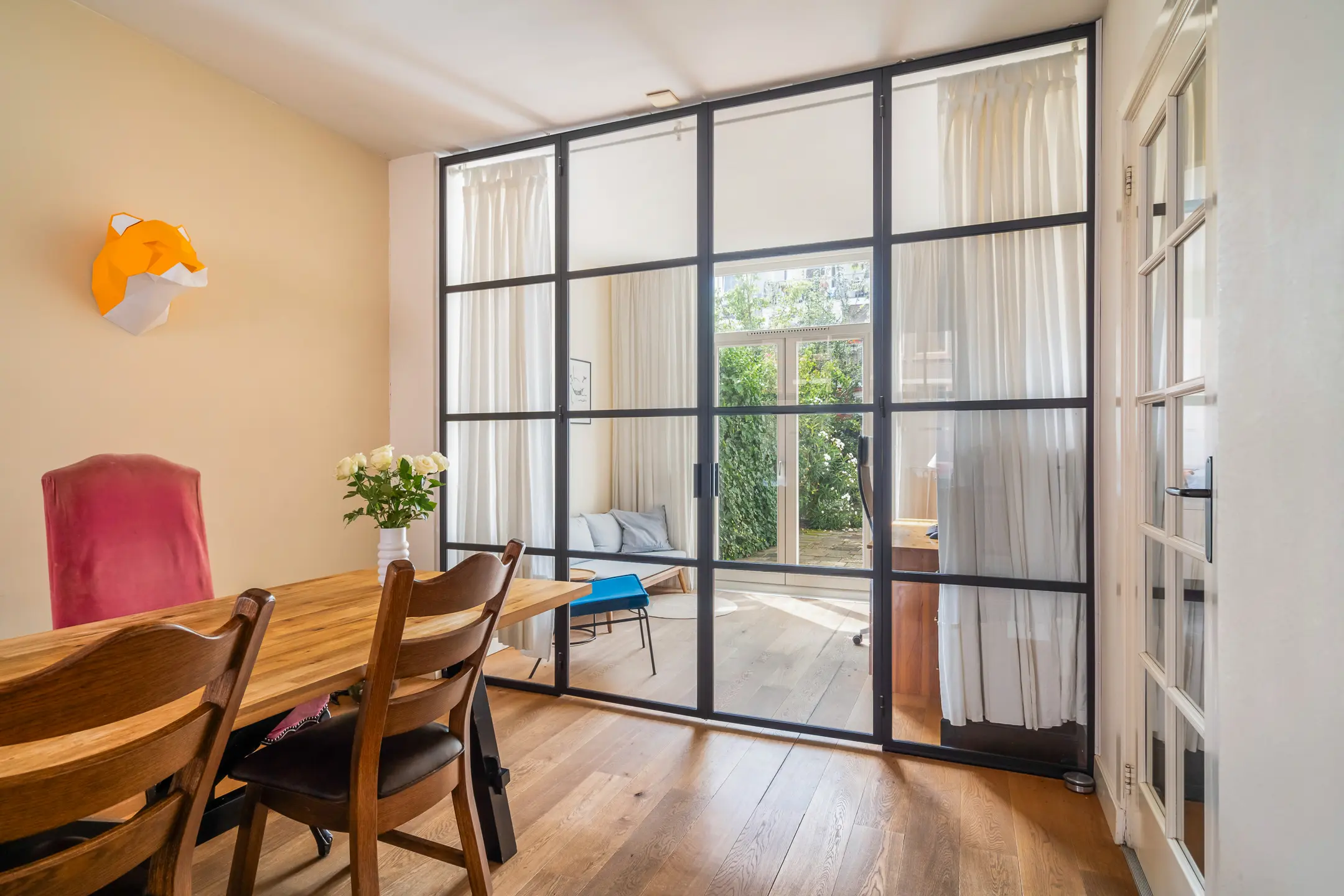 Indeling: entree op de begane grond met mooie voordeur v.v. gietijzeren raaminzet, vestibule, ruime woonkamer met bijgetrokken gang, hoog plafond en eiken houten vloer. Separatie middels een stalen pui met toegang tot de achtergelegen slaap-/werkkamer met dubbele tuindeuren. De woonkamer is mede vanwege de hoge ramen zeer licht. Beschut gelegen zonnige L-vormige achtertuin van ca. 11.00x5.90/2.67. Gang met een diepe vaste kast alwaar de wasmachine en droger staan opgesteld alsmede de cv-combi ketel (2017). Wit betegeld (metrotegels) toilet met wit sanitair, fontein en mechanische ventilatie. Royale keuken met L-vormige keukenopstelling, natuurstenen werkblad. Inbouw koelkast-vriezer, vaatwasser, combi-oven en magnetron. Tuindeur. De vloer is voorzien van Belgisch hardsteen.