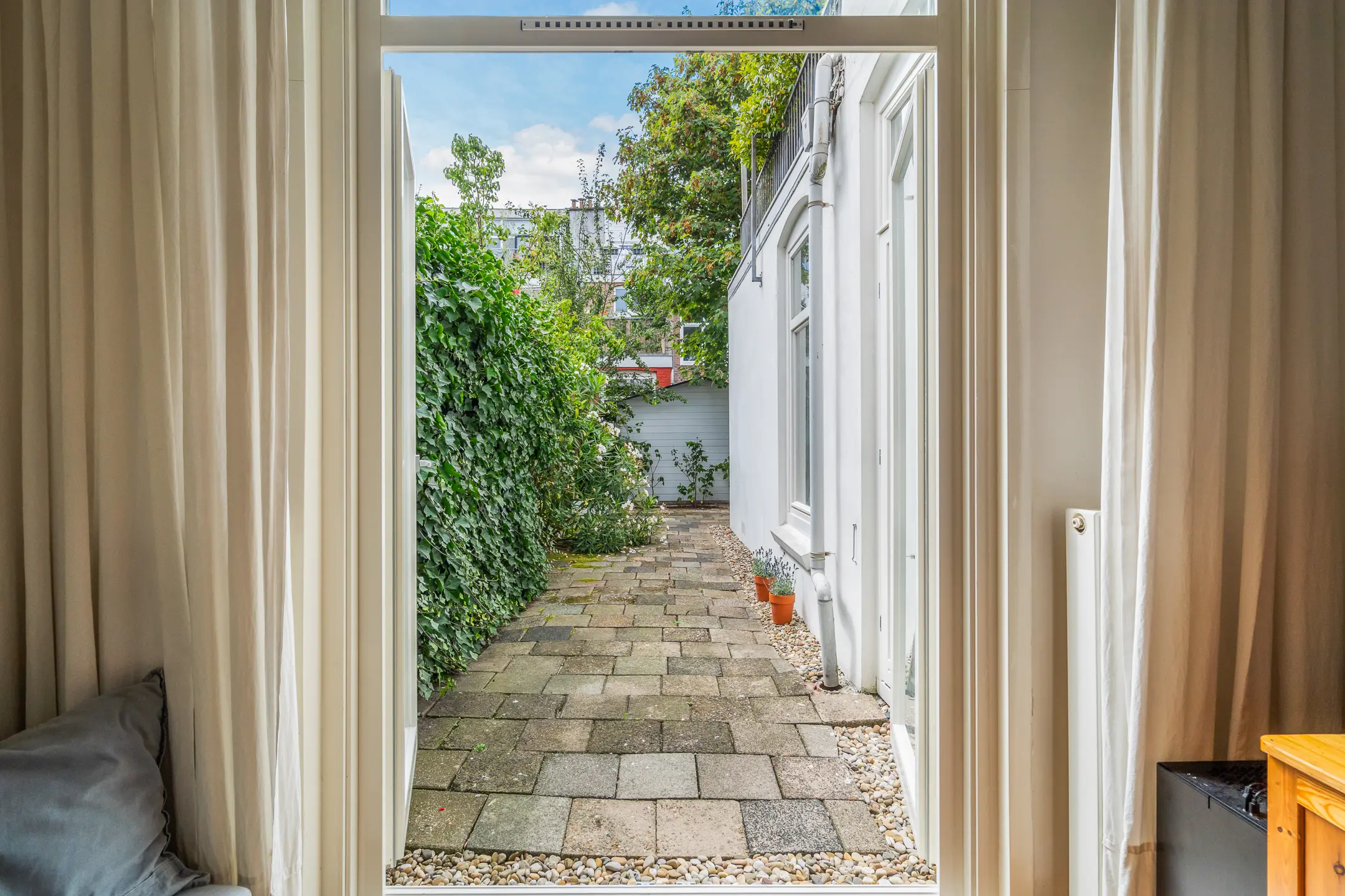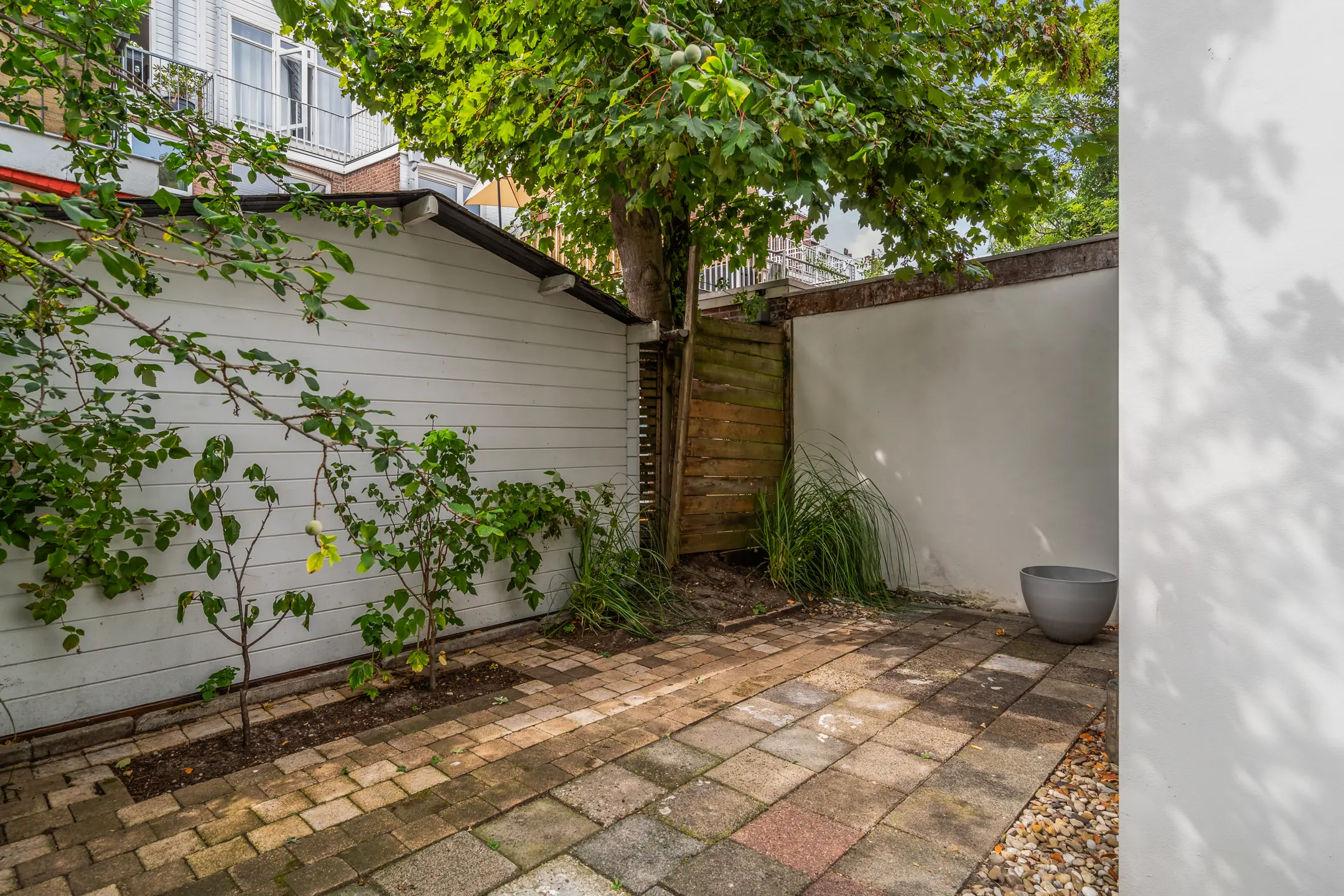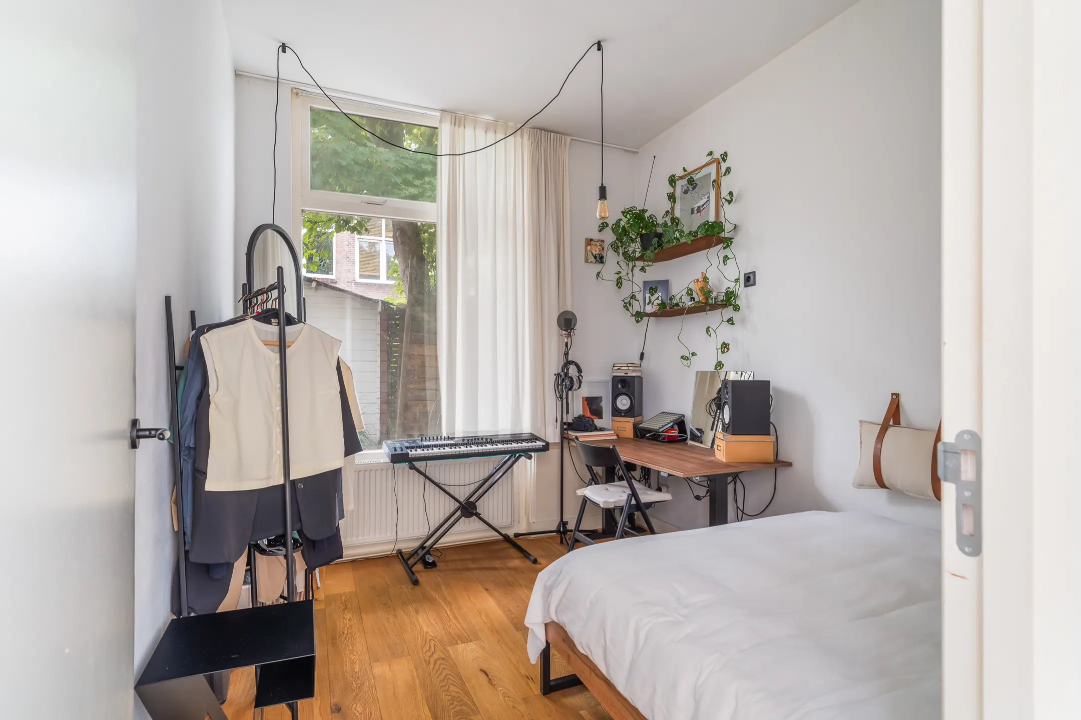 Indeling: entree op de begane grond met mooie voordeur v.v. gietijzeren raaminzet, vestibule, ruime woonkamer met bijgetrokken gang, hoog plafond en eiken houten vloer. Separatie middels een stalen pui met toegang tot de achtergelegen slaap-/werkkamer met dubbele tuindeuren. De woonkamer is mede vanwege de hoge ramen zeer licht. Beschut gelegen zonnige L-vormige achtertuin van ca. 11.00x5.90/2.67. Gang met een diepe vaste kast alwaar de wasmachine en droger staan opgesteld alsmede de cv-combi ketel (2017). Wit betegeld (metrotegels) toilet met wit sanitair, fontein en mechanische ventilatie. Royale keuken met L-vormige keukenopstelling, natuurstenen werkblad. Inbouw koelkast-vriezer, vaatwasser, combi-oven en magnetron. Tuindeur. De vloer is voorzien van Belgisch hardsteen.