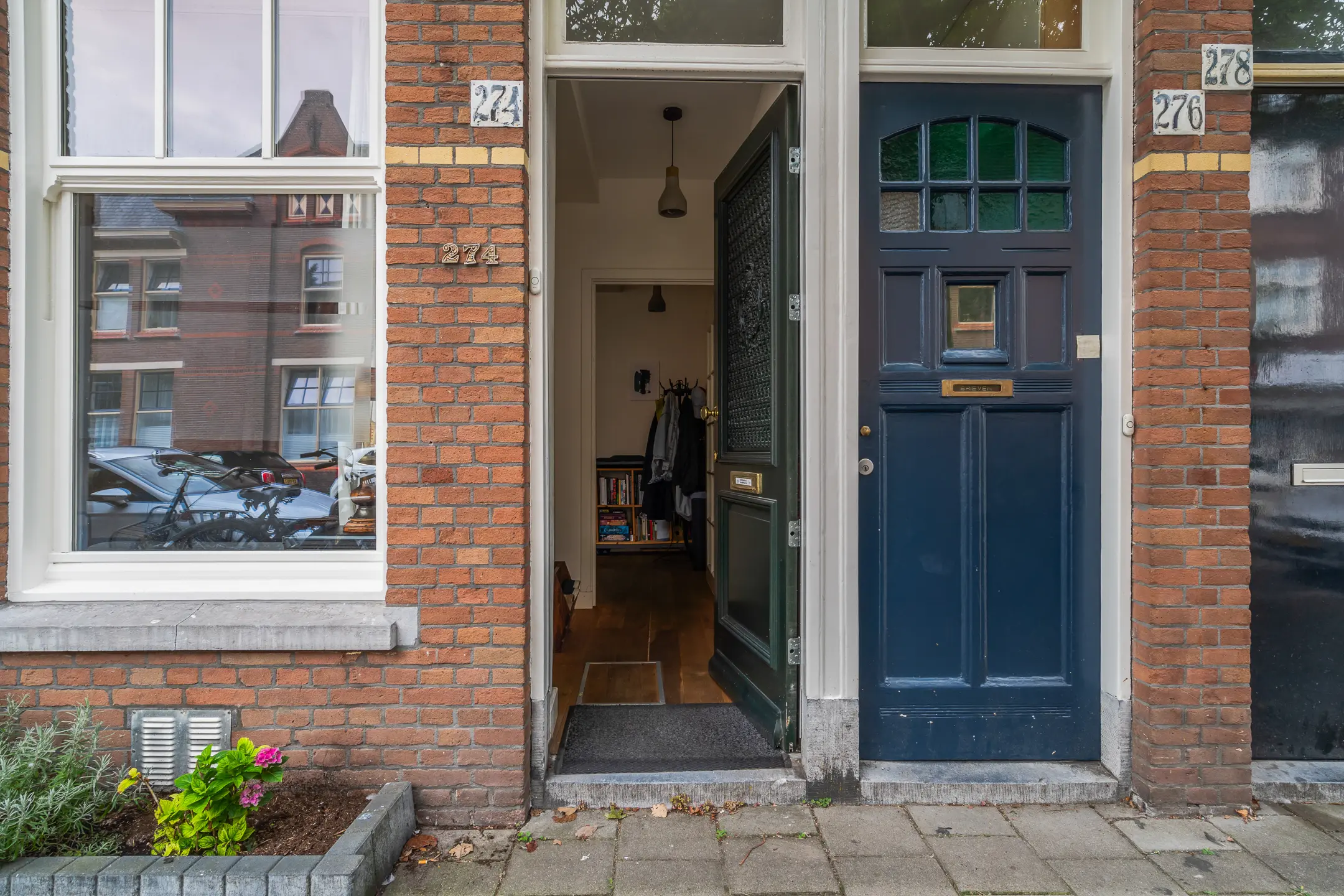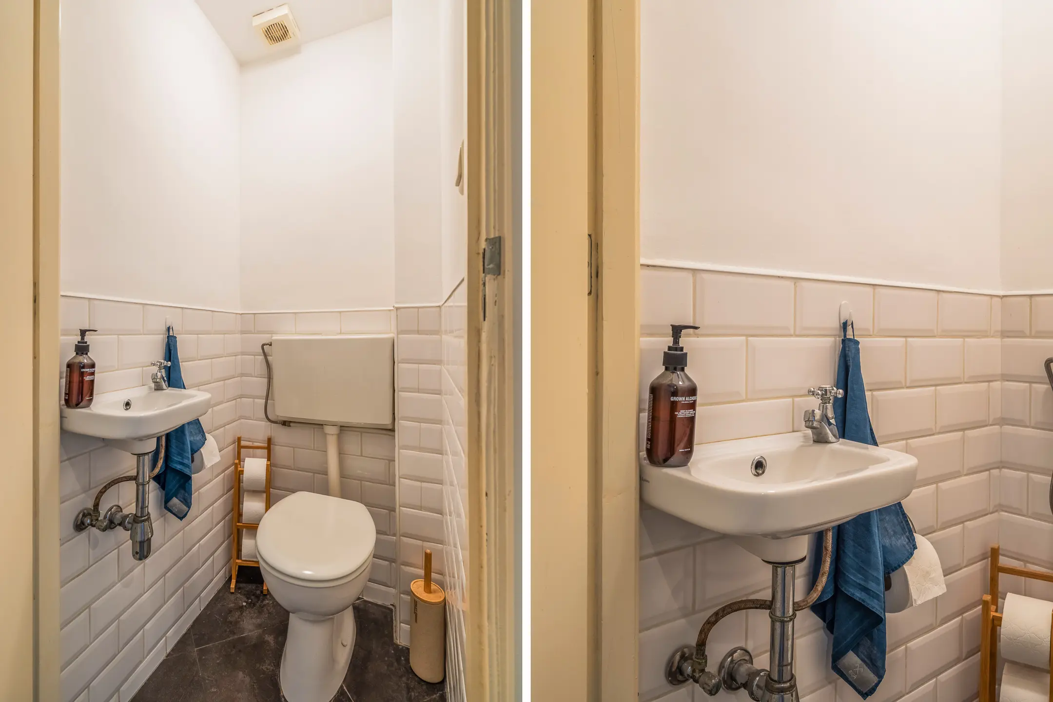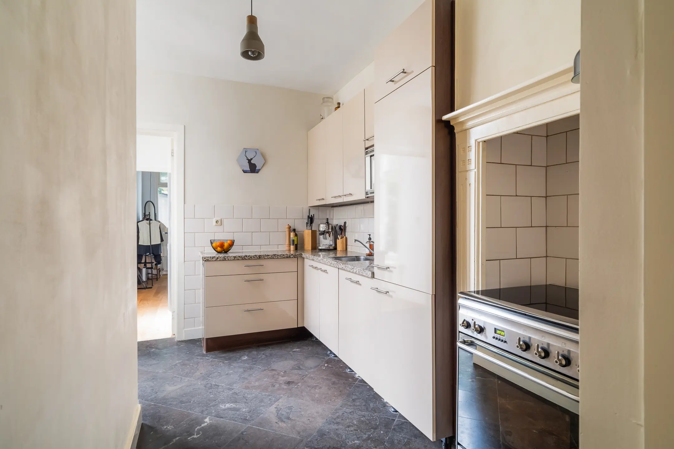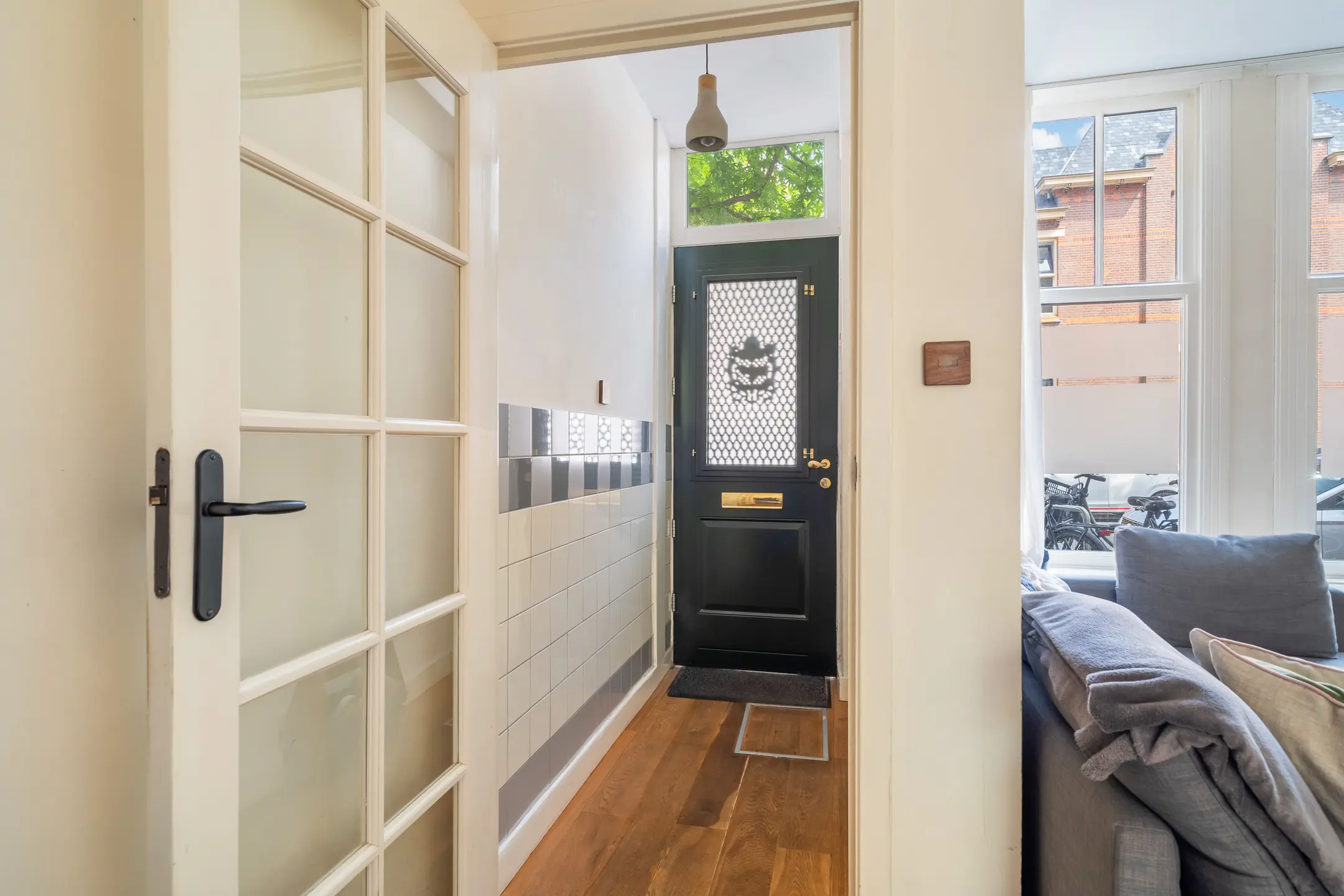 Indeling: entree op de begane grond met mooie voordeur v.v. gietijzeren raaminzet, vestibule, ruime woonkamer met bijgetrokken gang, hoog plafond en eiken houten vloer. Separatie middels een stalen pui met toegang tot de achtergelegen slaap-/werkkamer met dubbele tuindeuren. De woonkamer is mede vanwege de hoge ramen zeer licht. Beschut gelegen zonnige L-vormige achtertuin van ca. 11.00x5.90/2.67. Gang met een diepe vaste kast alwaar de wasmachine en droger staan opgesteld alsmede de cv-combi ketel (2017). Wit betegeld (metrotegels) toilet met wit sanitair, fontein en mechanische ventilatie. Royale keuken met L-vormige keukenopstelling, natuurstenen werkblad. Inbouw koelkast-vriezer, vaatwasser, combi-oven en magnetron. Tuindeur. De vloer is voorzien van Belgisch hardsteen.