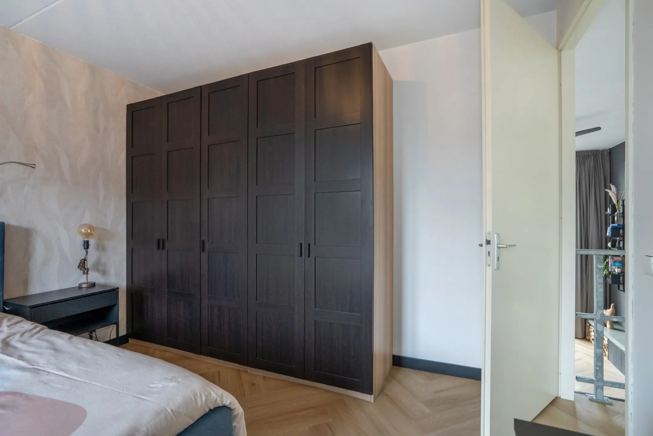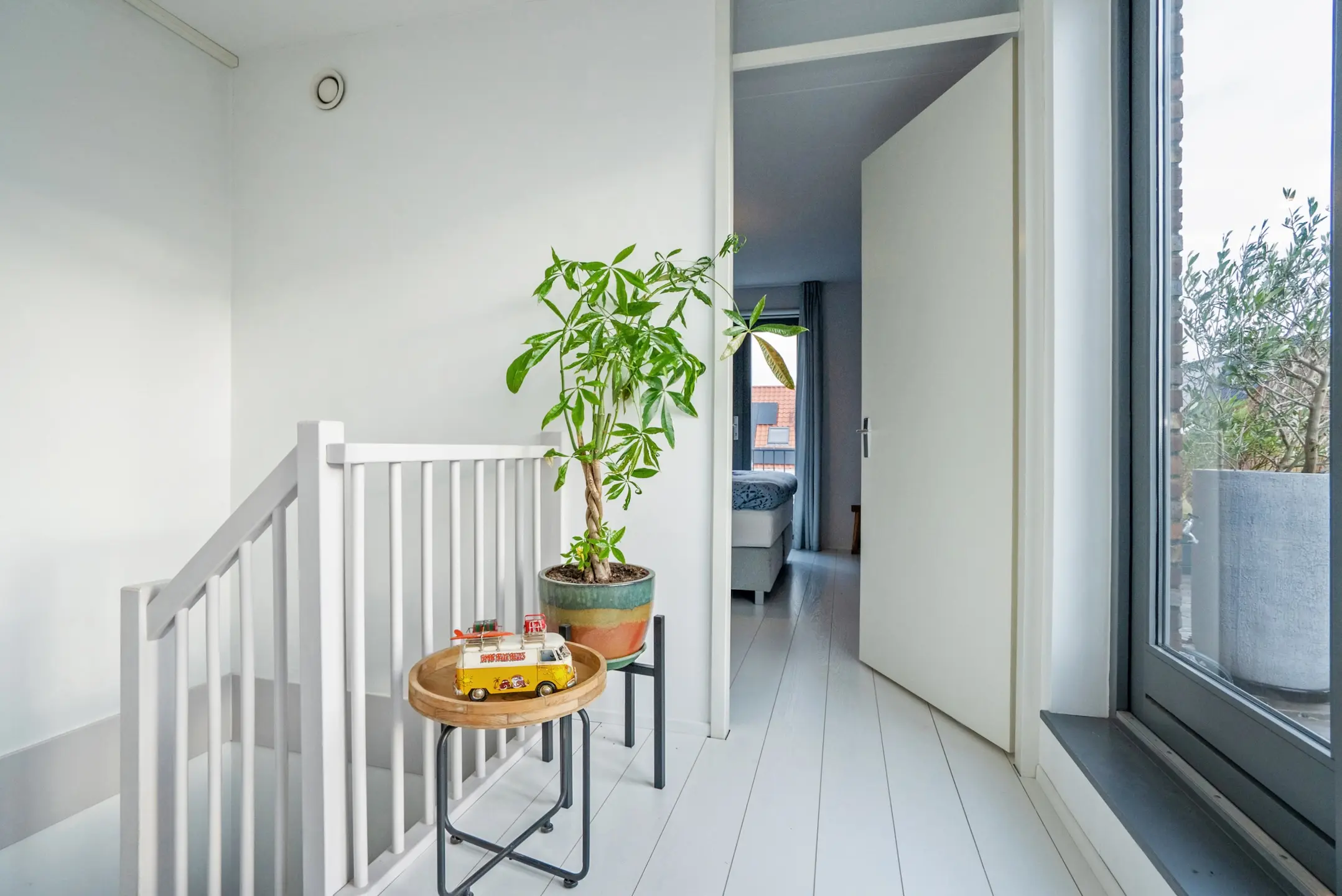 2e verdieping: via de overloop toegang tot het riante zonnige dakterras (werkelijk de gehele dag zon) met veel privacy en weids uitzicht, voorgelegen slaapkamer met Frans balkon en 5e slaapkamer aan de achterzijde. De gehele verdieping is voorzien van een mooie vloer.